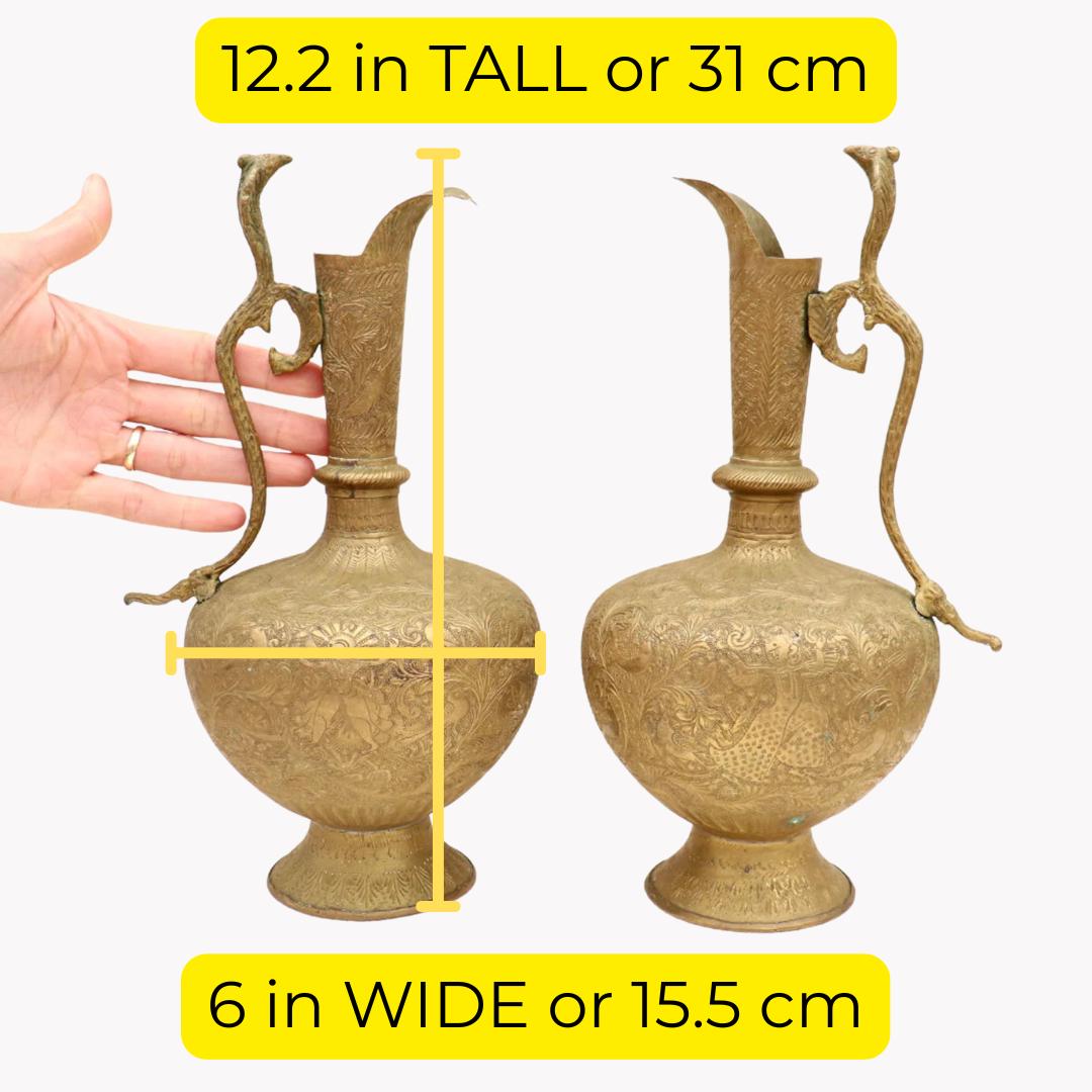 Large Pair Of Antique Indian Brass Vases With Cobra Handles And Hand-Engraved Decoration