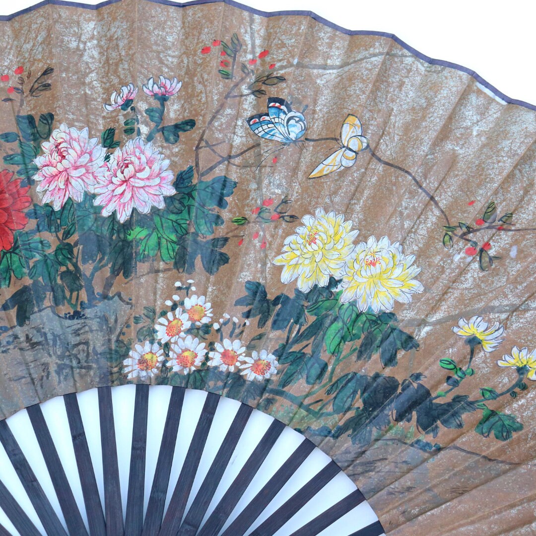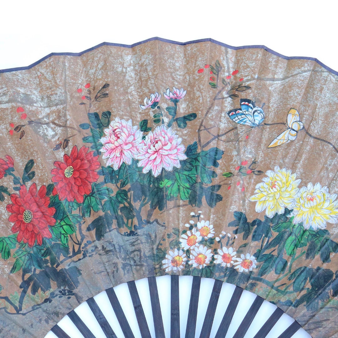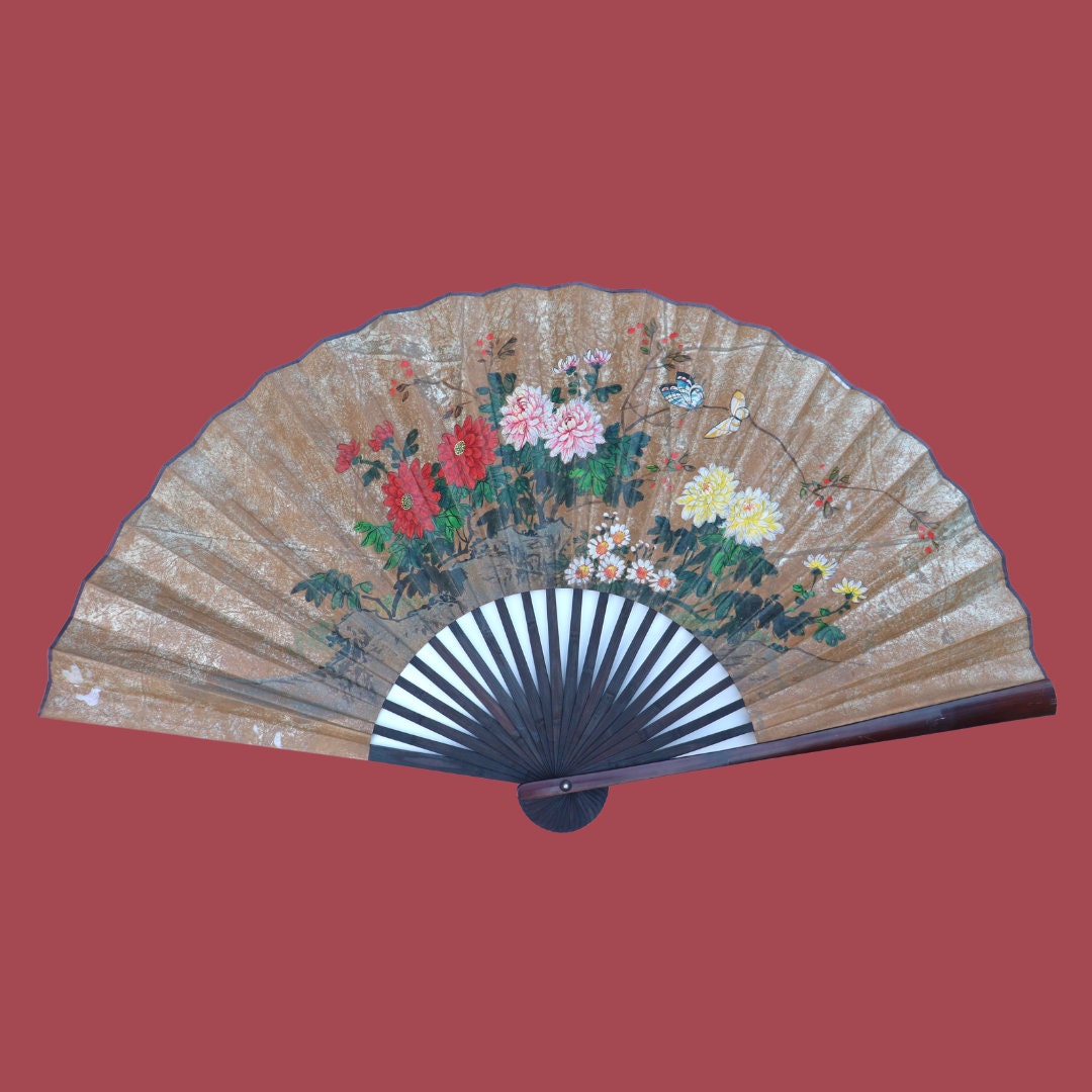 THIS IS A MID CENTURY CHINESE LARGE HAND-PAINTED DECORATIVE WALL FAN DEPICTING BEAUTIFUL FLOWERS AND BUTTERFLIES.