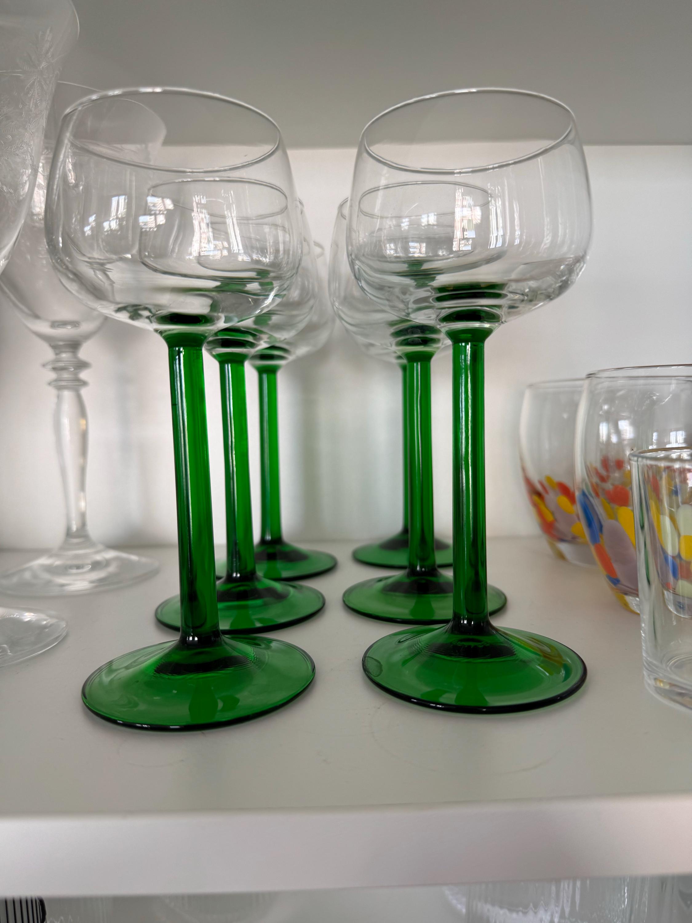 Mid Century Set of 6 Luminarc small wine glasses with green stem, French White Wine Glasses