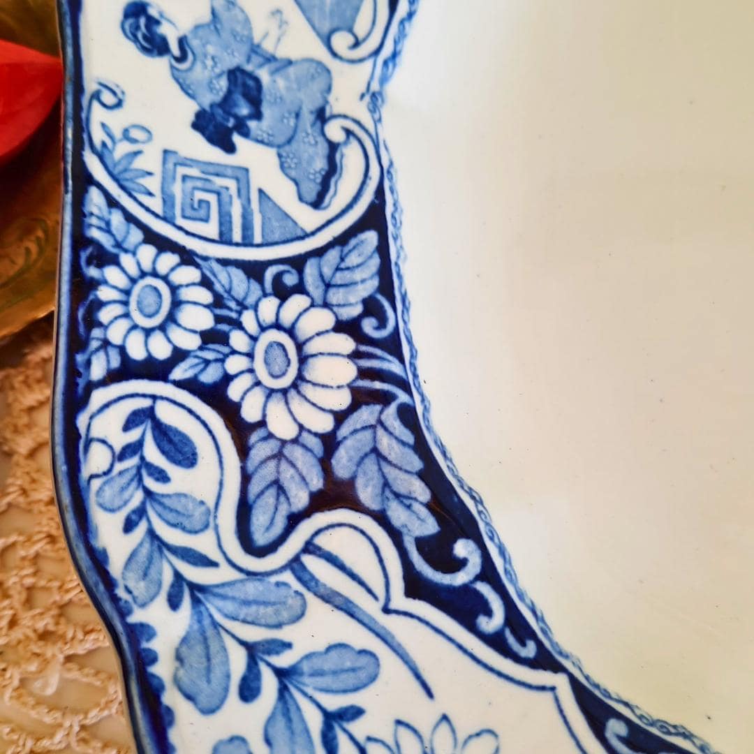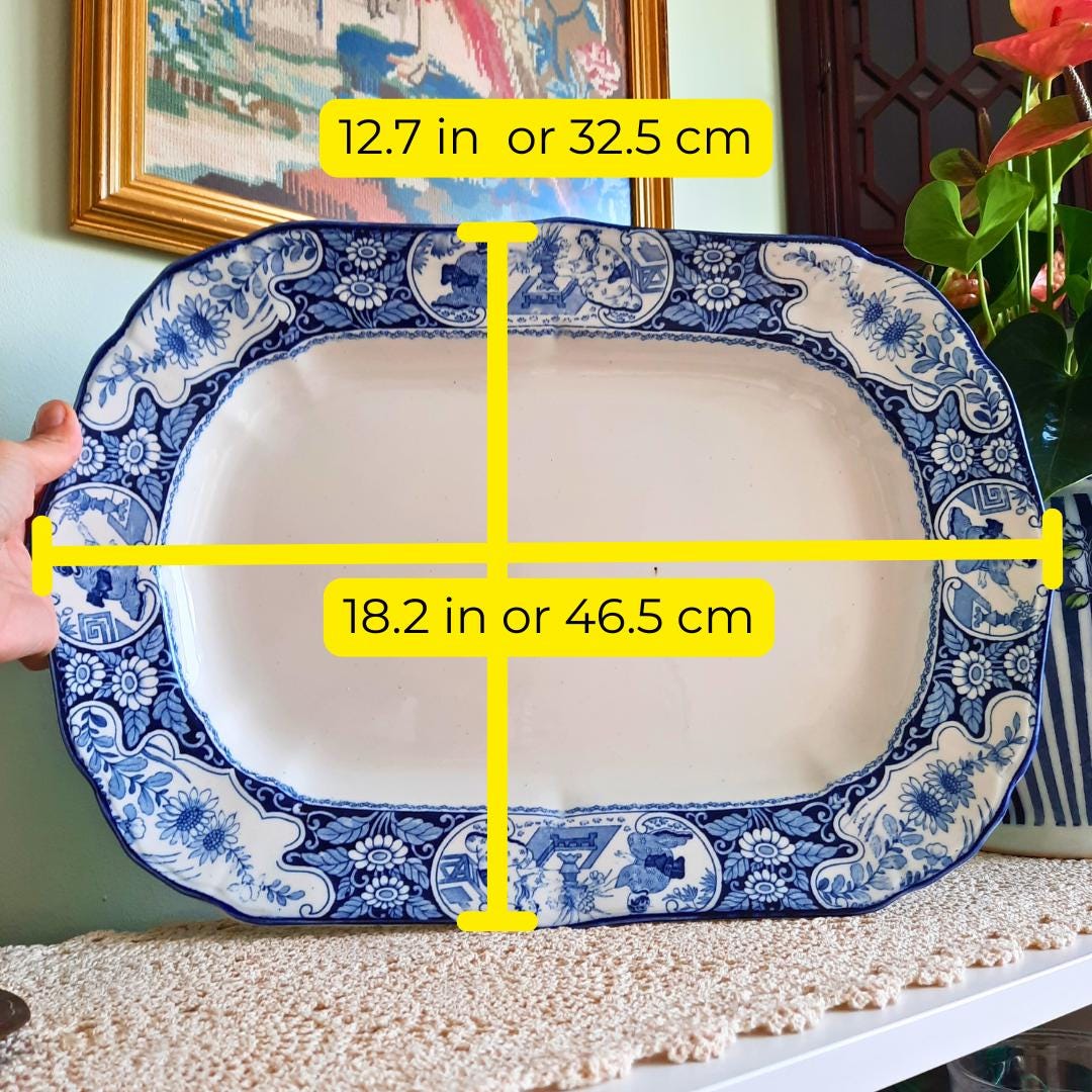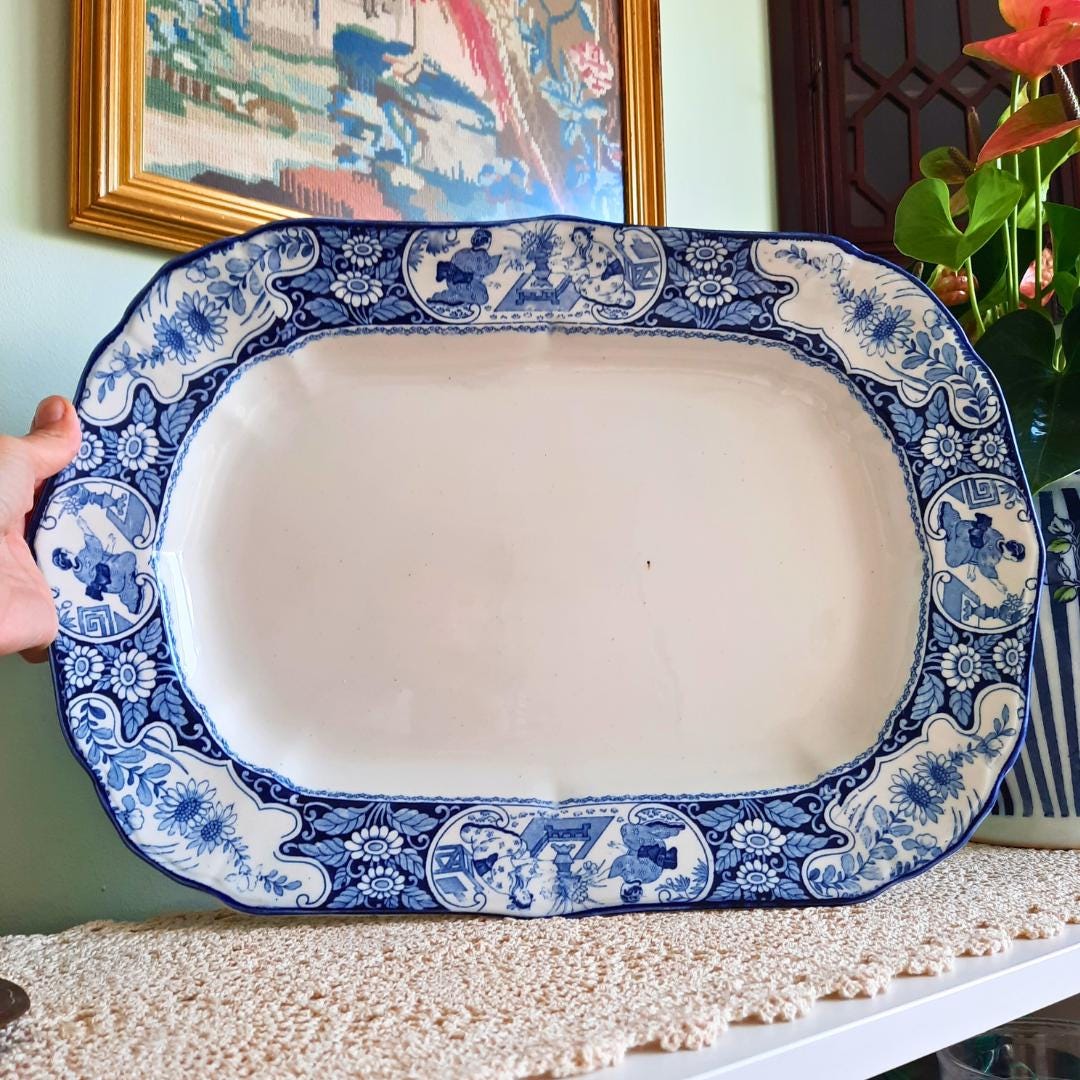 Beautiful over 100 years old transferware meat platter by Woods and Sons. The pattern depicts various Japanese scenes like Geishas serving tea or making offerings with a floral theme throughout.