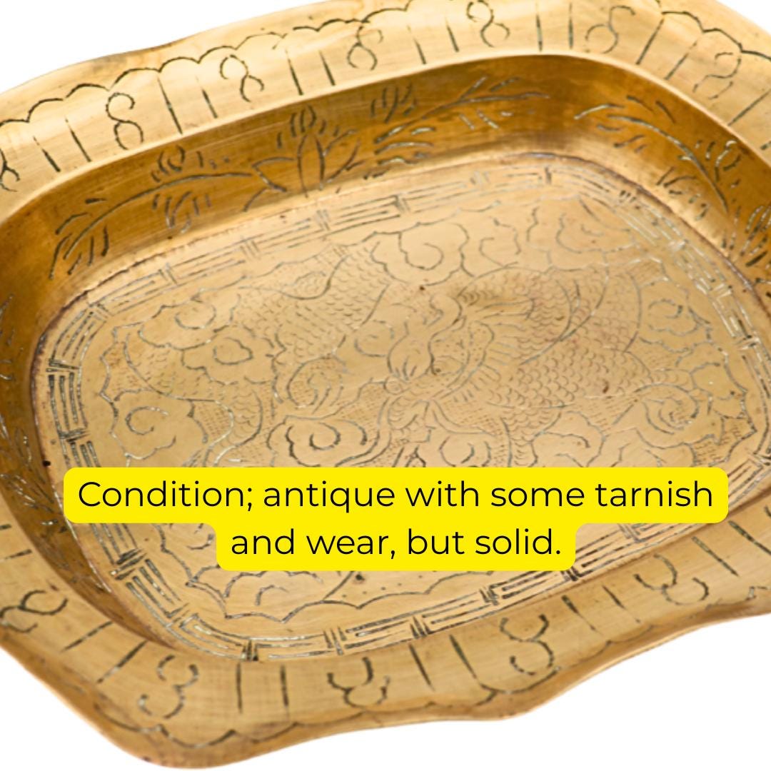 Mid Century Chinese Brass Dragon Bowl Rectangular Footed And Ruffled Edge