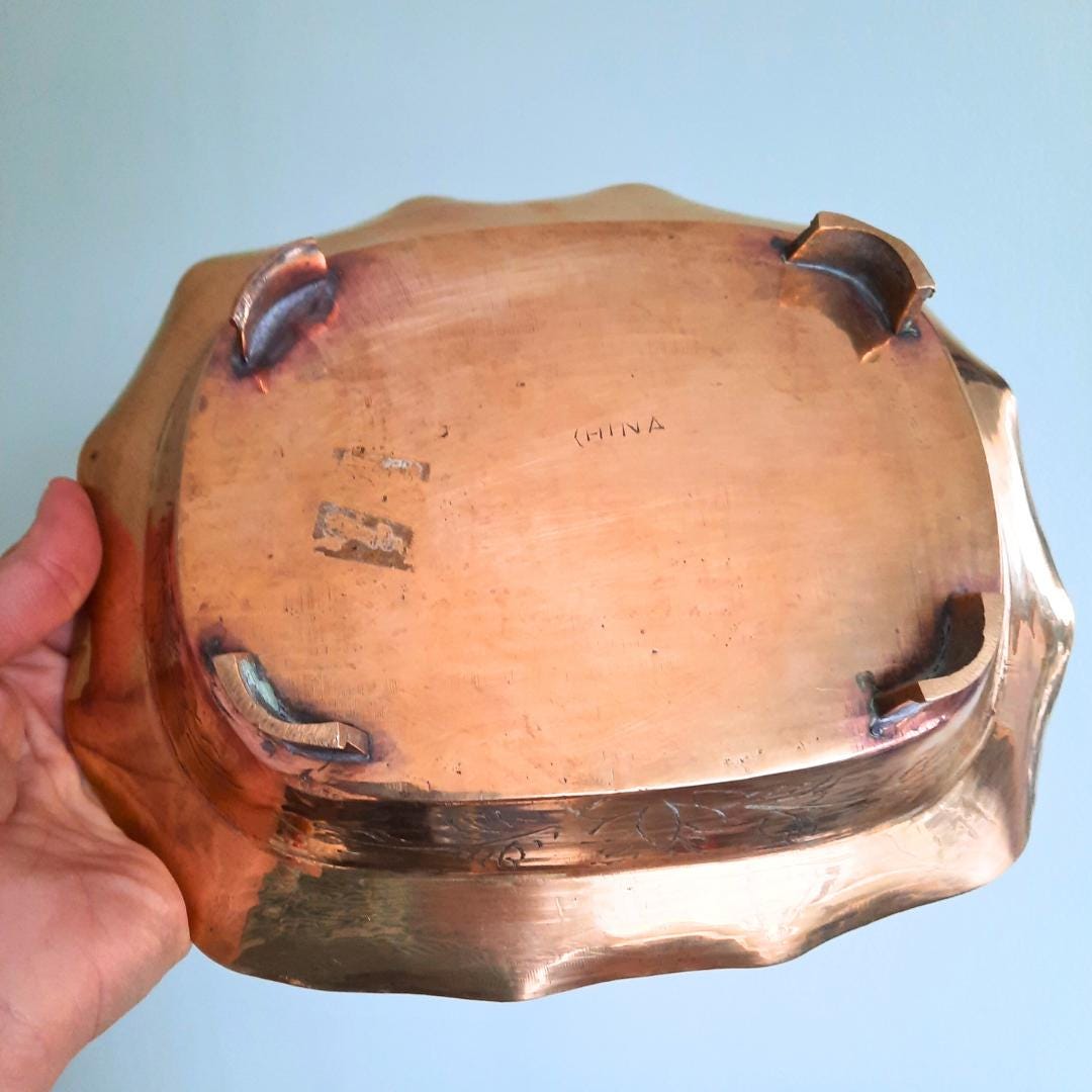 Mid Century Chinese Brass Dragon Bowl Rectangular And Ruffled Edge.
