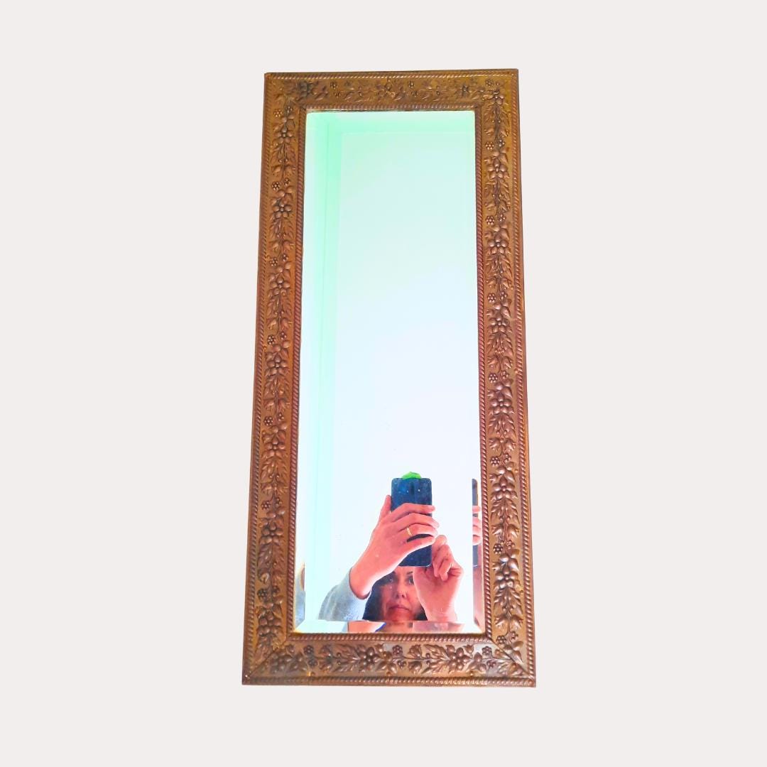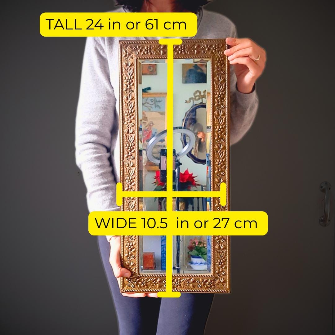 Vintage Long Rectangular Embossed Brass Bevelled Edge Mirror Repousse Floral Decoration C 1940's.