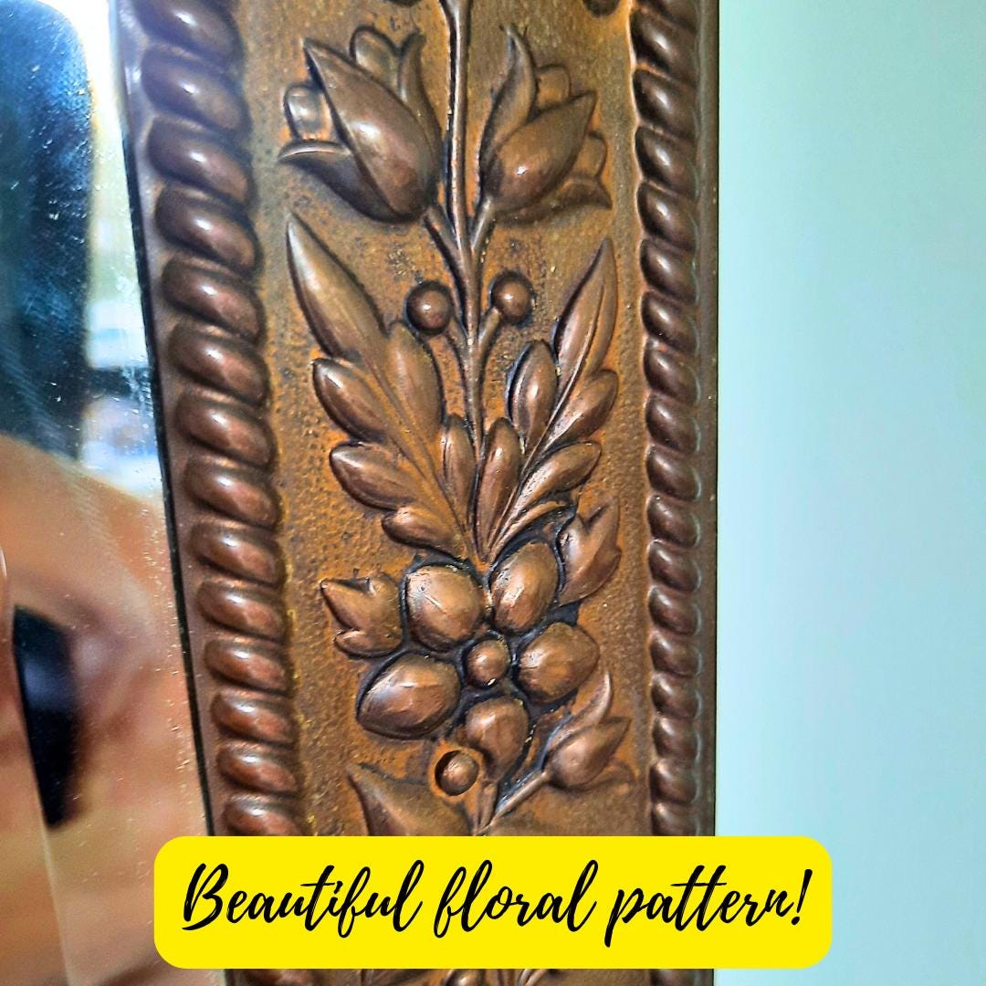 Beautiful embossed brass wall mirror with floral decoration and bevelled edge that will look fantastic on a hall, a wall gallery, or any other corner of your home. British, circa 1940's. Super charming, get it before its gone!