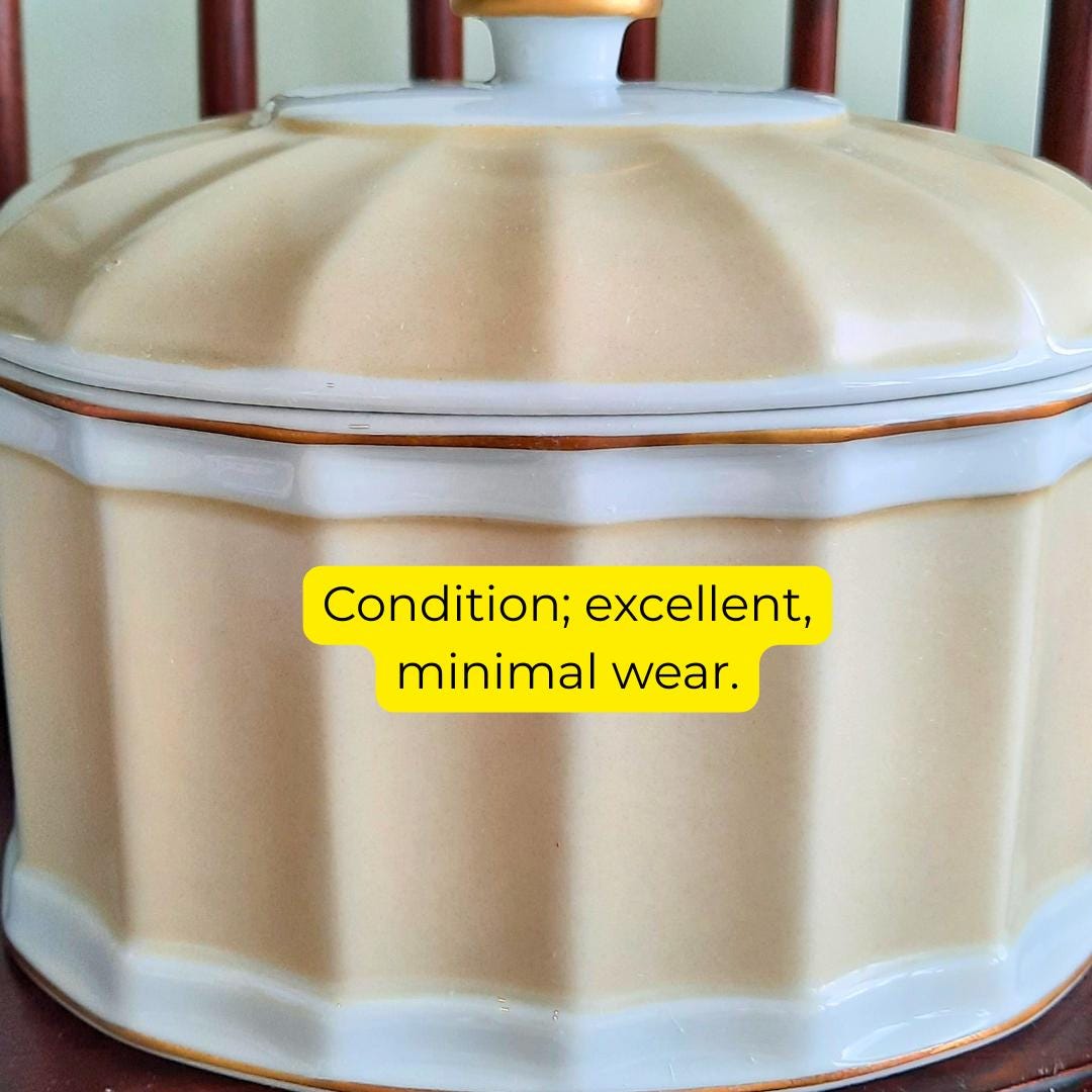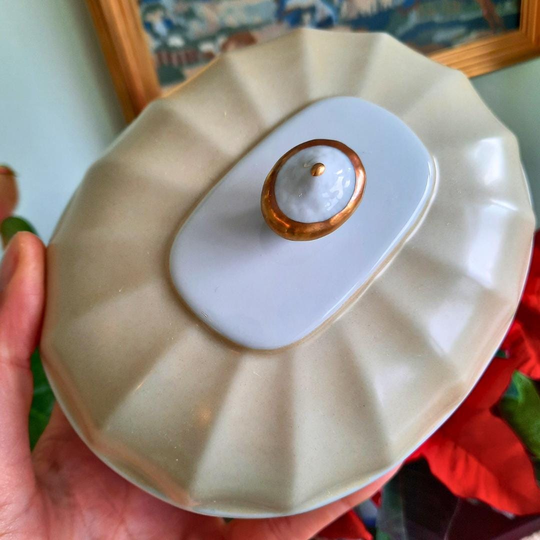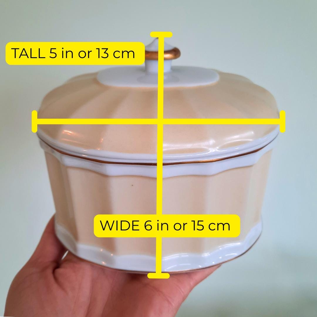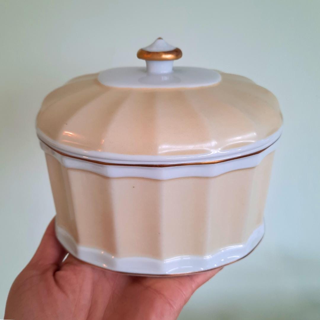Vista Alegre Mottahedeh Portugal Oval Shape Neoclassical Style Lidded Box With Golden Rim Champagne Tone.