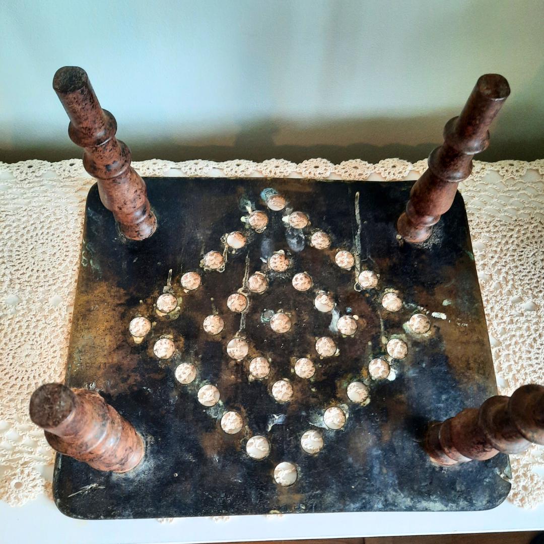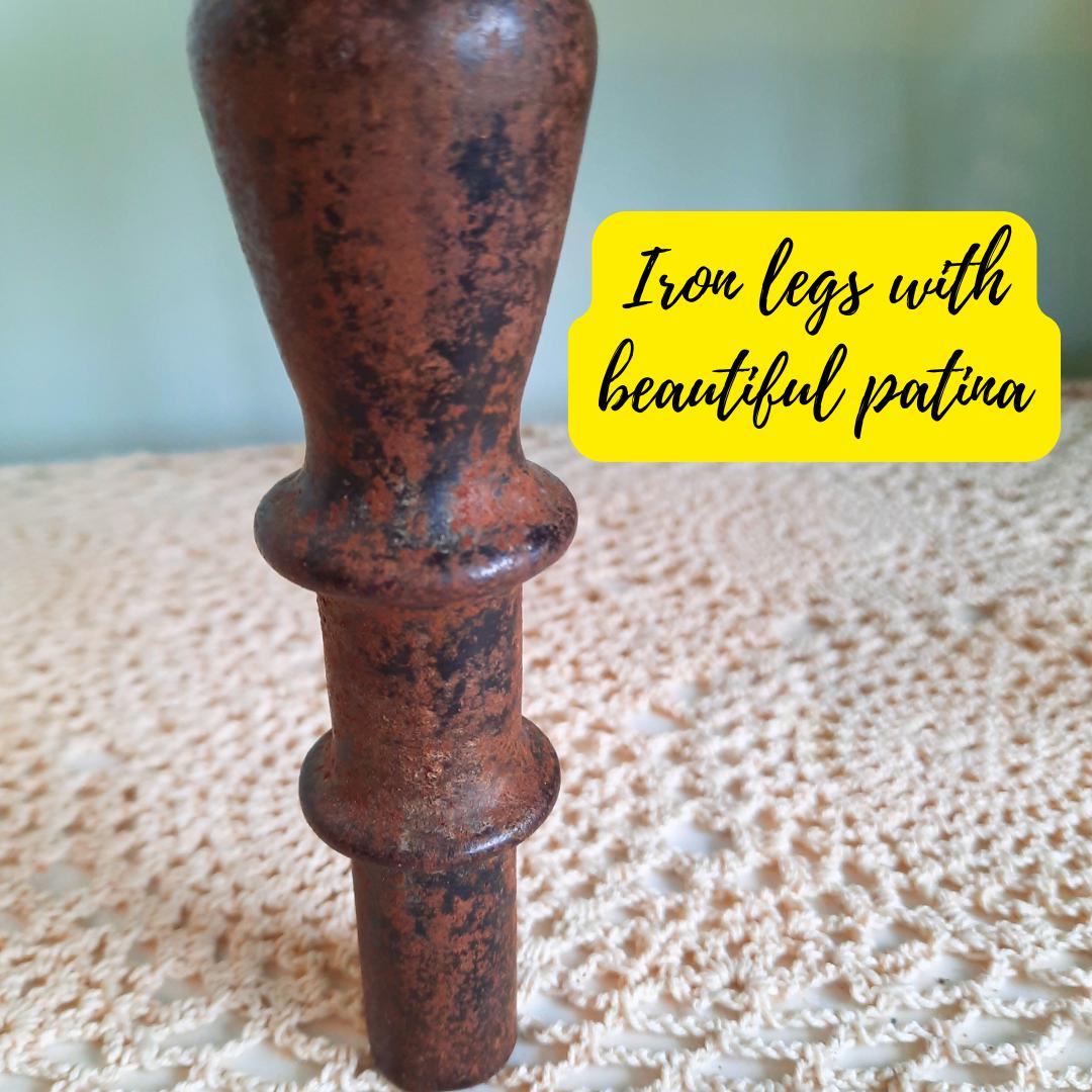Solidly made; this wonderful footstool is perfect to display plants, books or to rest your feet by the fireplace as originally intended. Beautiful patina on the cast iron legs.