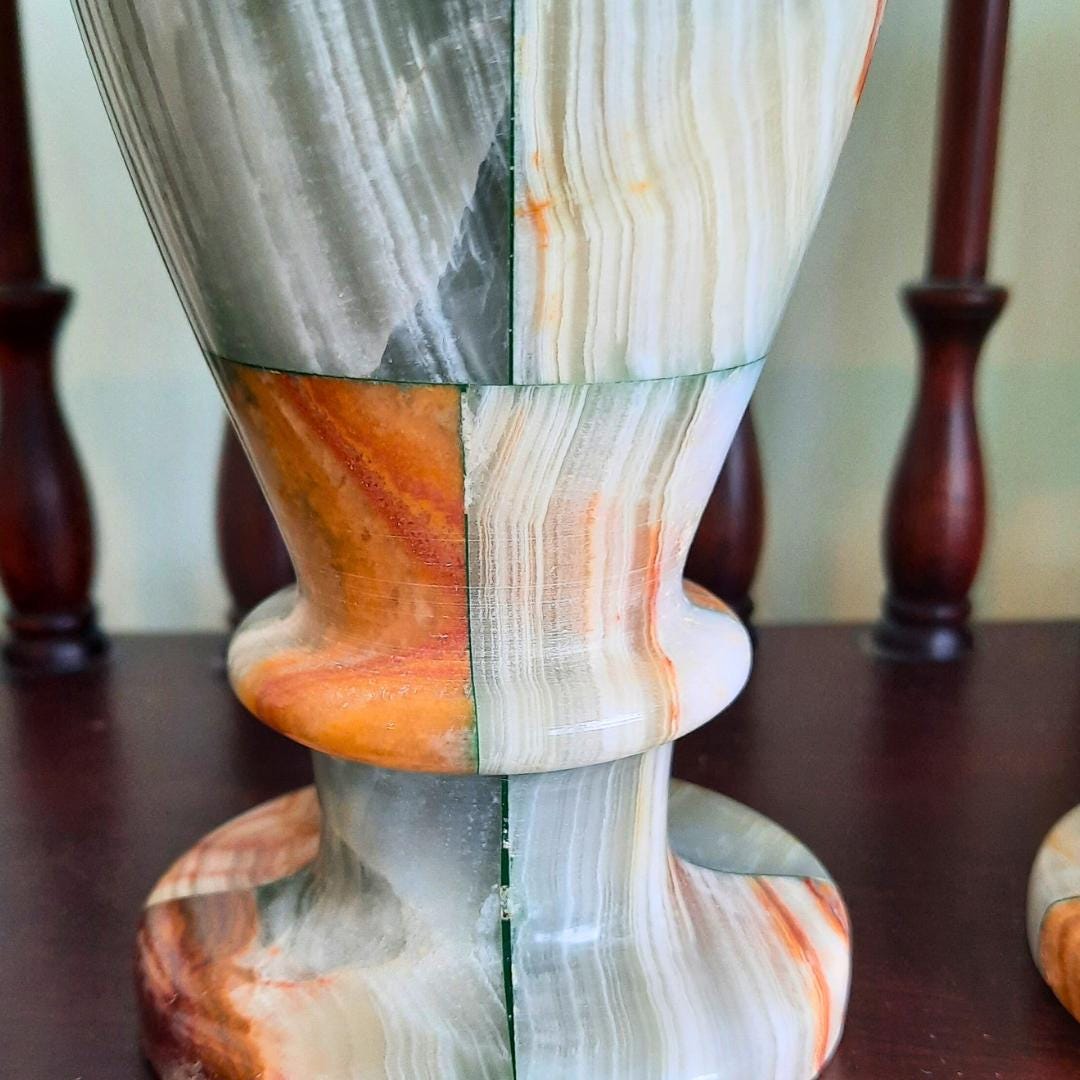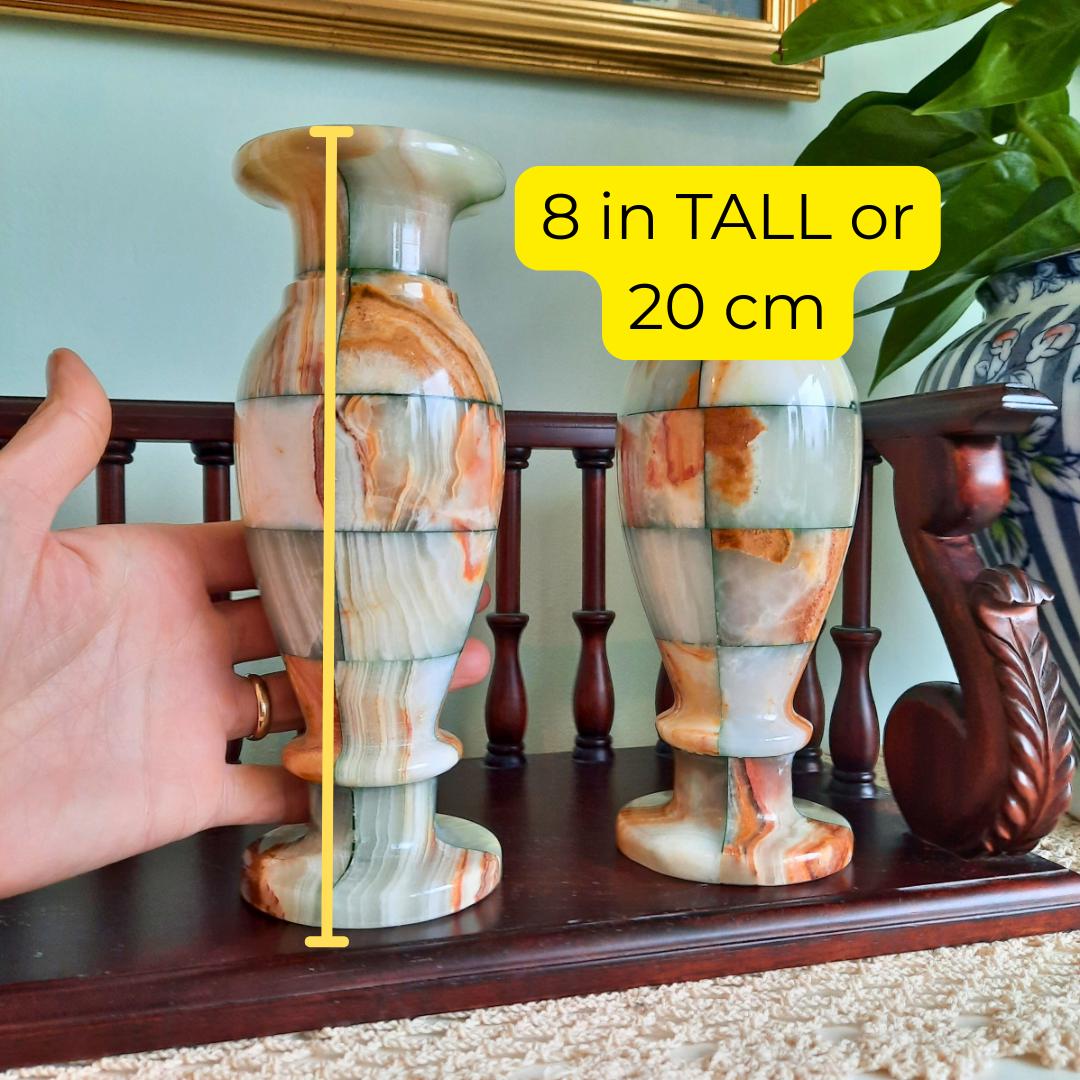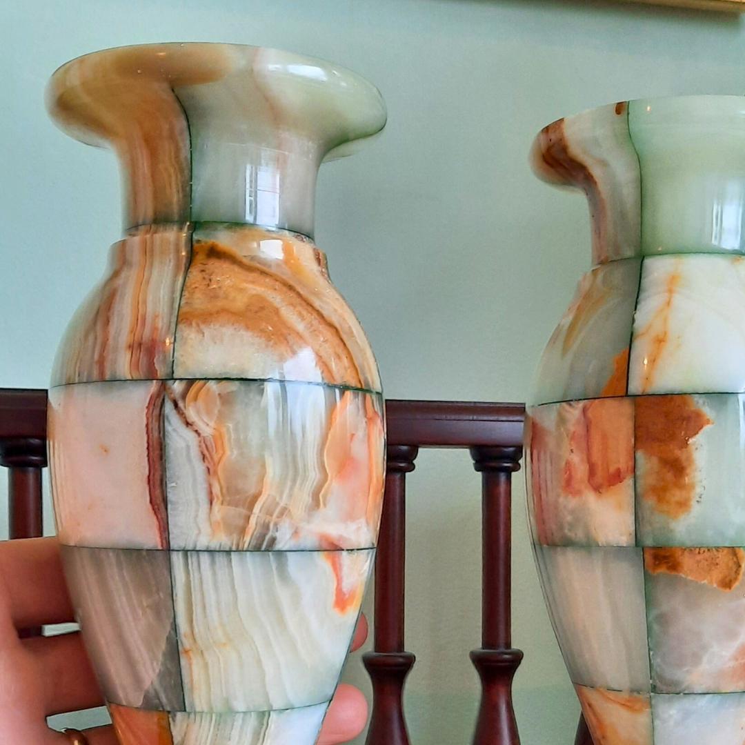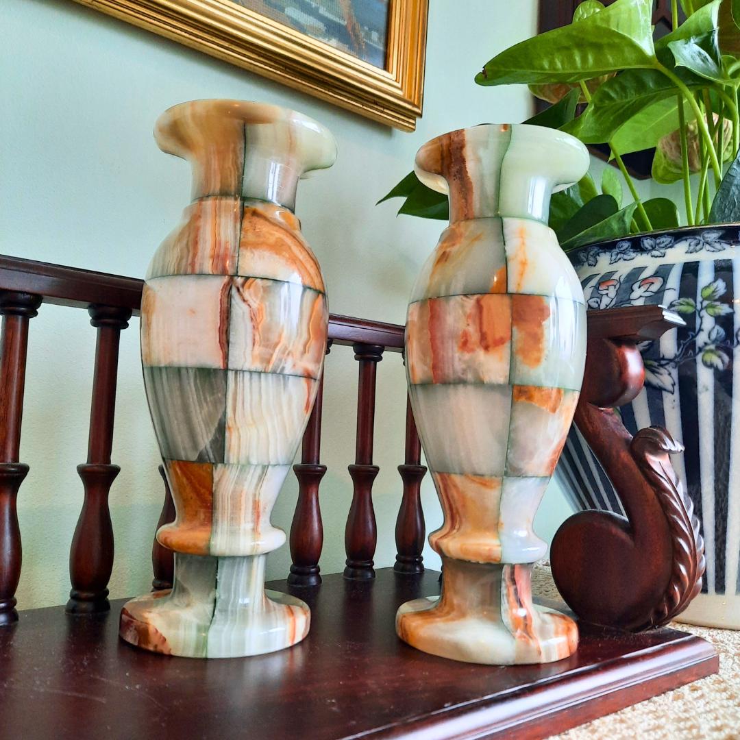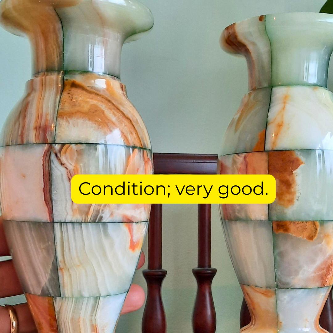 Stunning and rare to come by a pair of these beautiful pair of onix vases in such good condition, they will look amazing in any quality interior. Also these will make a fab gift for the home that will be treasured forever!