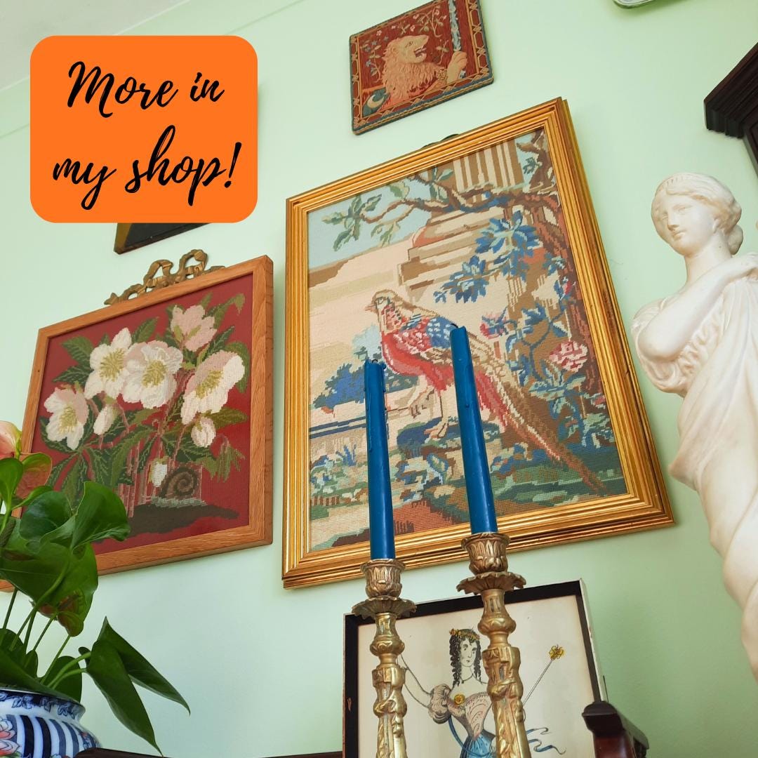 Gorgeous needle point by Elizabeth Bradley framed in a quality oak wooden frame, that will make a wonderful statement in your home. Perfect for your gallery wall! I'm tempted to keep this one, I love it!