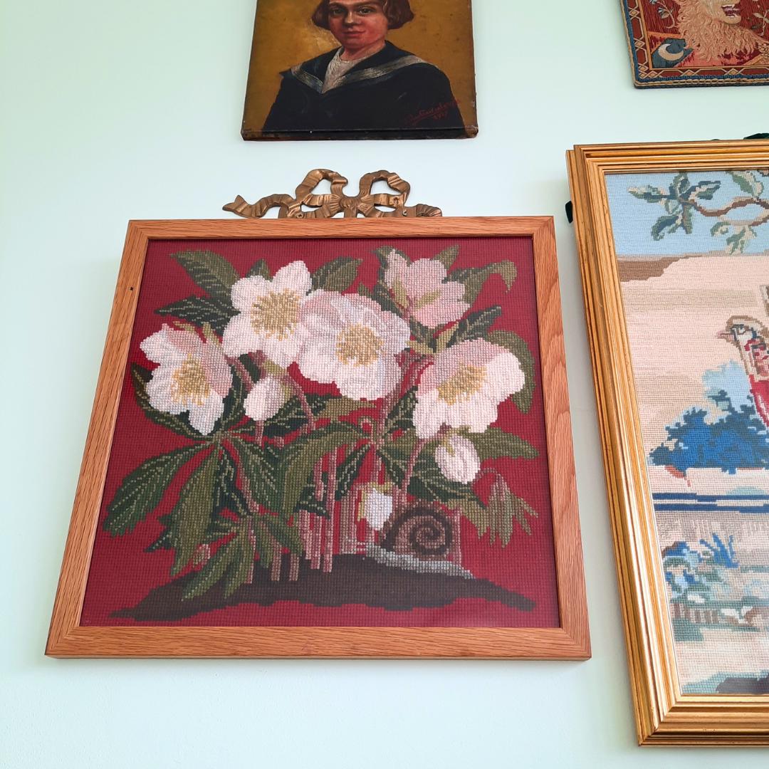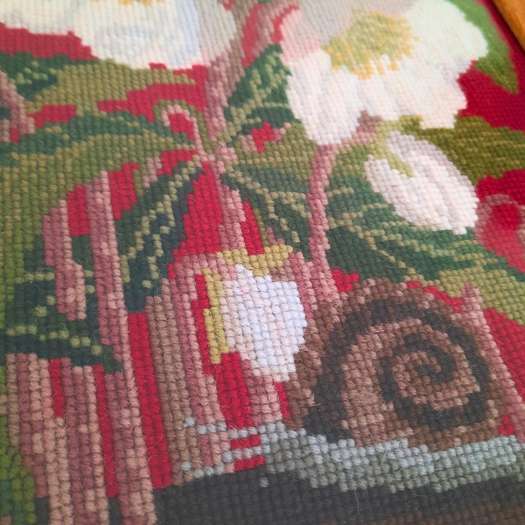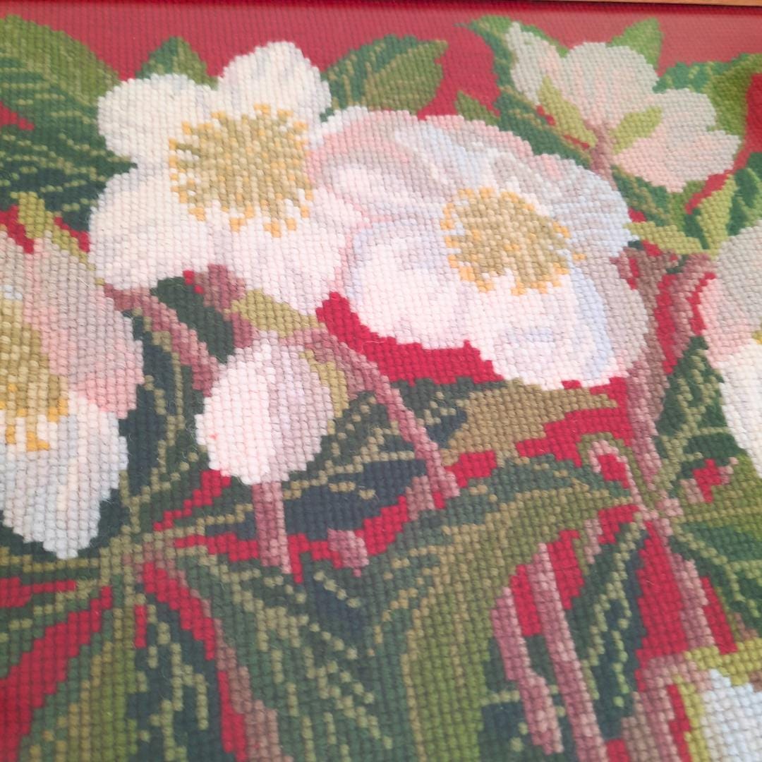 Elizabeth Bradley Tapestry Kits are assembled in Wales, with wool sourced from Australia and spun and dyed in the north of England. The kits sell for a lot of money and this one is ready to hang and beautifully framed.