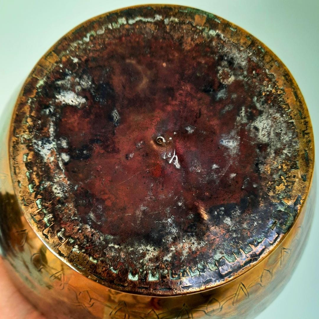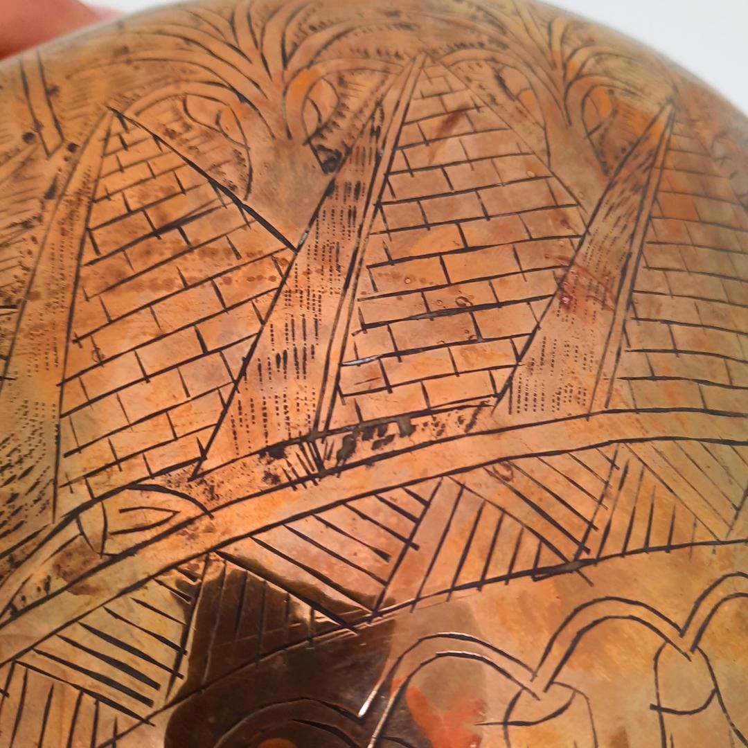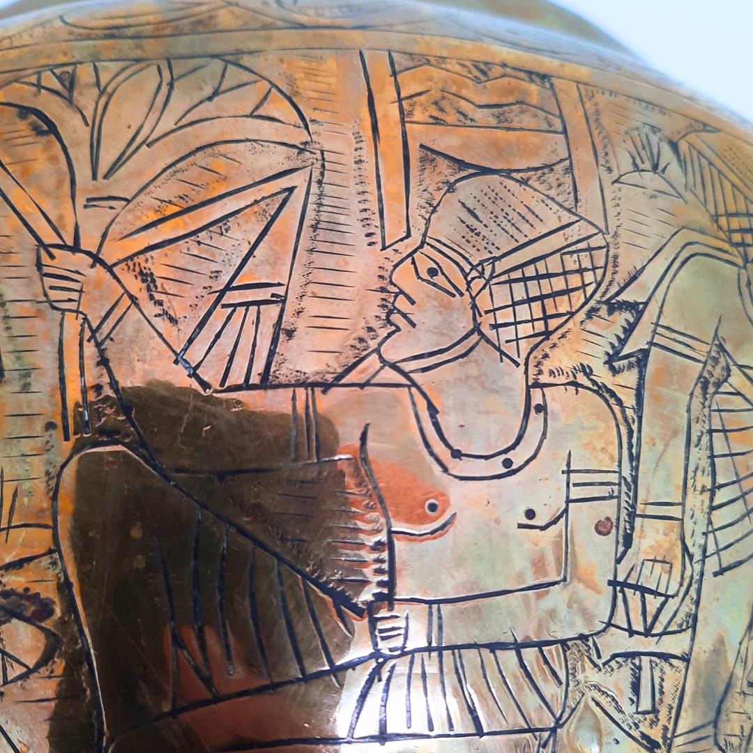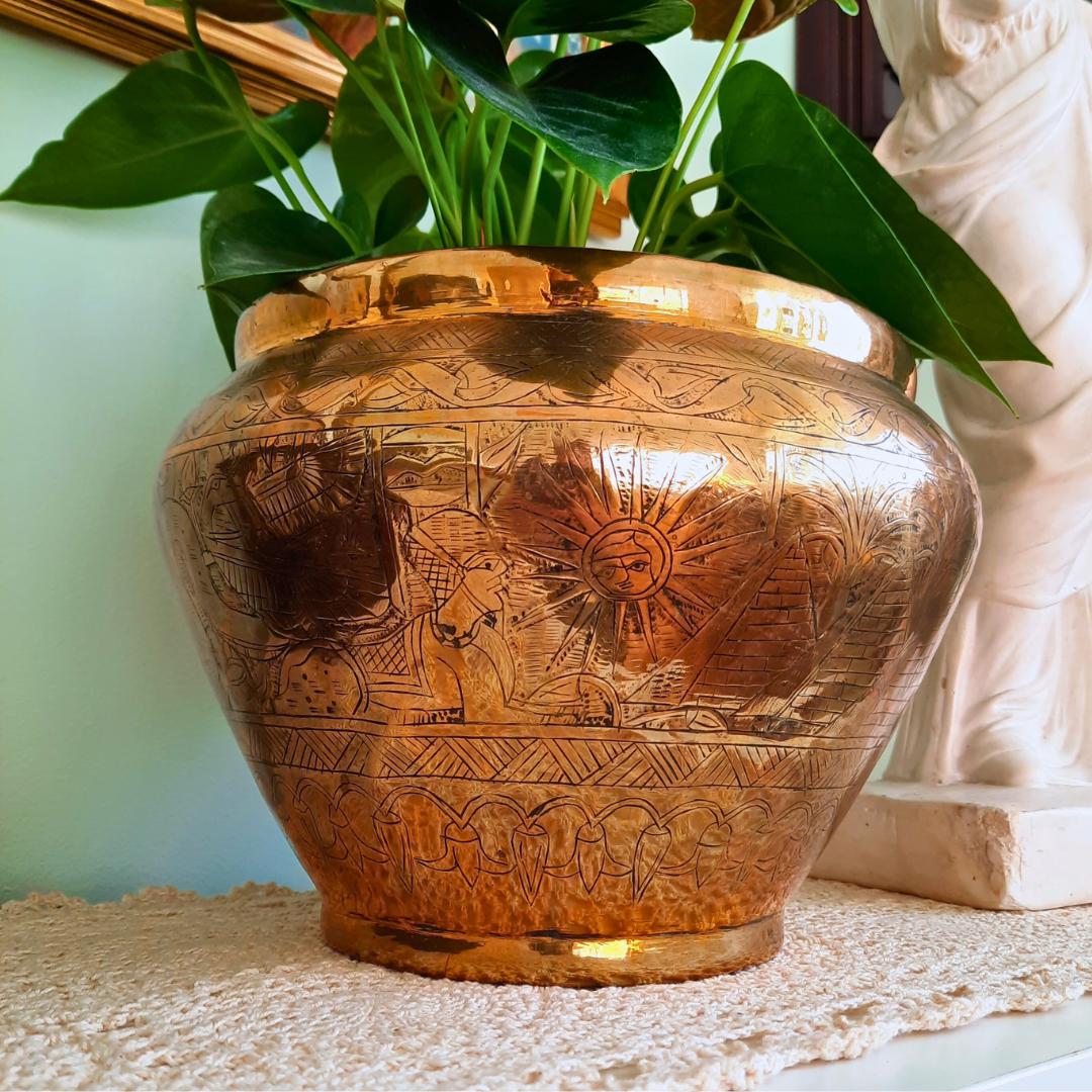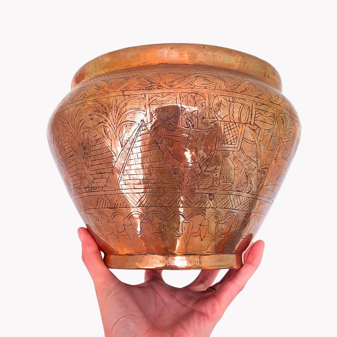 Beautiful antique cachepot with hand-engraved pyramids, animals and Egyptian people. C 1920's.
