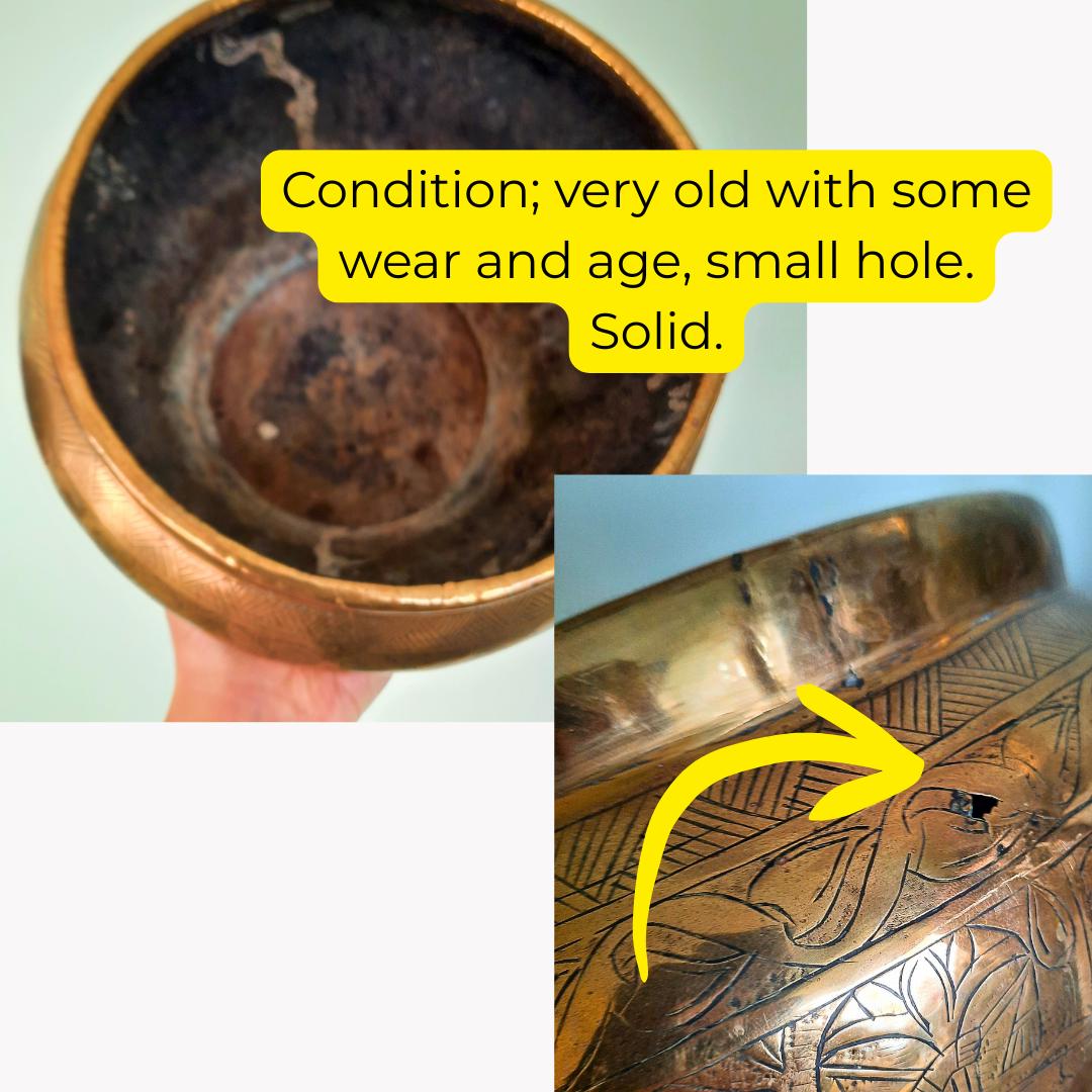 Large Antique Cairo Ware Hand Engraved Pyramids Brass Cachepot Jardiniere H 7.2'' approx.