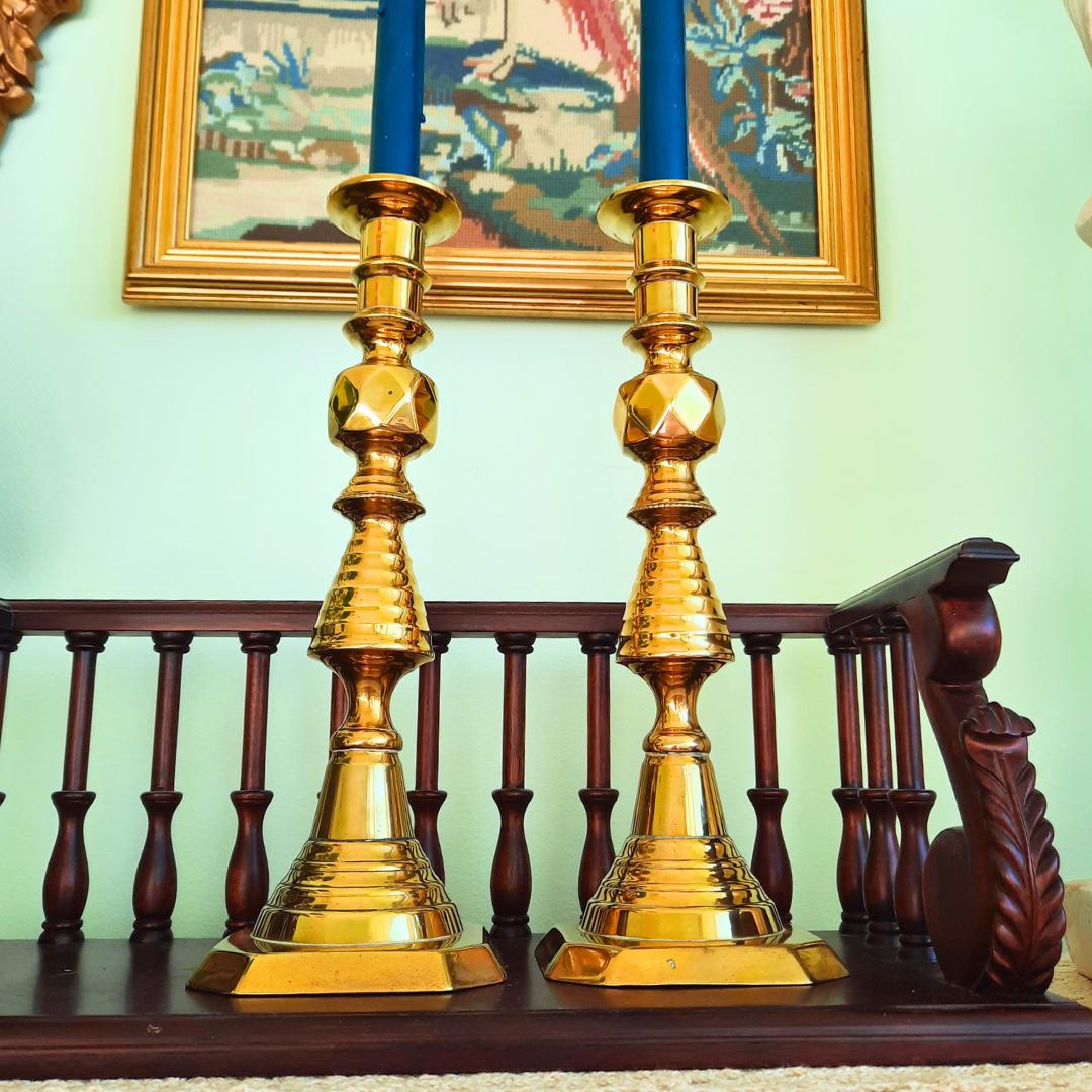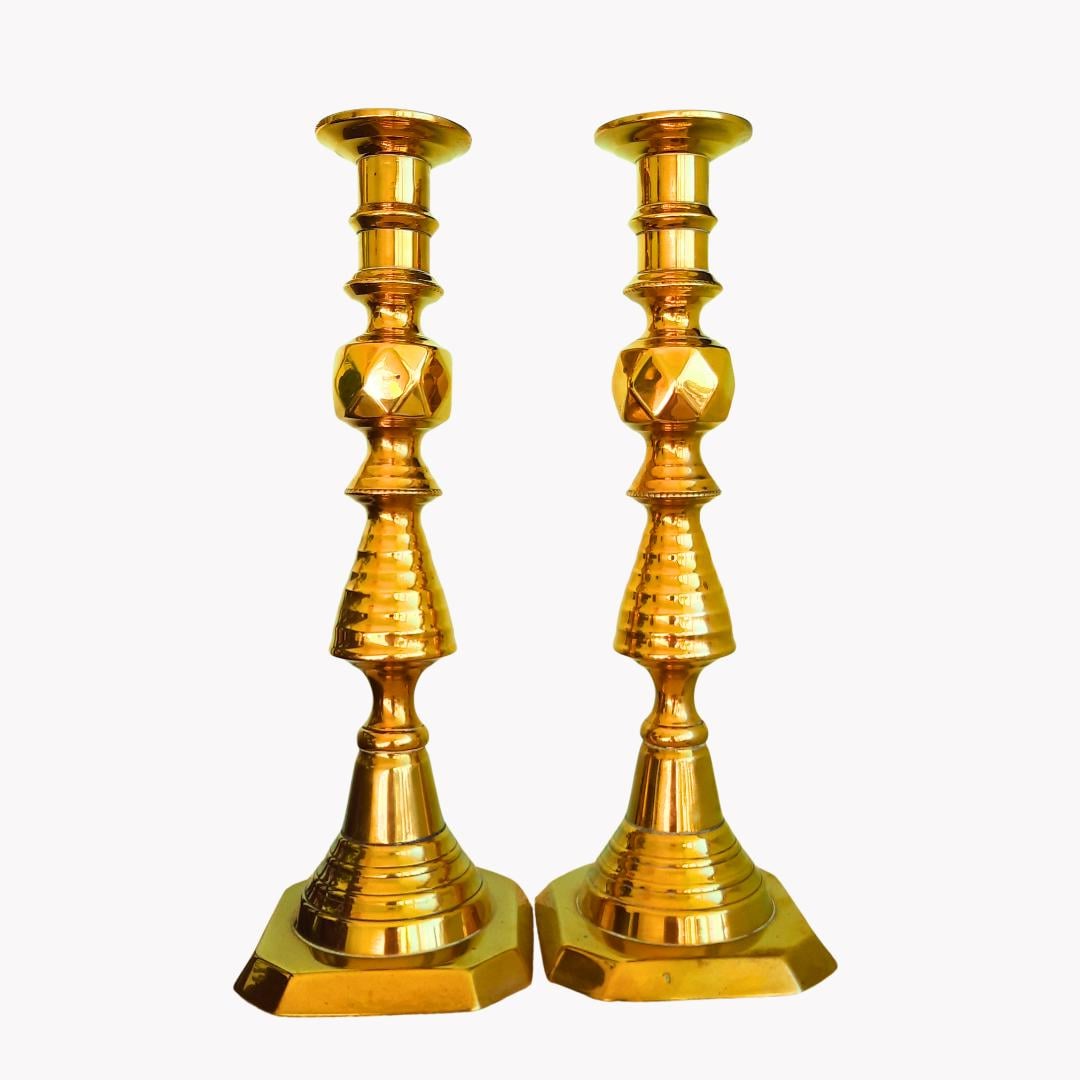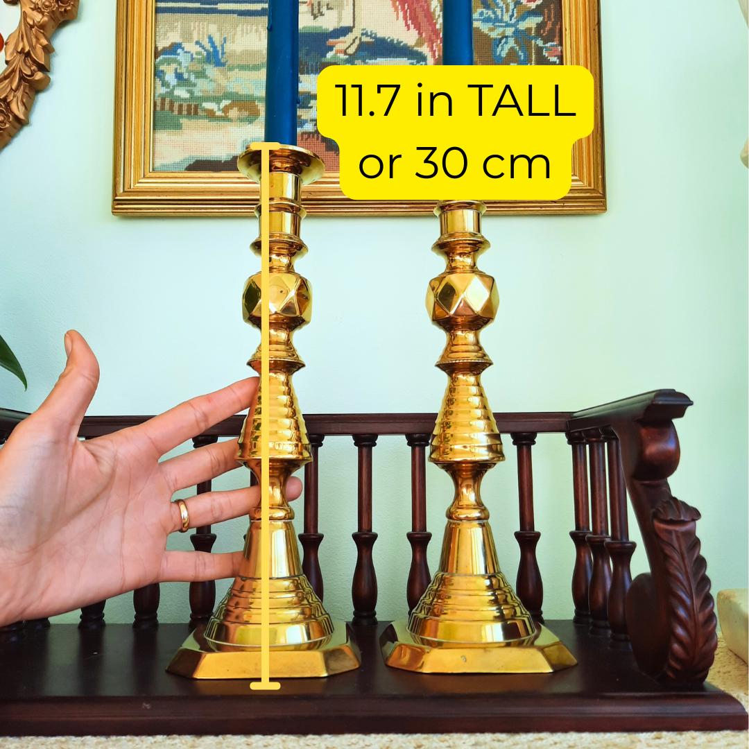 Large Pair Of King Of Diamonds Brass Candlesticks Pair H 11.7'', Antique Tall Brass Candleholders