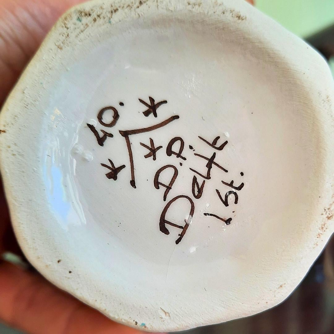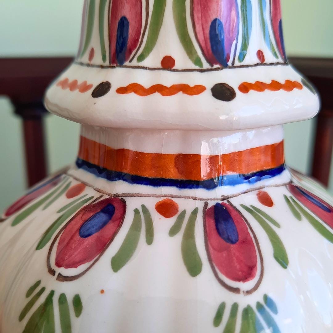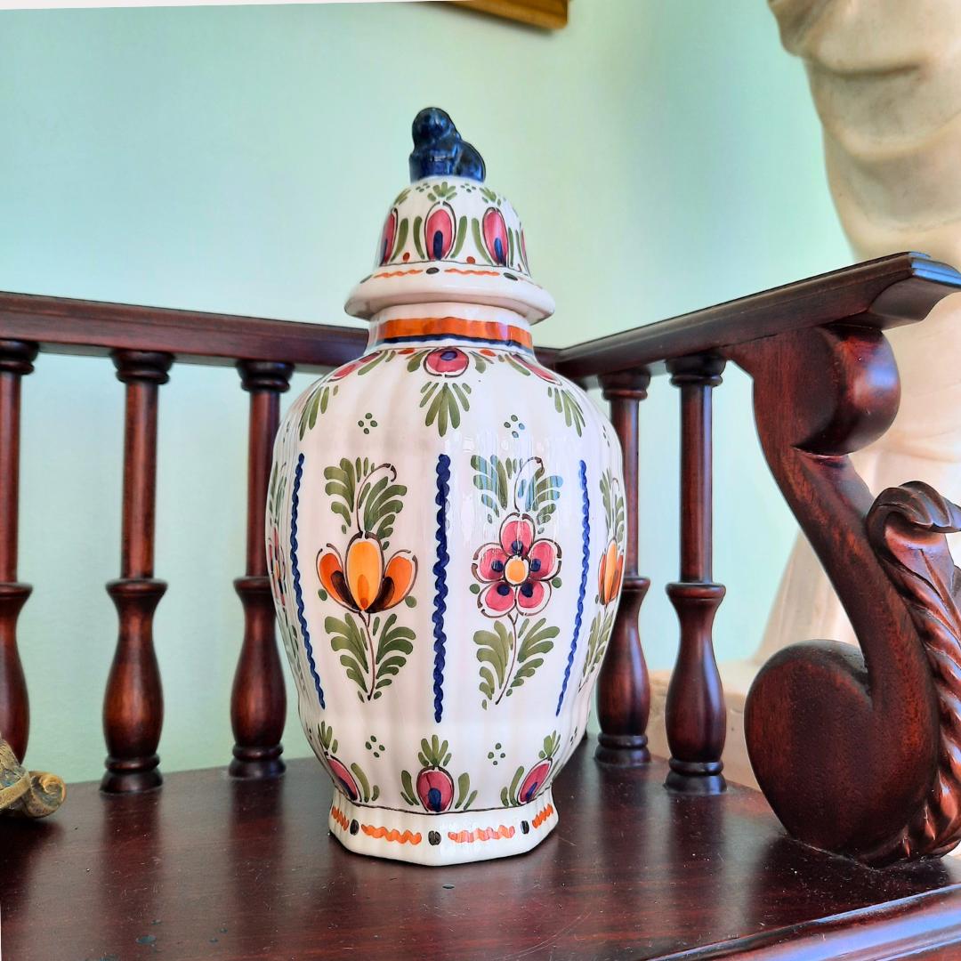 Very pretty ginger jar, hand painted with beautiful floral motif and a foo dog finial, that will look fab mixed with more Delft pottery or your Chinoiserie.