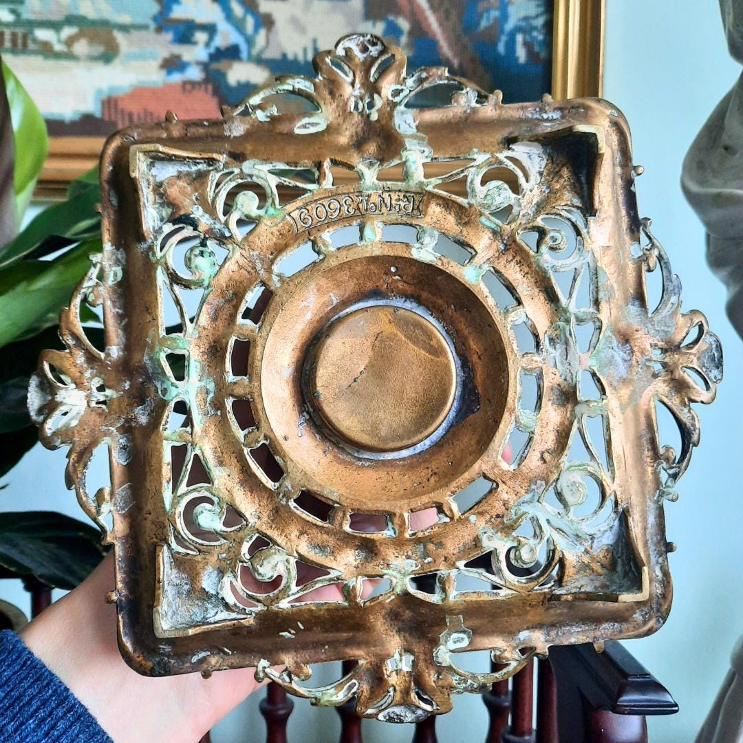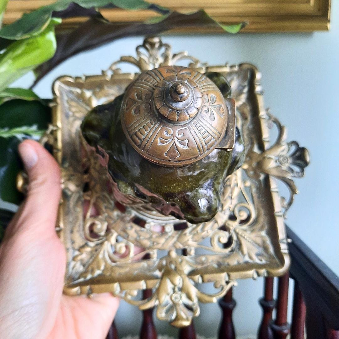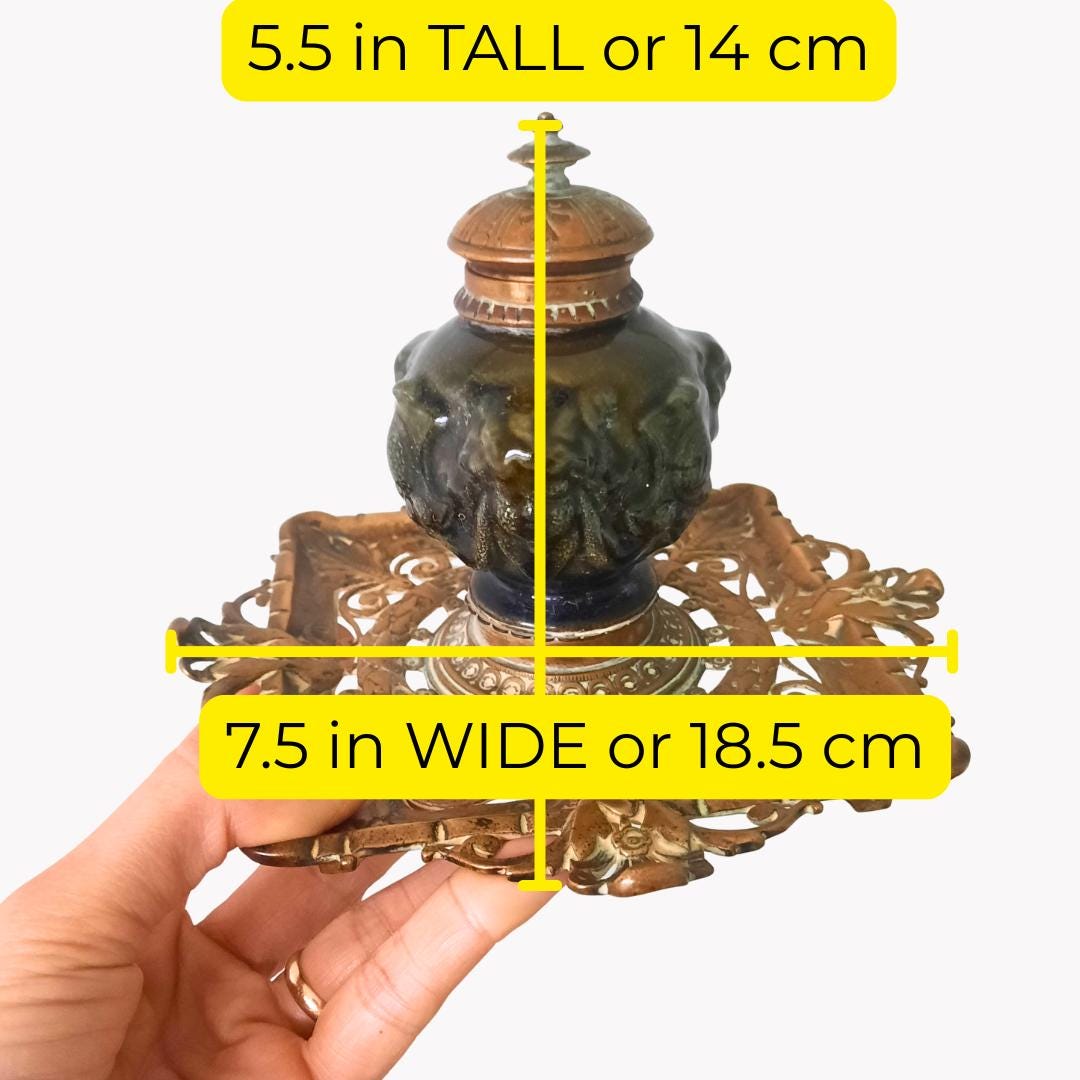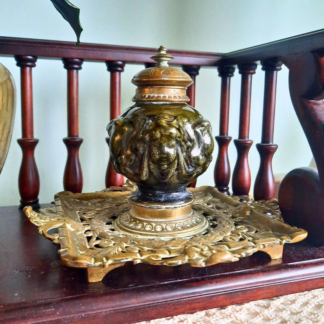 Antique Brass Linthorpe Pottery Inkwell With Cherub Faces and Ornate Decoration Made in 1905