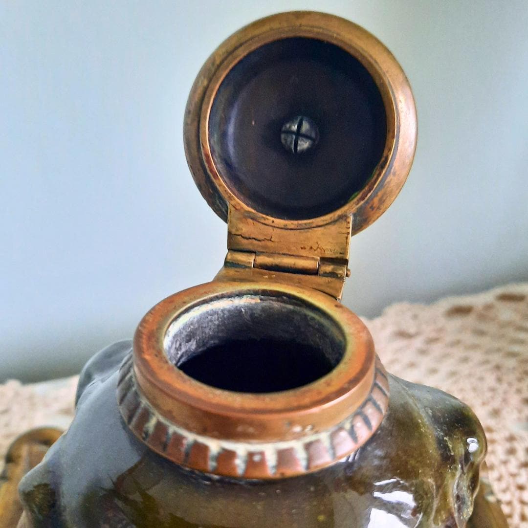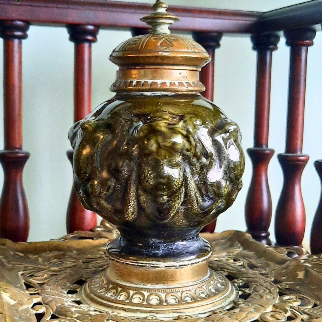 Beautiful and rare brass and pottery inkwell by Linthorpe pottery, that dates exactly to 1905 according to the registration number 43609. It will make a wonderful addition to any quality interior and also a perfect gift for the lover of unusual and beautiful objects that will be treasured forever!
