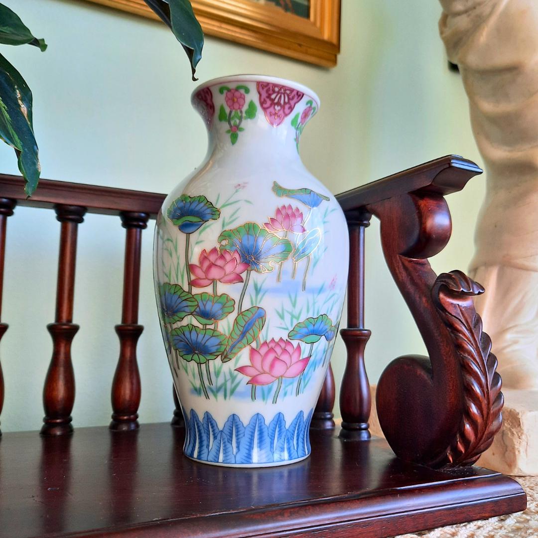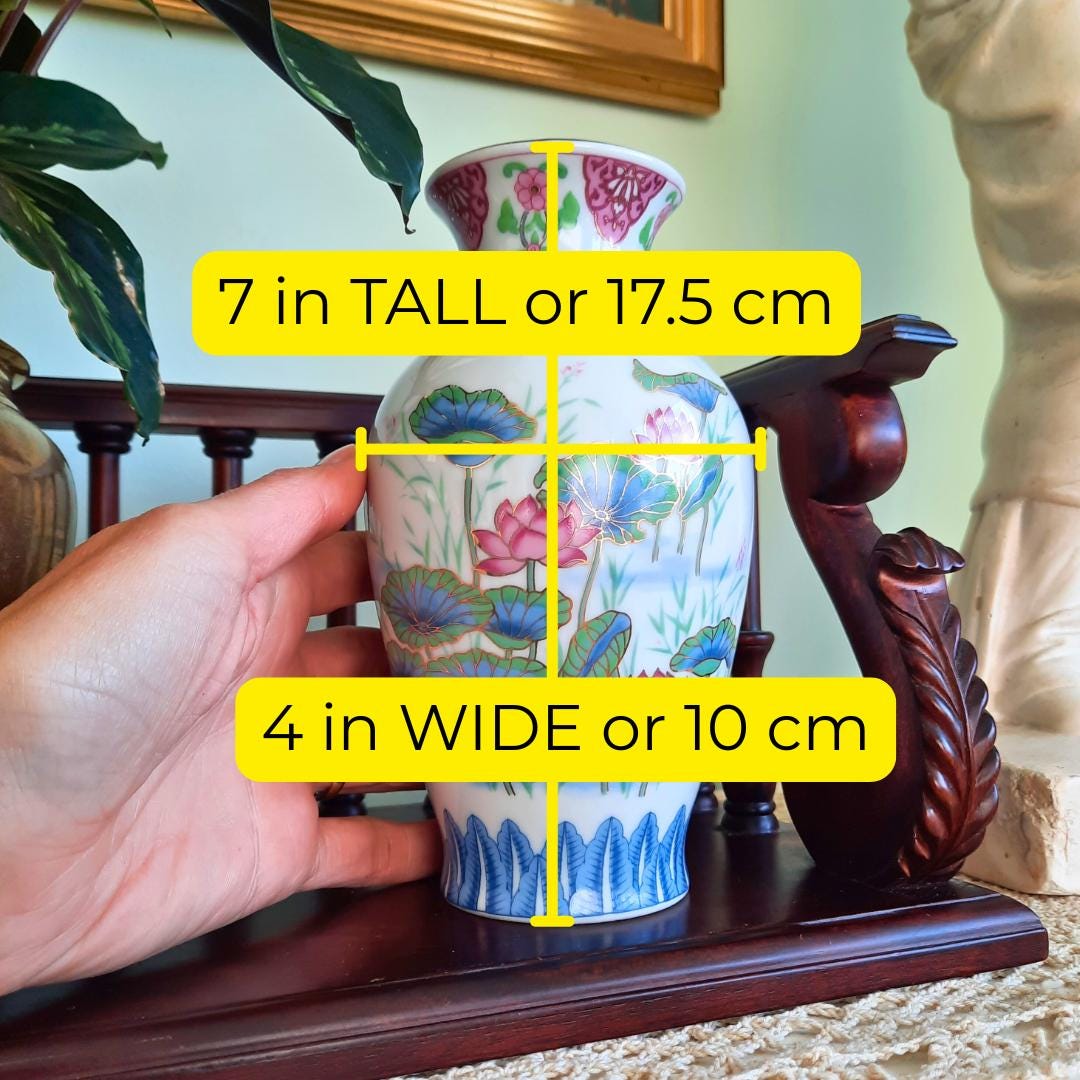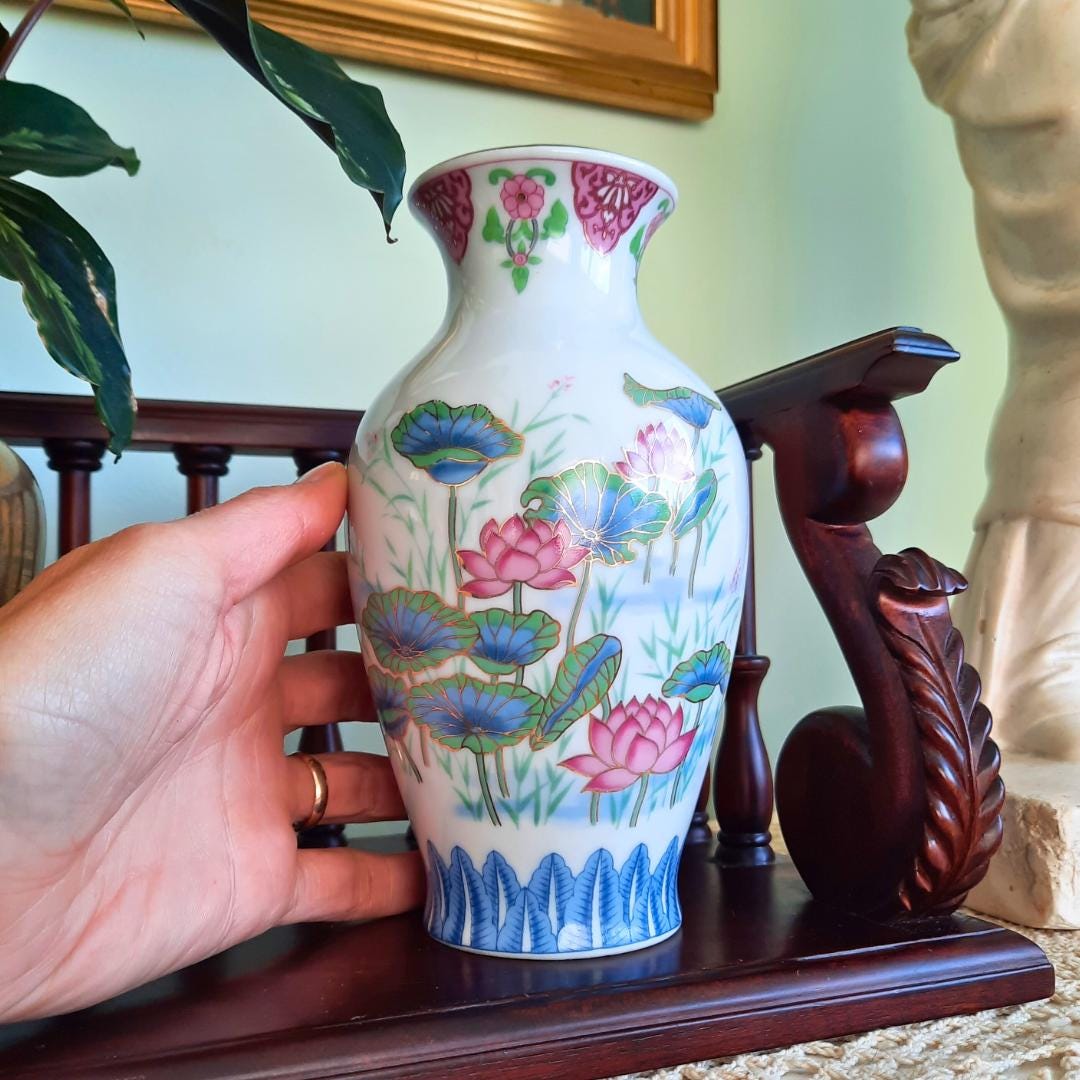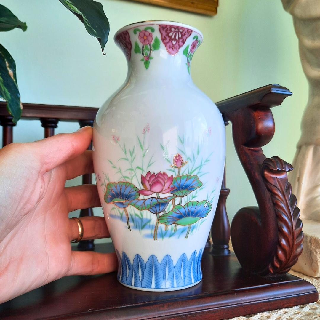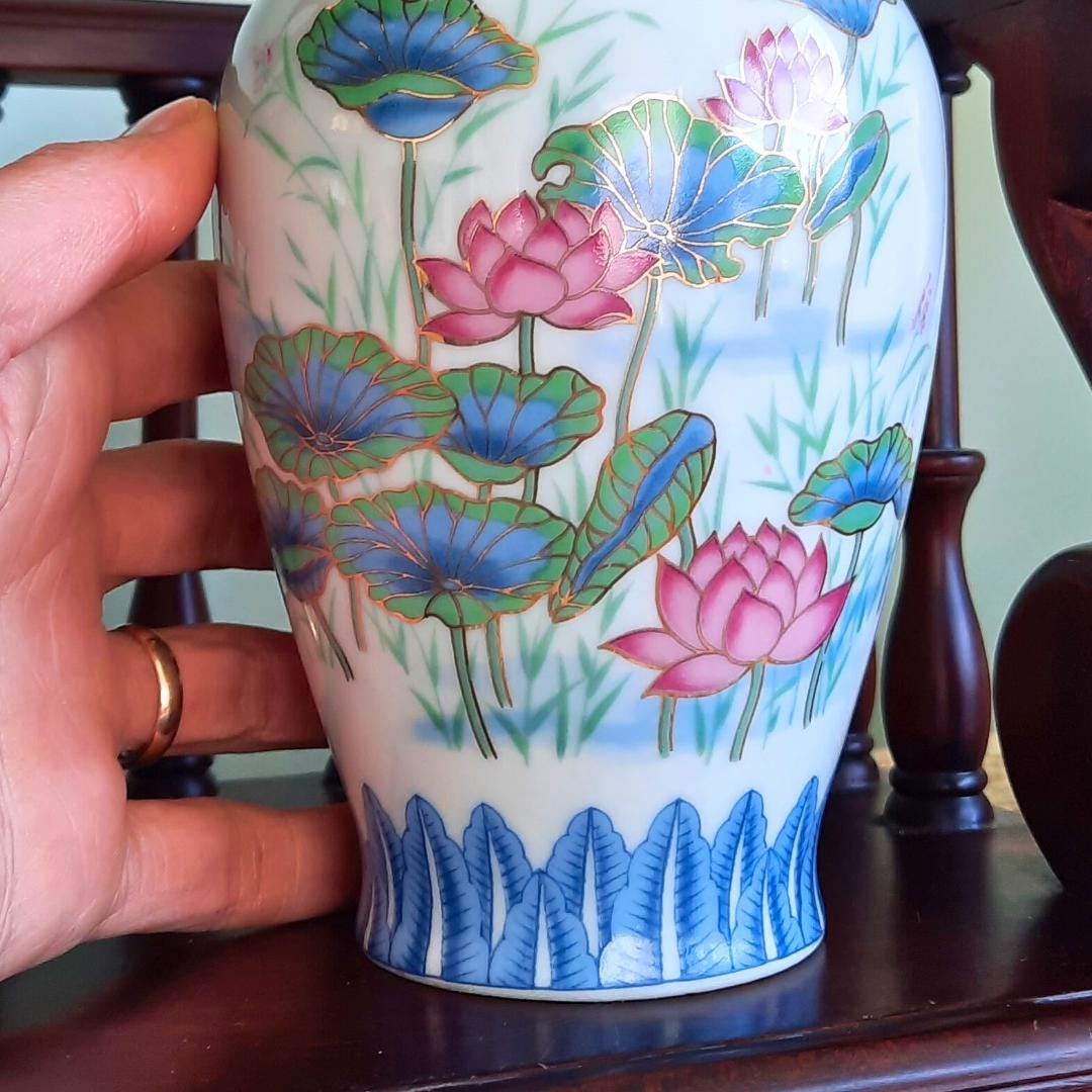 Mid Century Japanese Hasu Porcelain Vase With Hand Painted Lotus Floral Decoration 7'' Tall