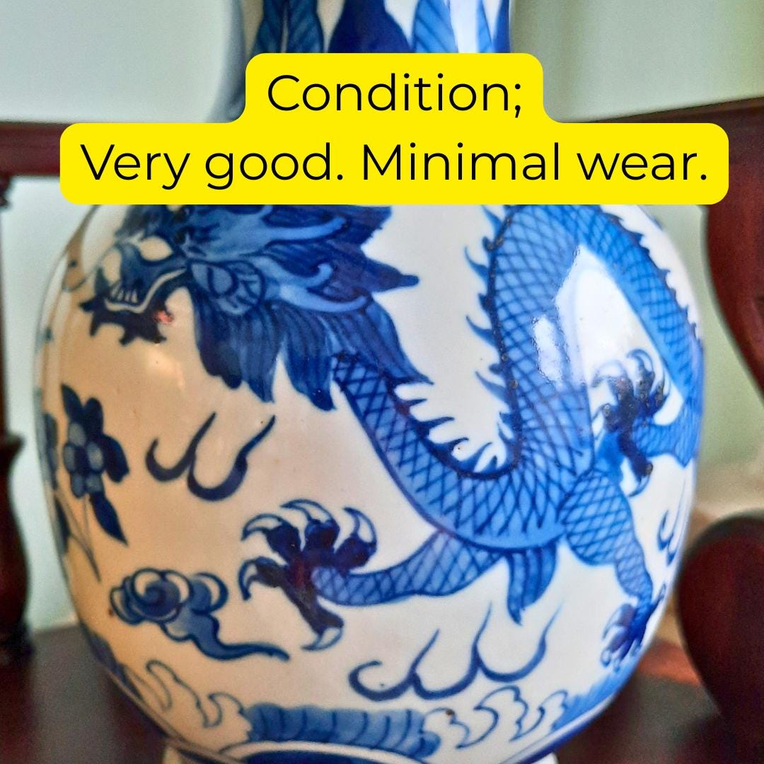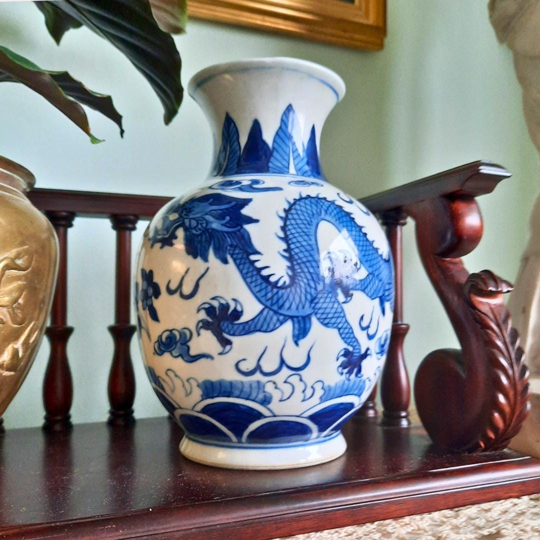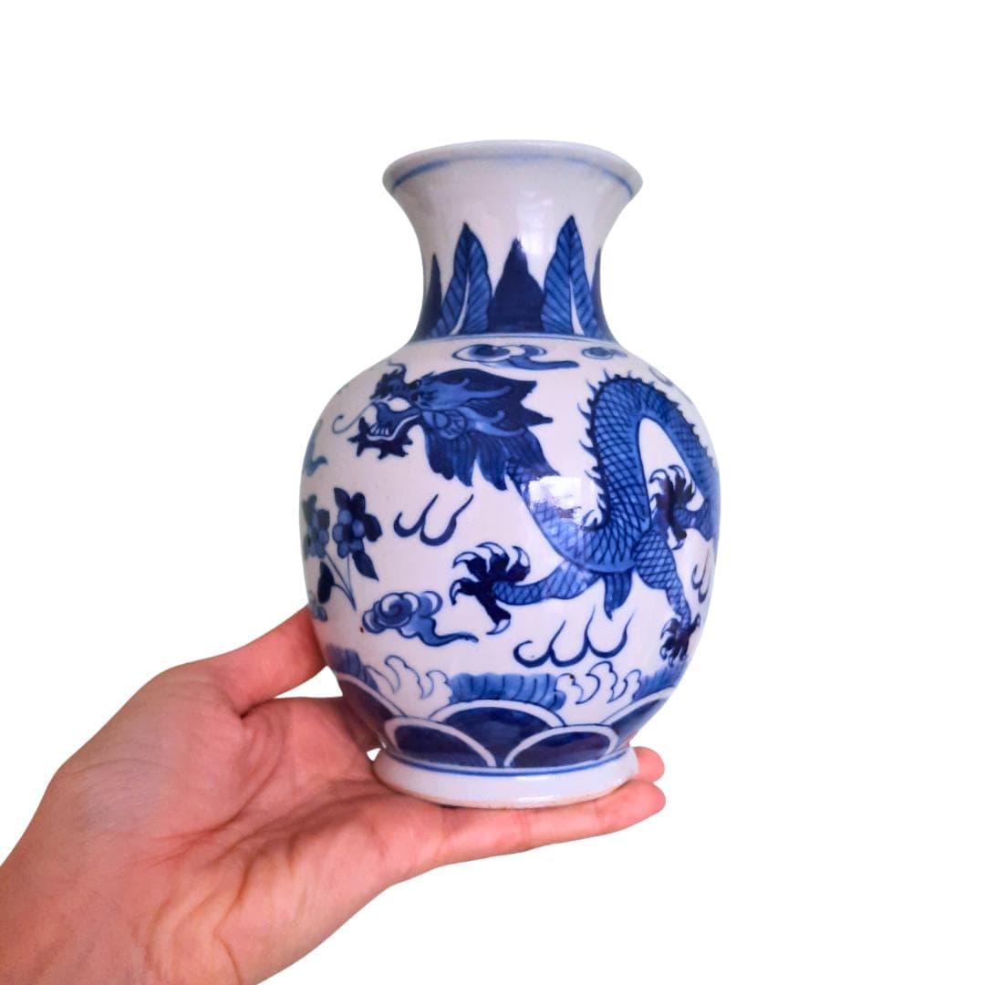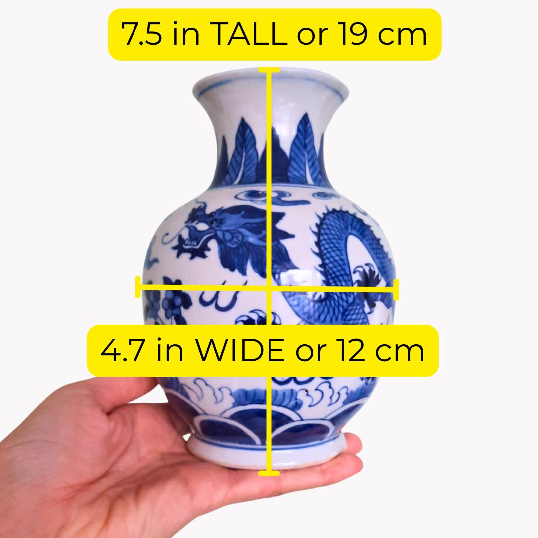 Old Chinese Ceramic Blue And White Vase With 5 Clawed Dragon Chasing Flame Decoration H 7.5 ''