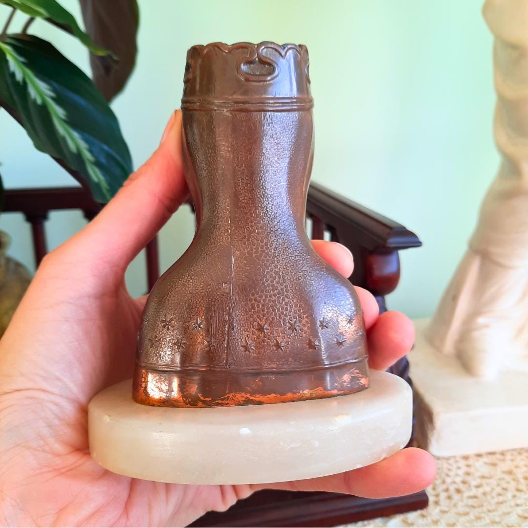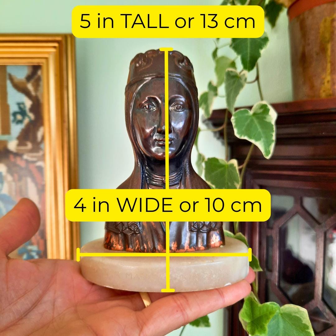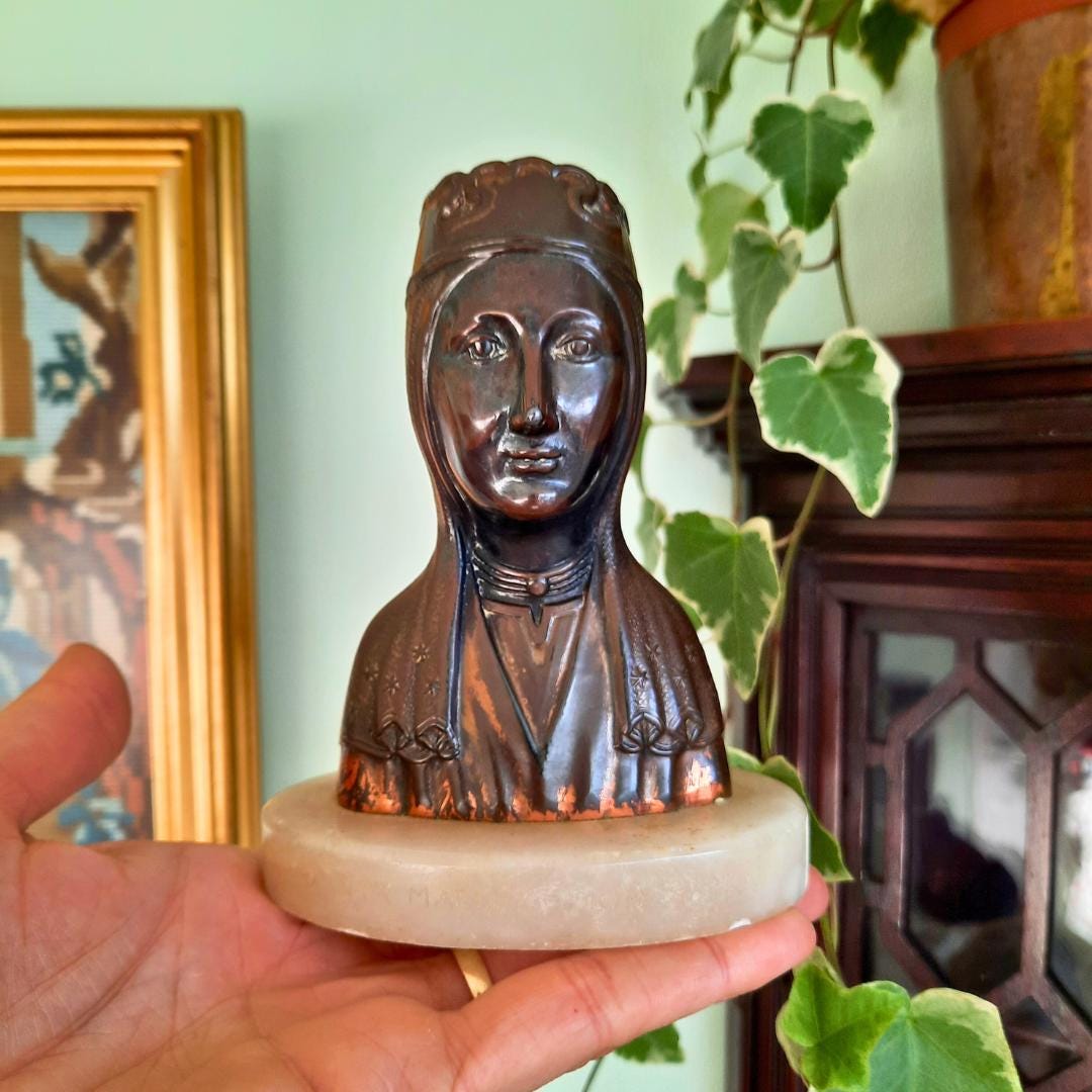 Vintage Medieval Gothic Style Our Lady Of Montserrat Virgin Madonna Copper On Marble Statue C 1960's.