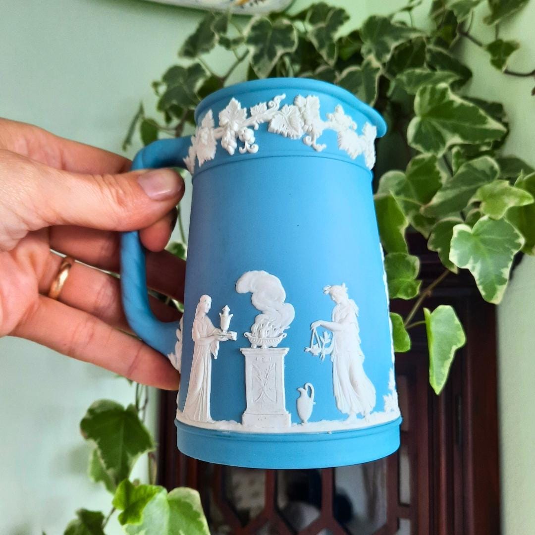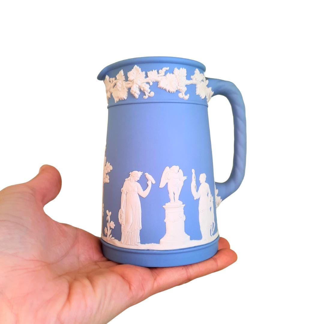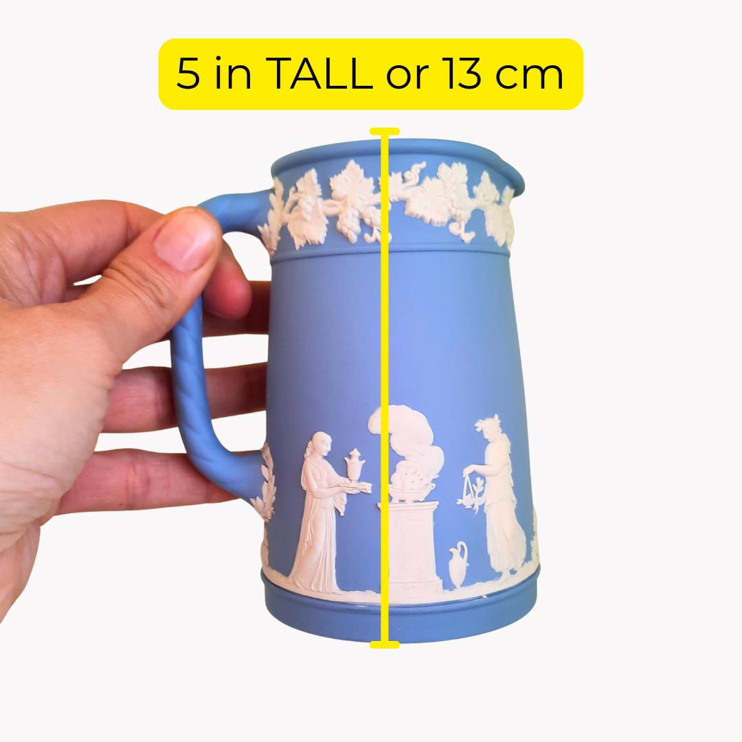 50's Wedgwood Light Blue and White Jasperware Trojan Jug 5'' Tall Neoclassical Made In England 1952