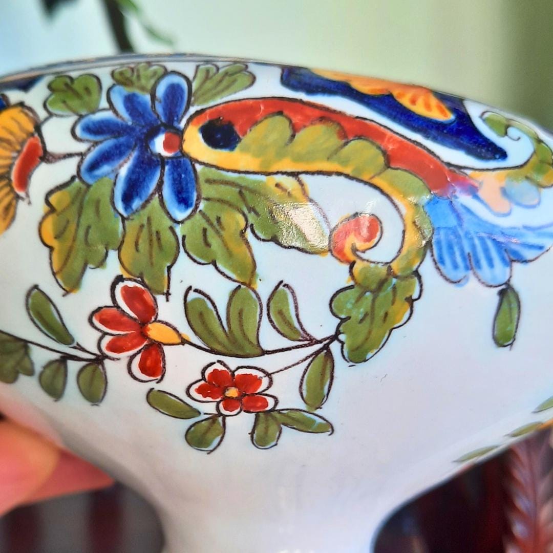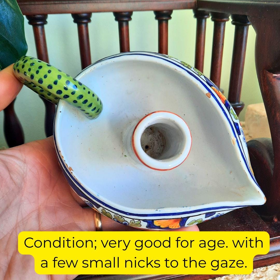 Antique French Faience Rouen Hand Painted Polychrome Chamberstick Candleholder C 1880's.