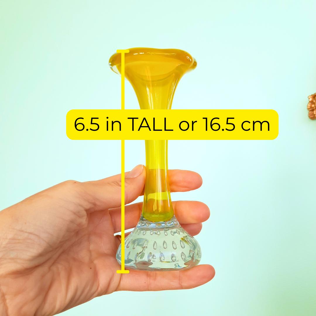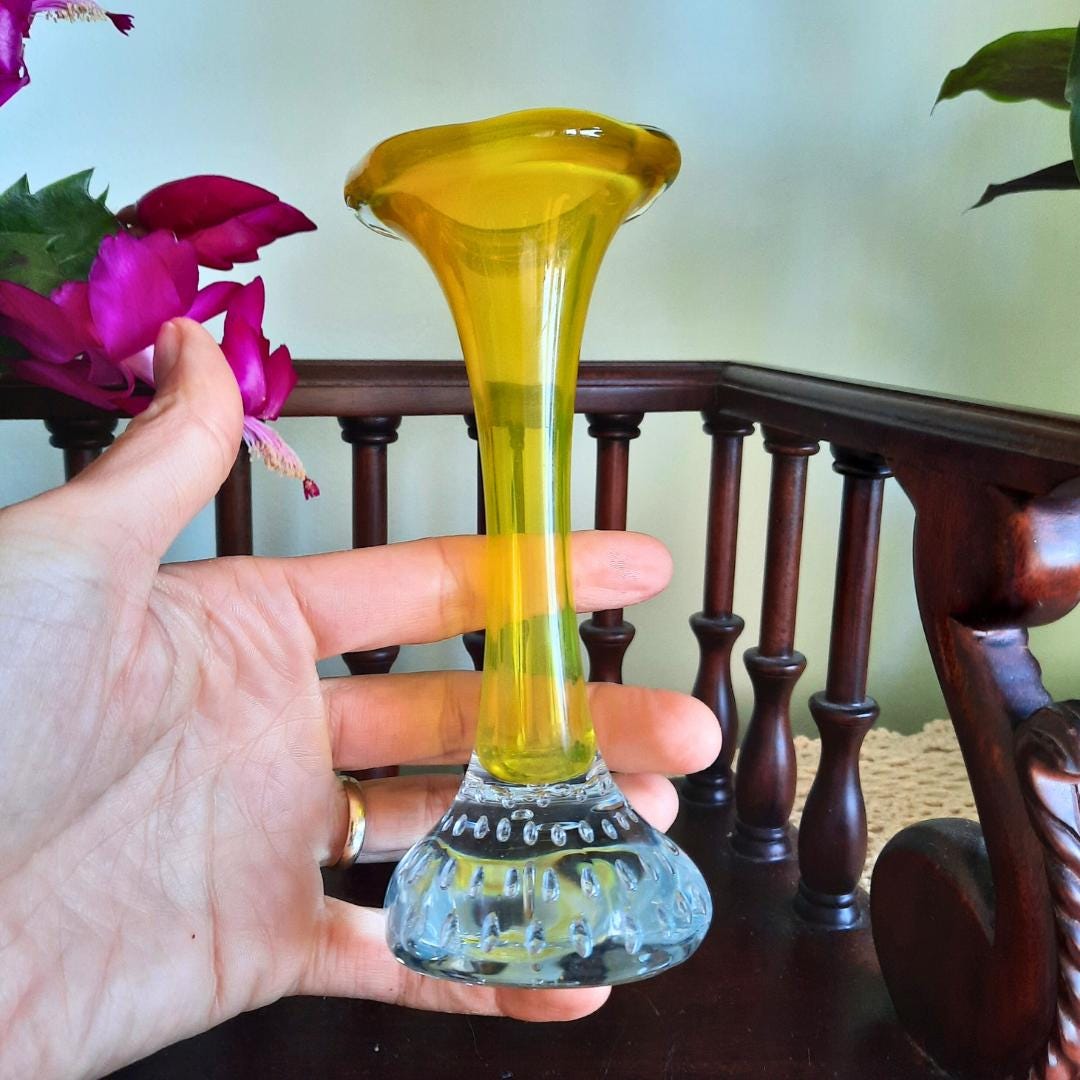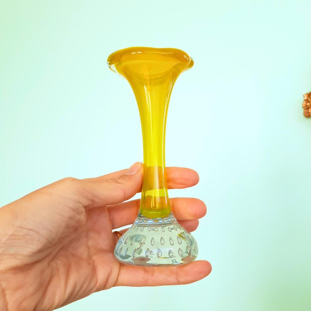 This gorgeous little trumpet-shaped vases were hugely popular in the 50s & 60s, and look beautiful displayed alone with a single flower stem, grouped together or complimenting collections of other coloured glass. This color is harder to come by