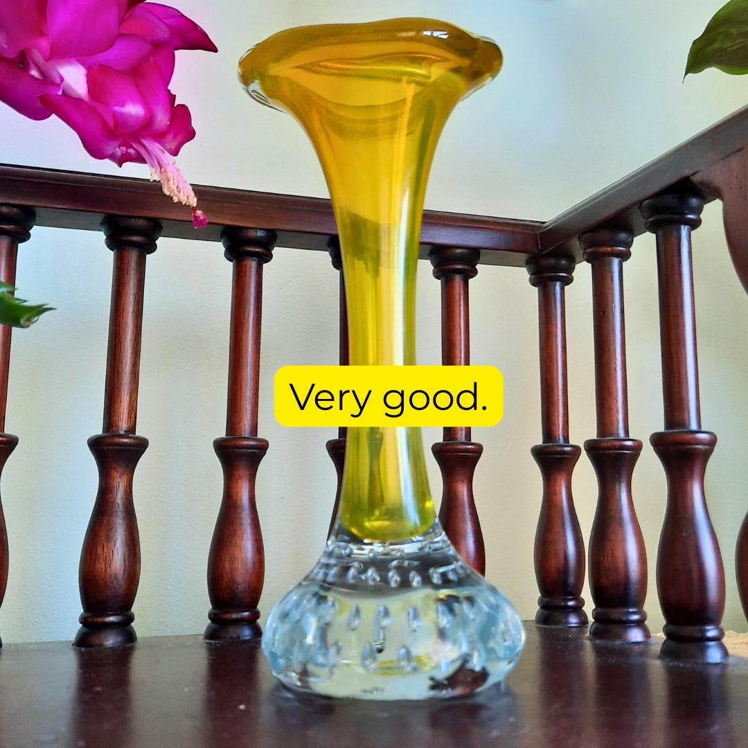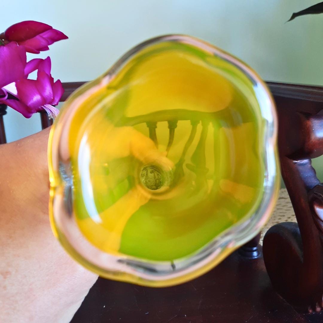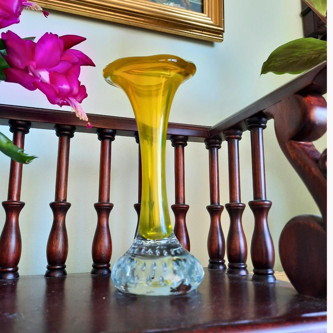 This gorgeous little trumpet-shaped vases were hugely popular in the 50s & 60s, and look beautiful displayed alone with a single flower stem, grouped together or complimenting collections of other coloured glass. This color is harder to come by