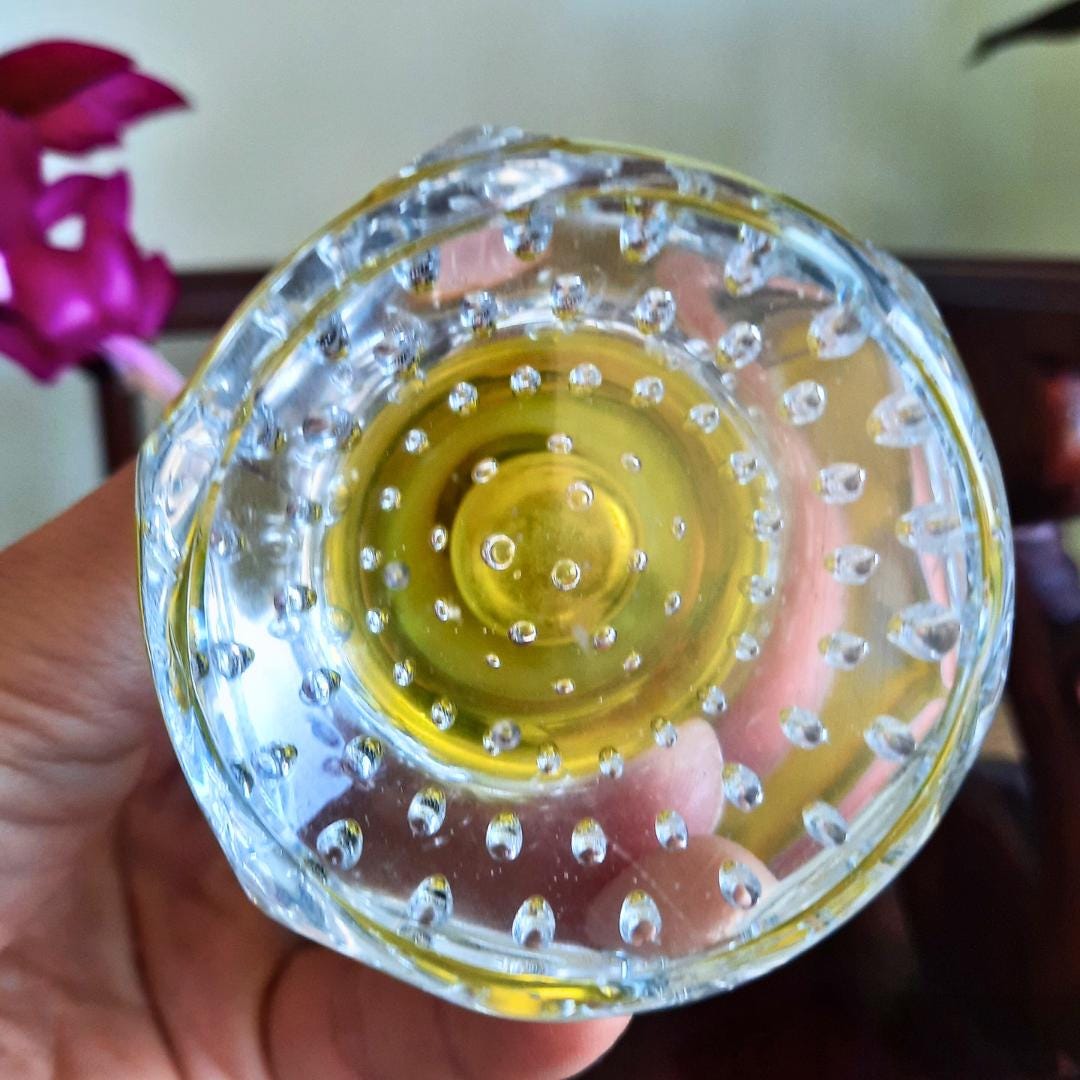 Iconic MCM Swedish pulpit vase by Aseda Glasbruk, hand-blown, in yellow coloured glass cased in a clear layer, with clear controlled bubble 'bullicante' base.