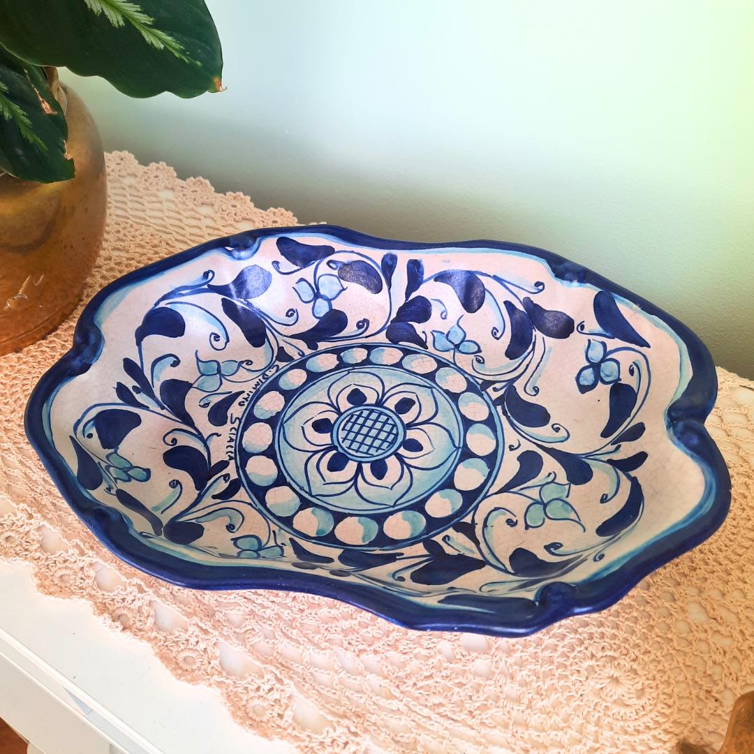 Vintage Italian Pottery Blue and White Hand Painted Decorative Bowl Handcrafted In Sciacca Sicilly