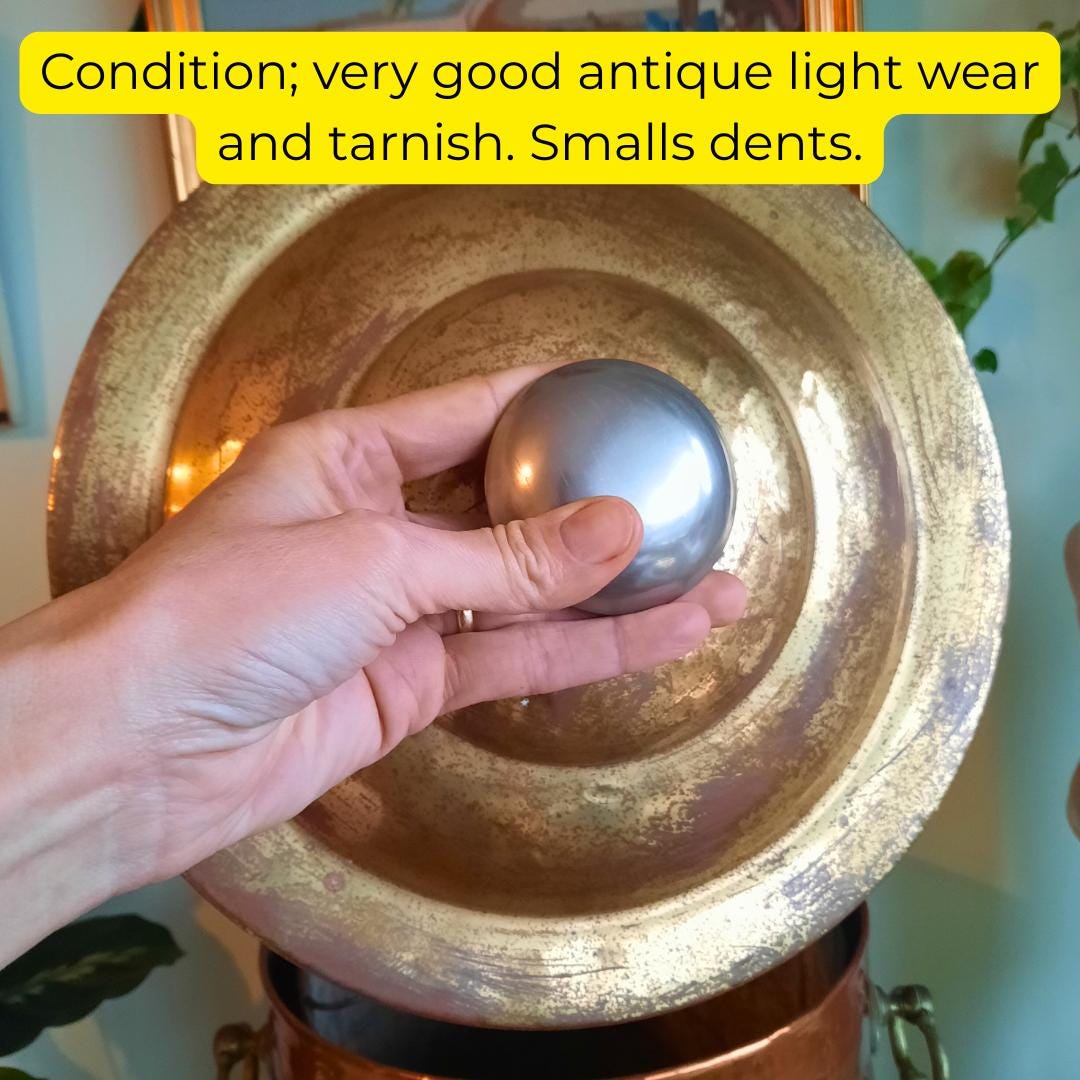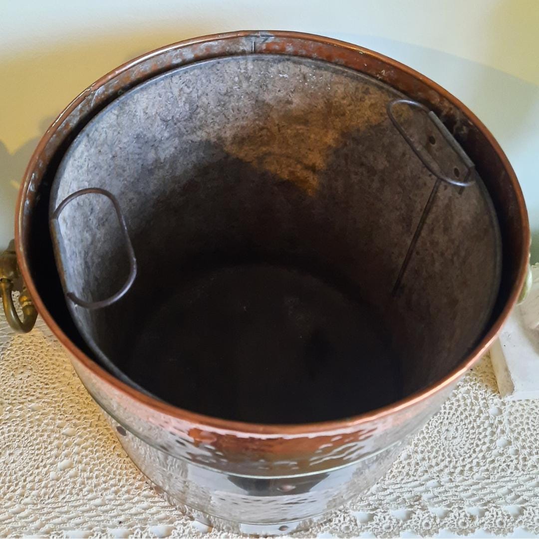 Very good antique condition. Few small dents in the body and lid, tarnishing, light scratches. The interior bin in pretty good shape for age. Solidly handcrafted.