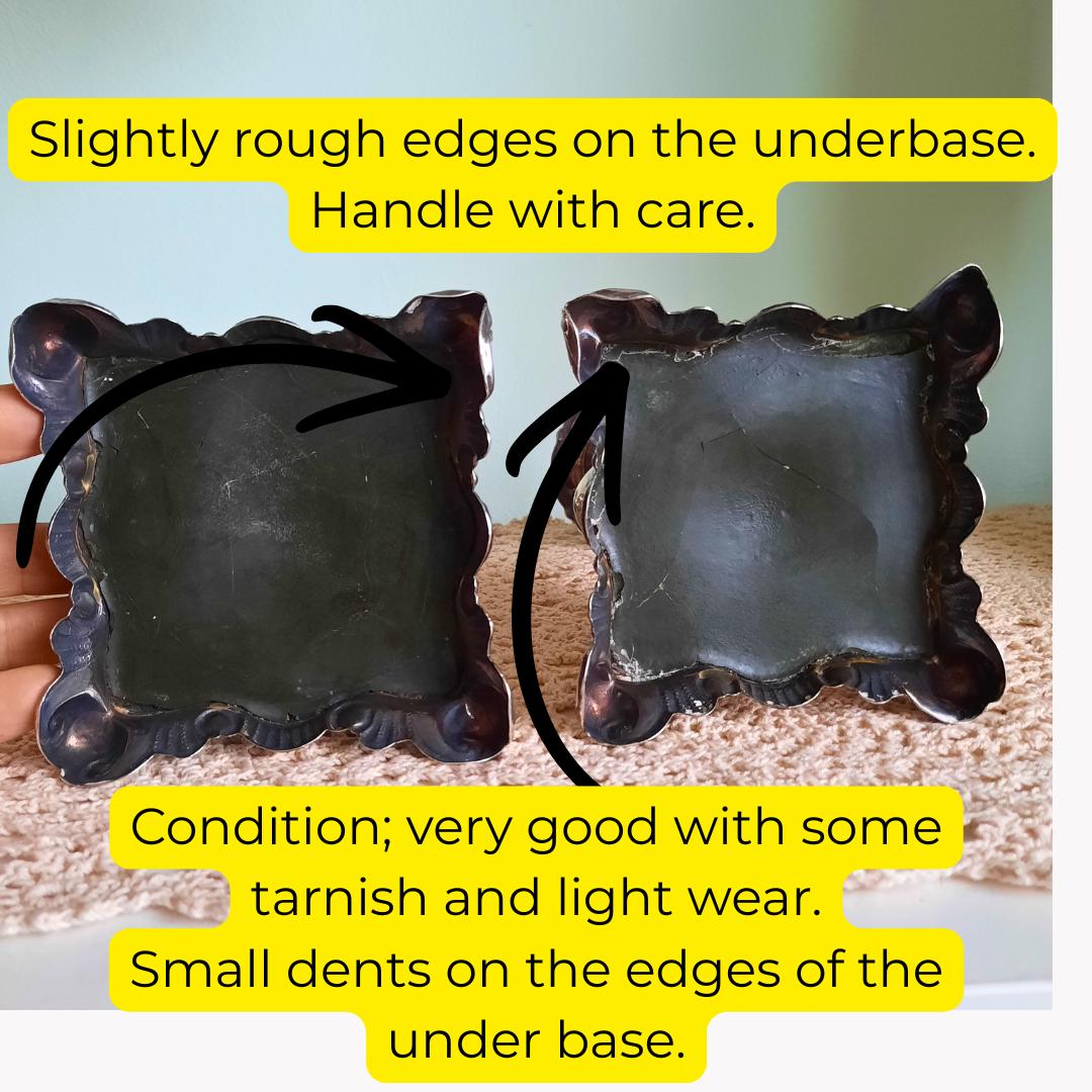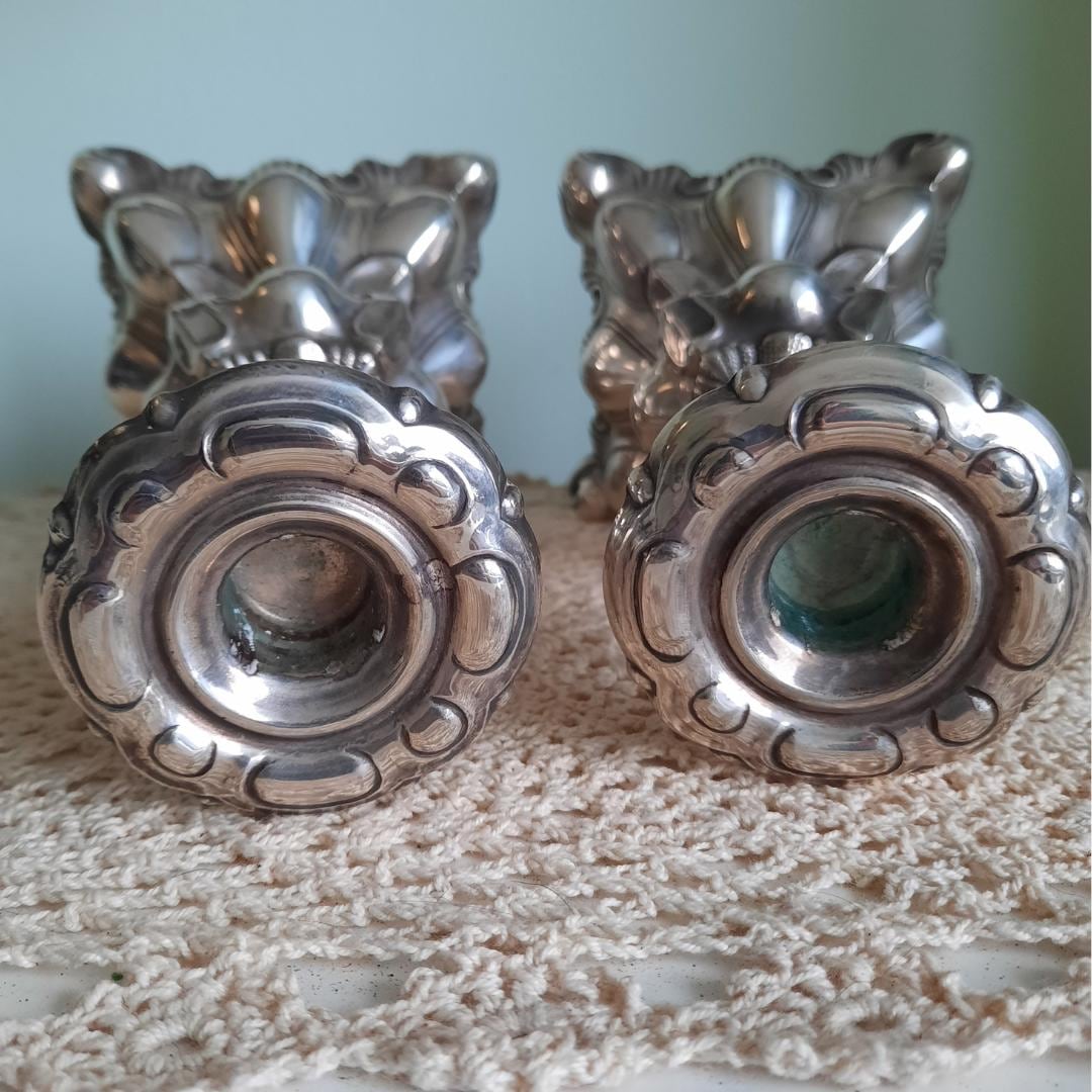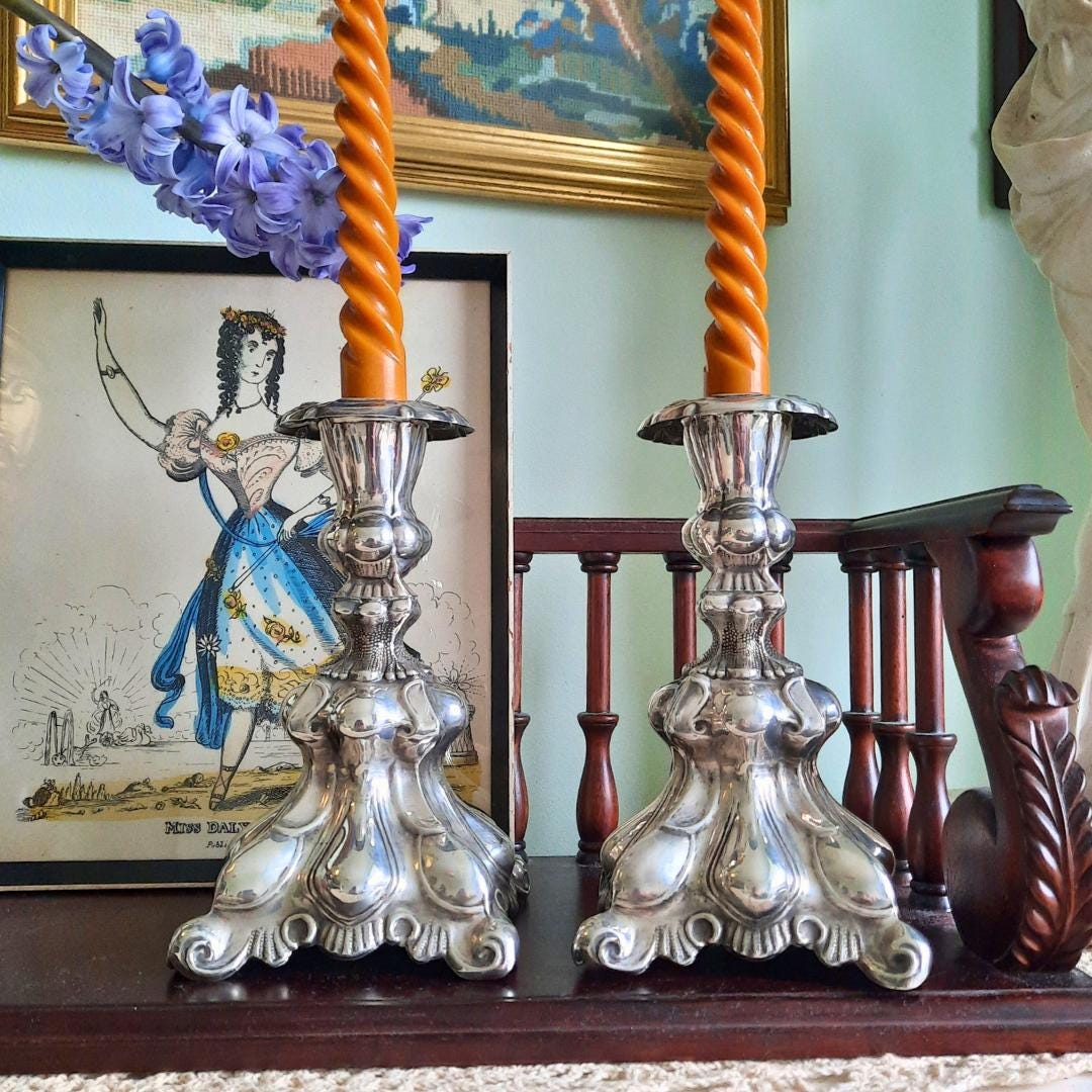 Antique Scandinavian Baroque Nickel Silver Candlestick Holders Pair Marked Prima NS Alp Made In Sweden Early 1900's.