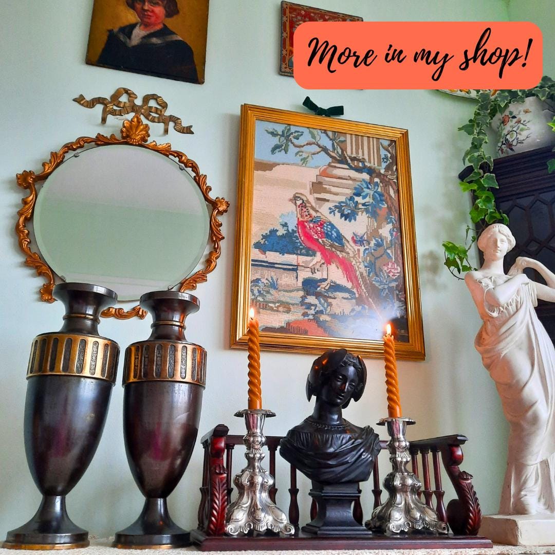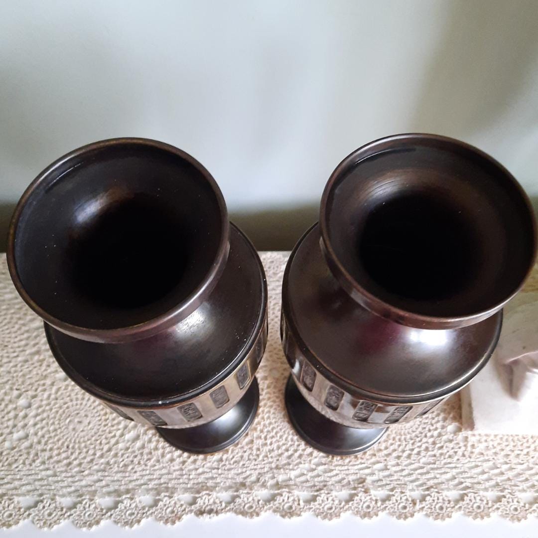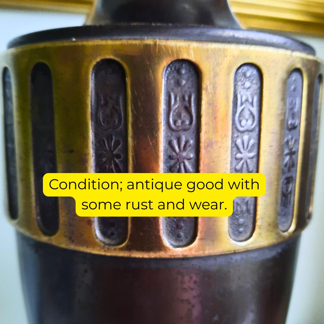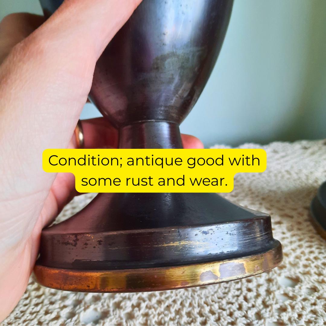 Condition; rust and wear as expected for age. Overall quite good, considering over 100 years old. Suitable to display or to use with dry flowers. Quite light for size. I believe they are made of brass and some other metal.