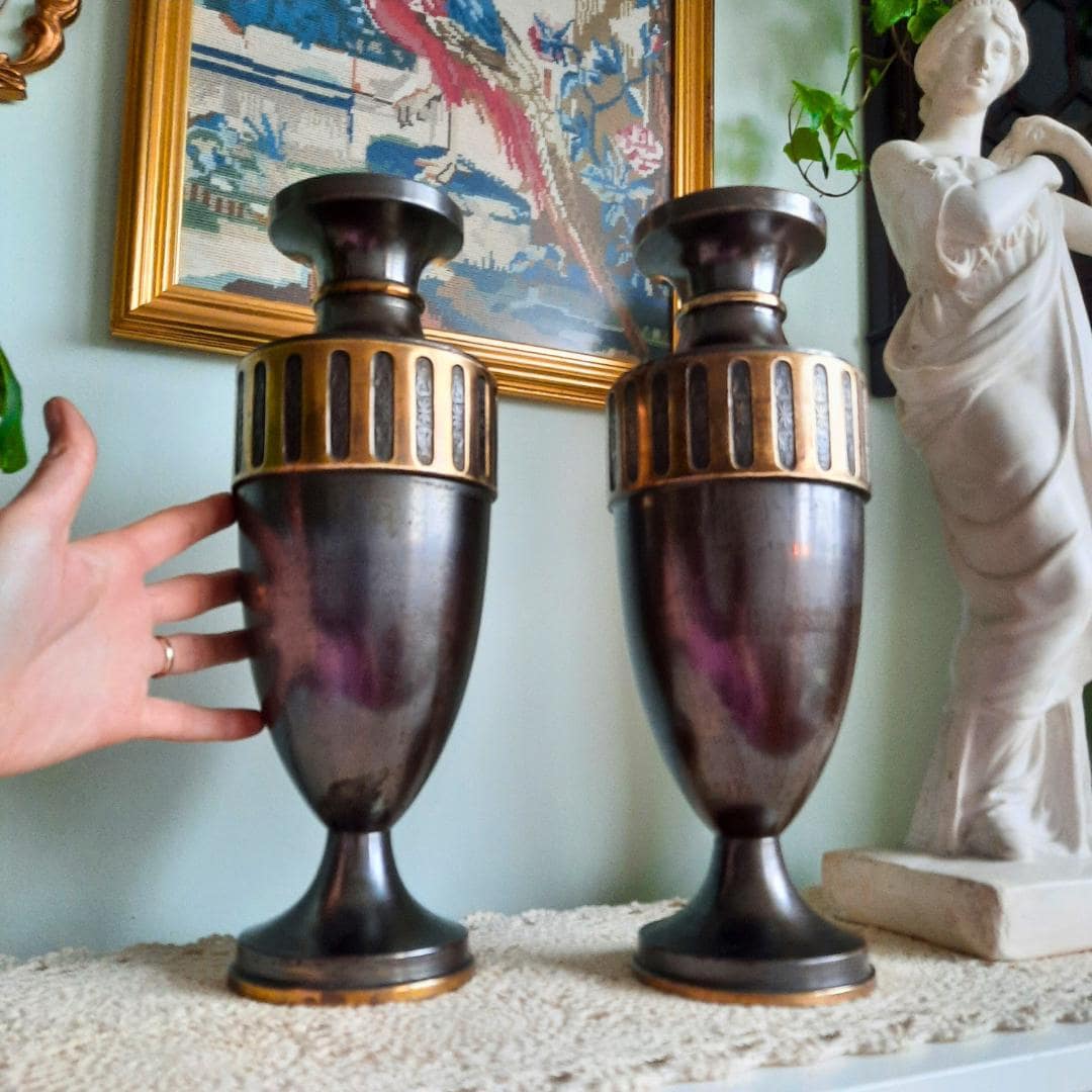 Antique Tall Pair of Metal Art Nouveau Vases Regency Style Form H 14.7''