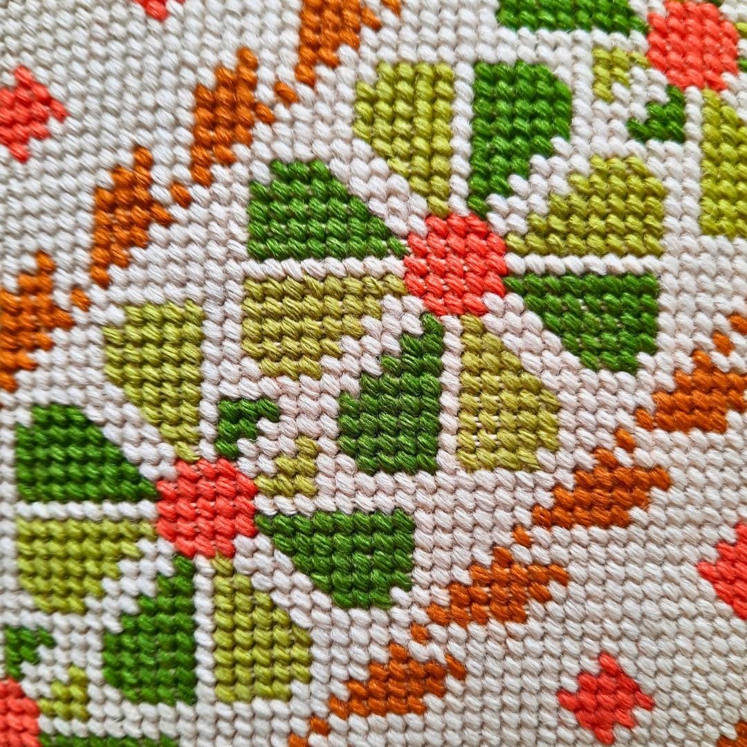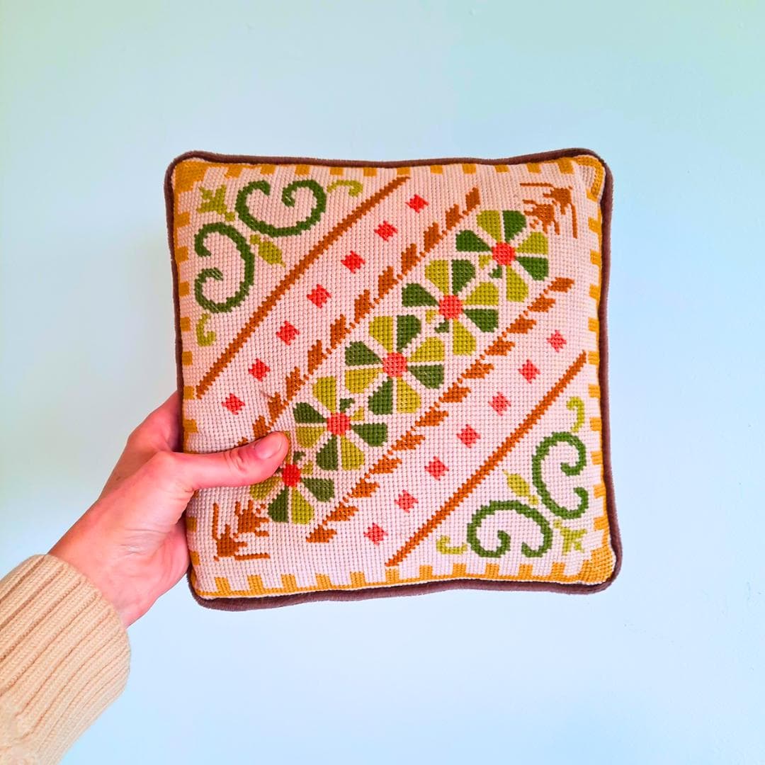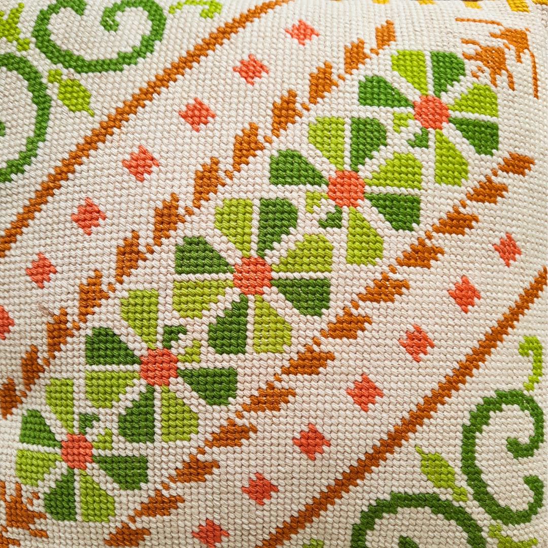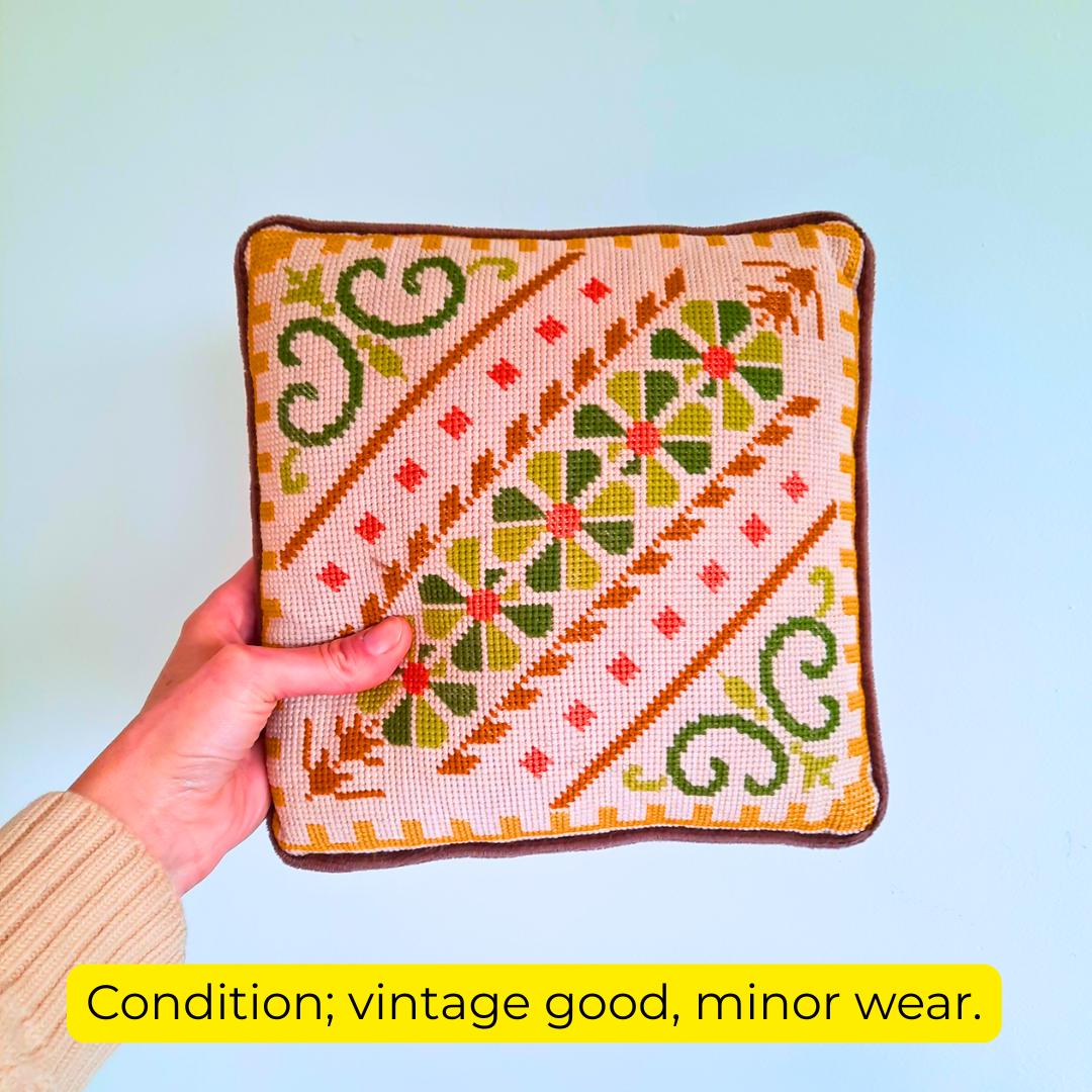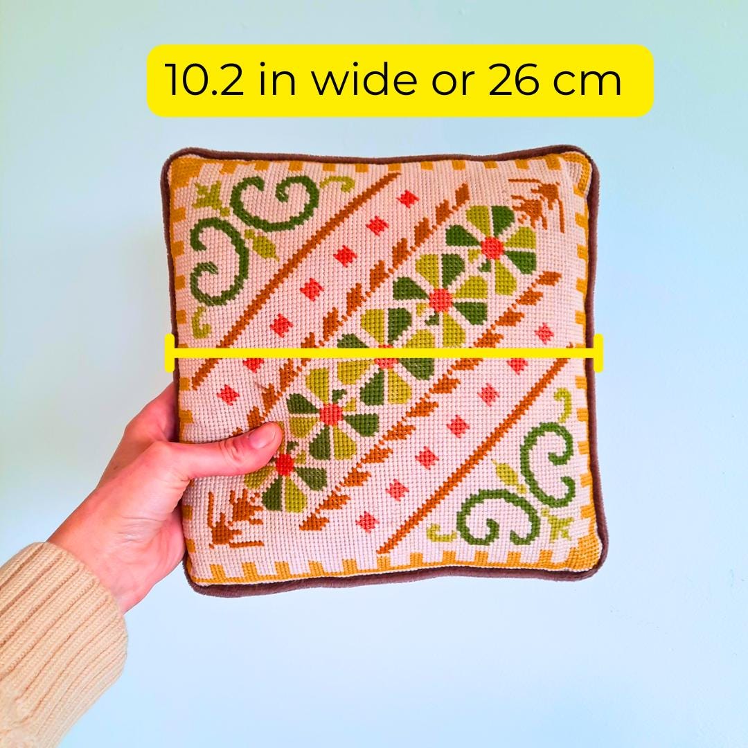 Vintage Small Cross Stich Cushion Floral and Geometric Pattern 10.2 in w