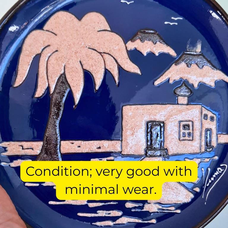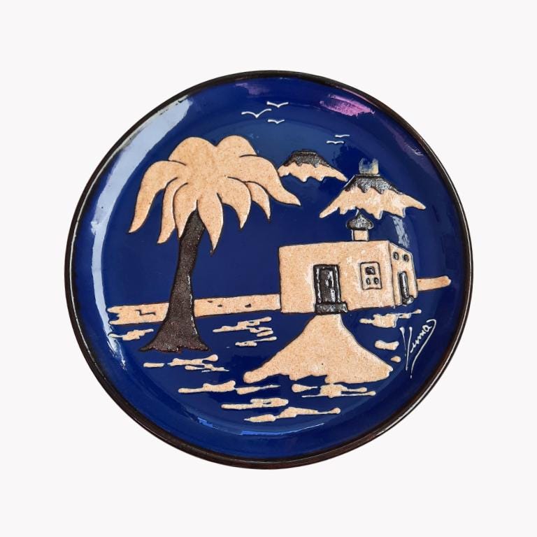 Small Spanish Pottery Hand Painted Wall Plate From Tenerife Volcano Palm Tree Motif .