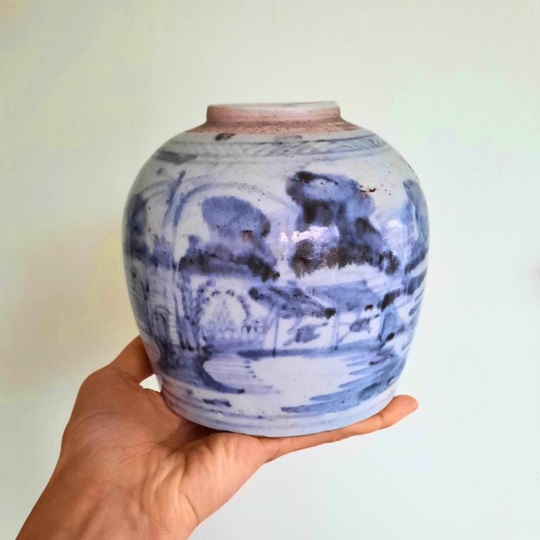 Beautiful truly antique Chinese stoneware ginger jar with typical provincial landscape and river scenery that will make a wonderful addition to any quality home or collection. The jar is pretty good shape with minor wear and the normal moulding flaws as were handcrafted and hand-painted.
