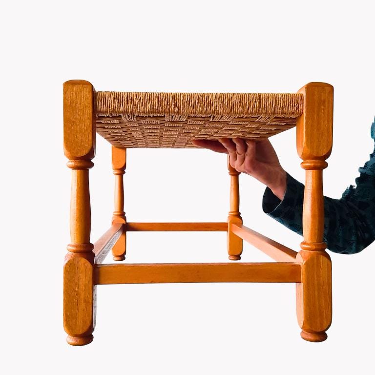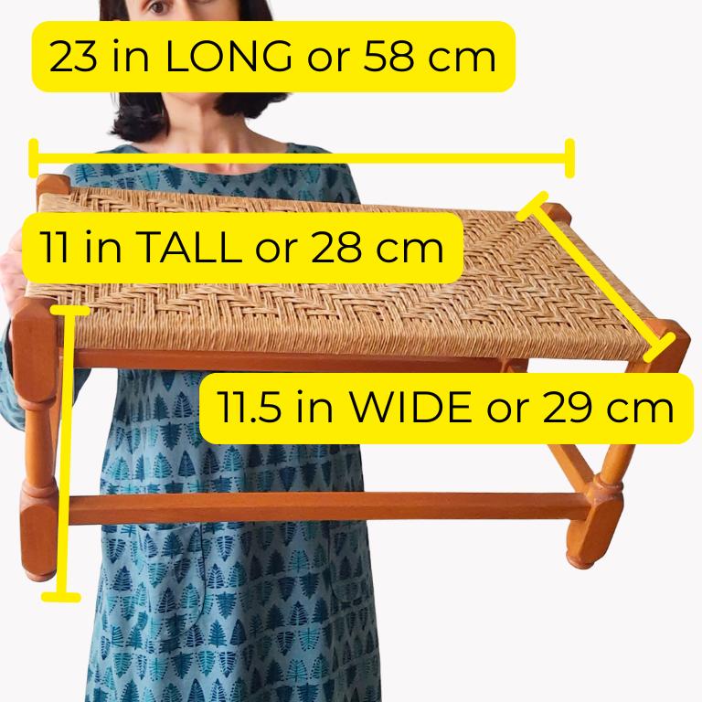 Long Mid Century Wood Rush Stool Woven Seagrass Footstool Very Good Condition 23'' Long