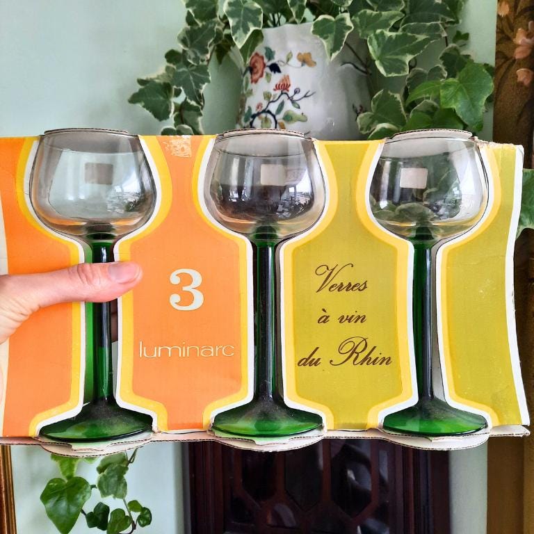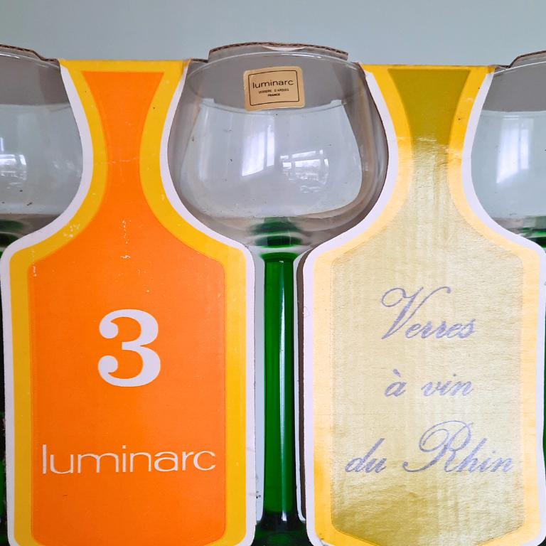 Mid Century Set of 3 Luminarc French Green Straight Stem White Wine Glasses Vintage New Stock