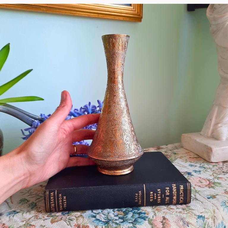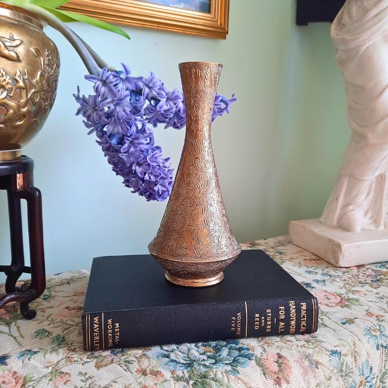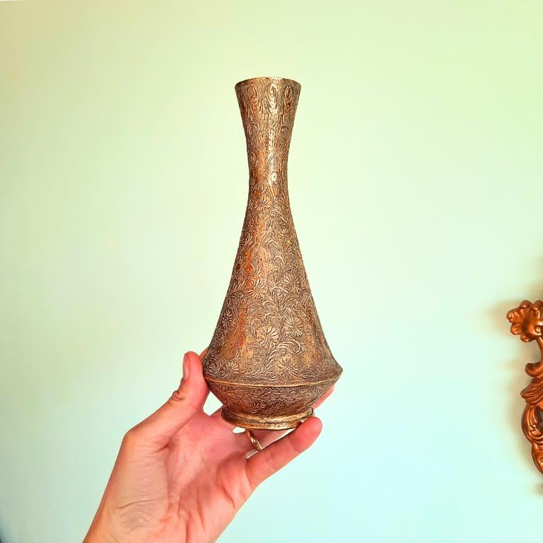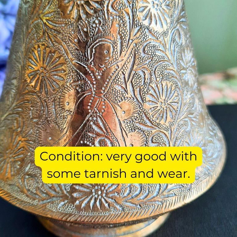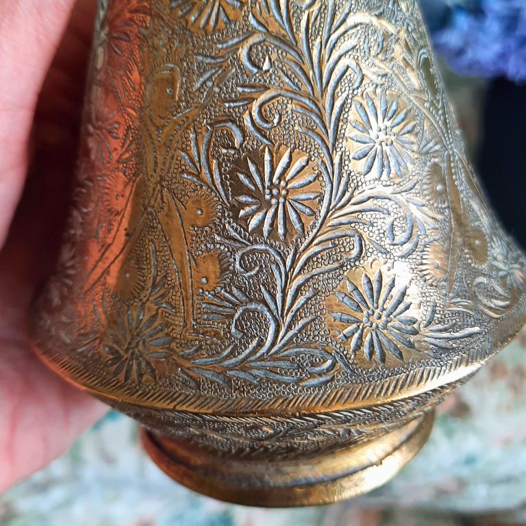 Antique Indian Brass Vase With Engraved Figural Animal and Foliate Decoration.