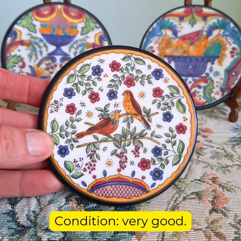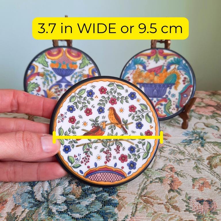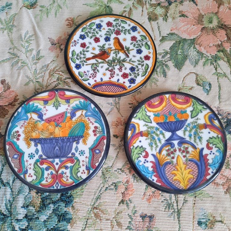 Three Small Spanish Hand Painted Wall Plates With Bird Fruit and Floral Decoration 3.7'' D