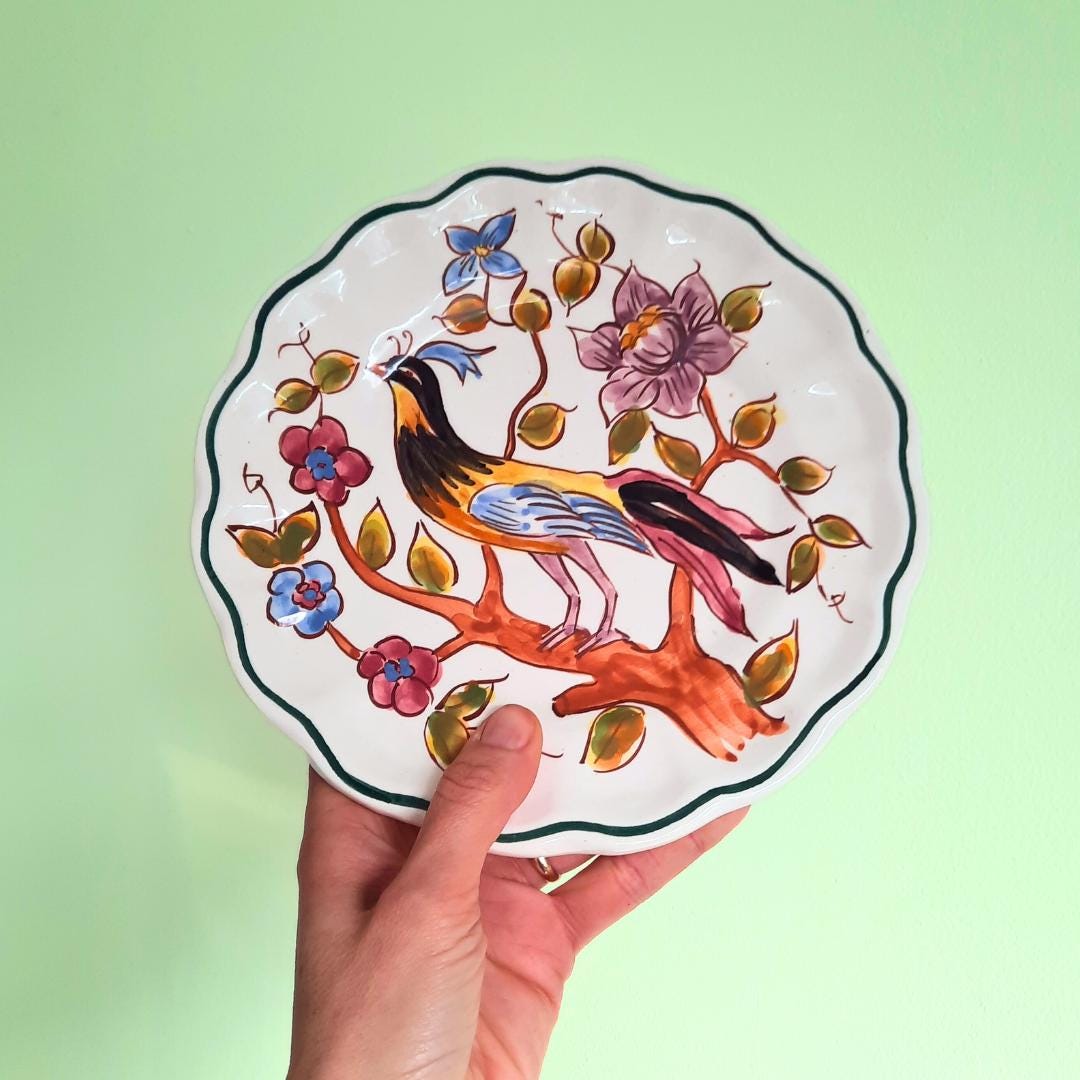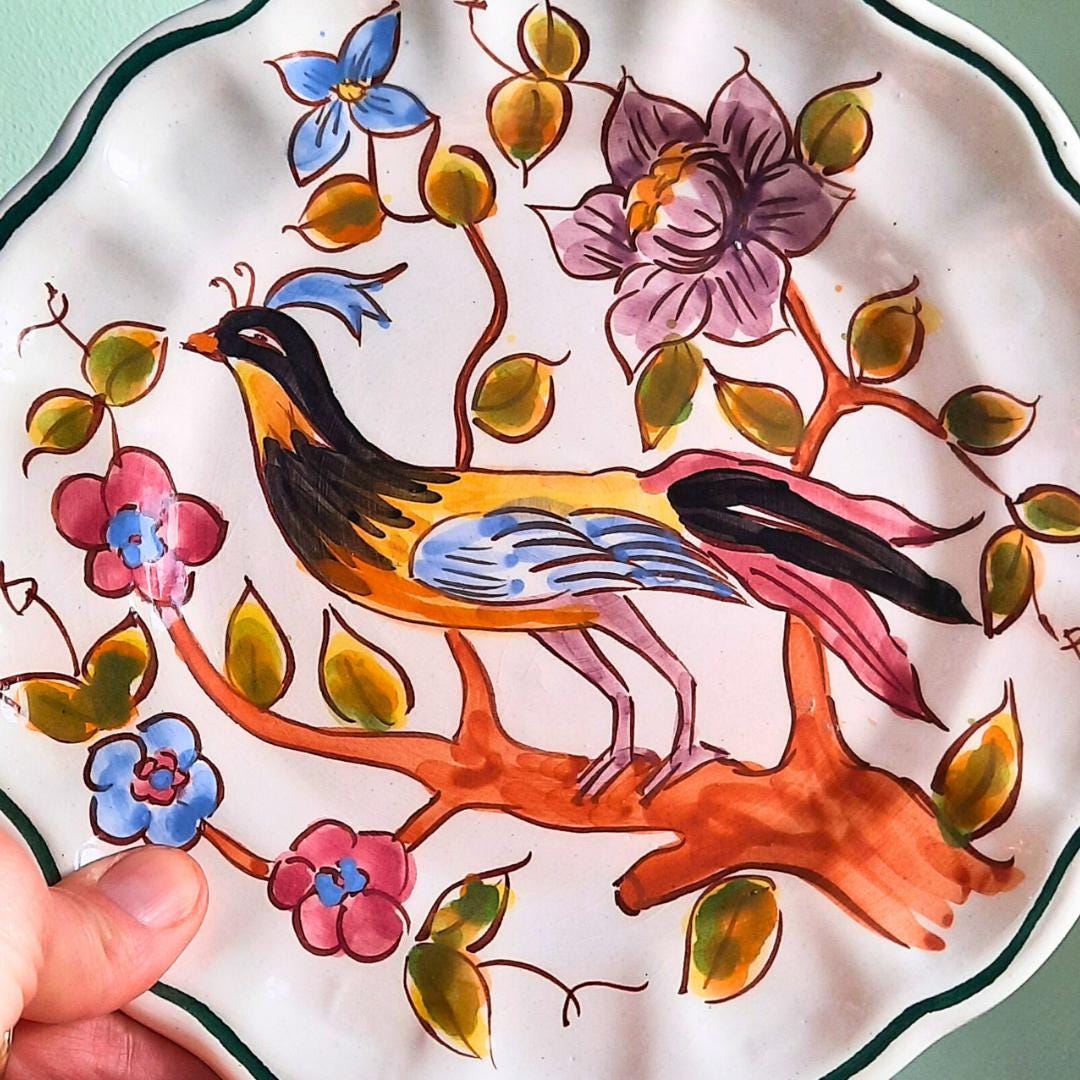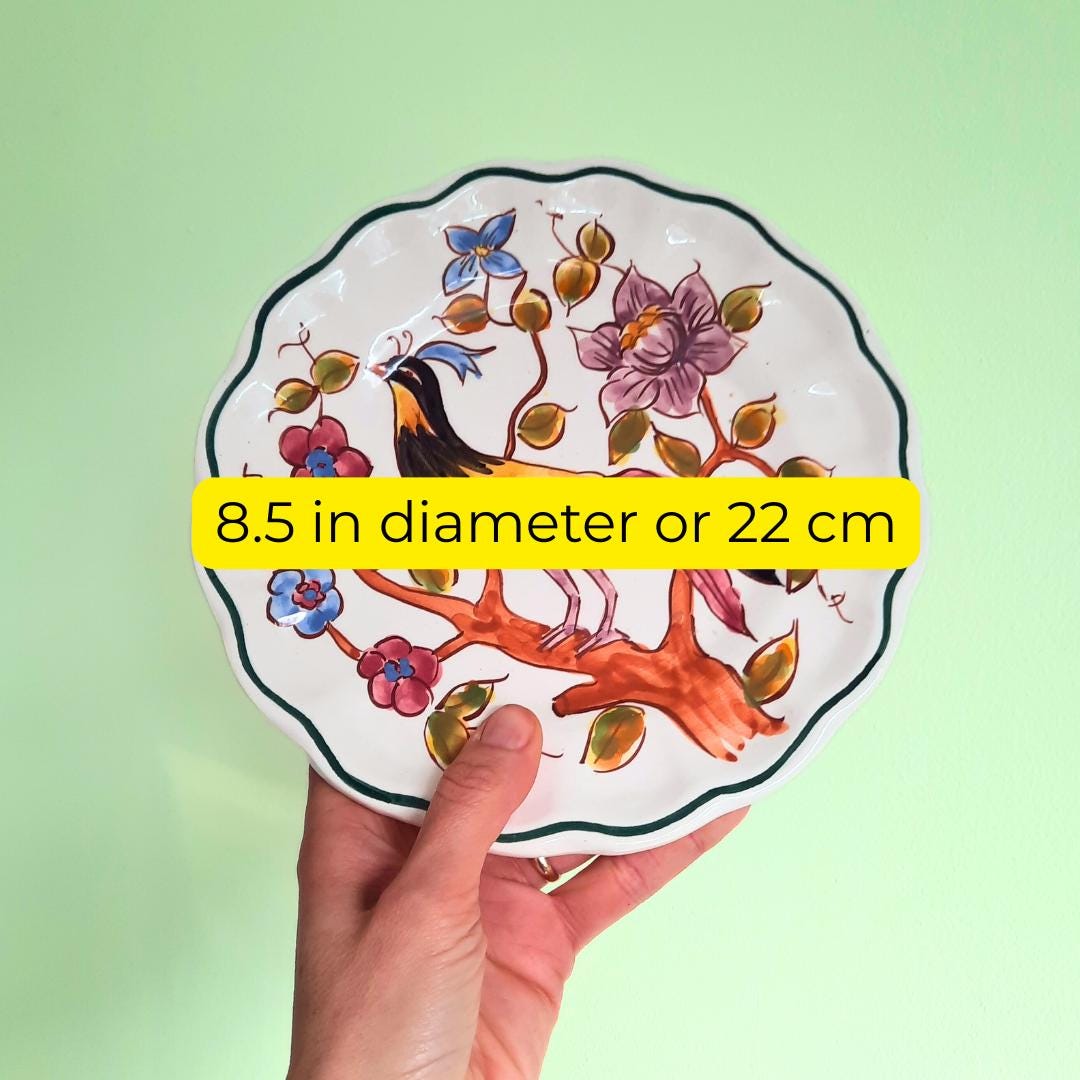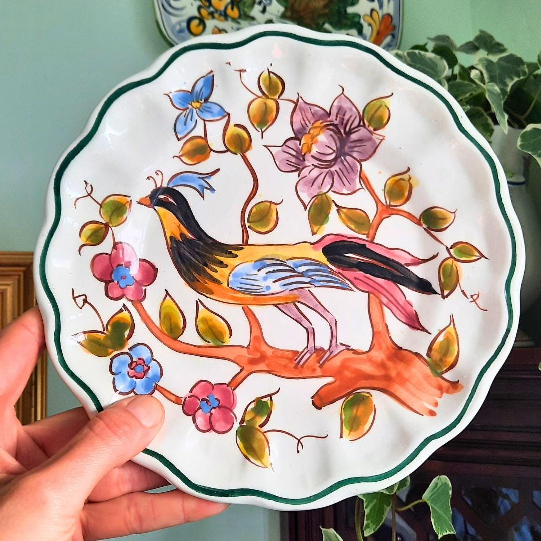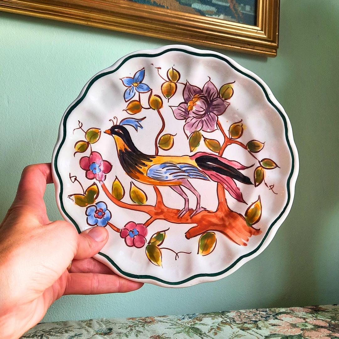 Vintage Spanish Hand Painted Wall Plate With Bird and Floral Decoration D 8.5''