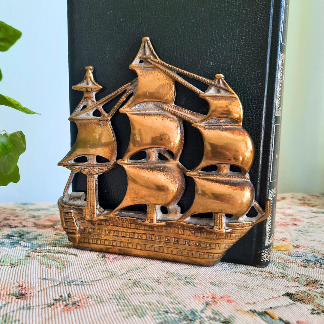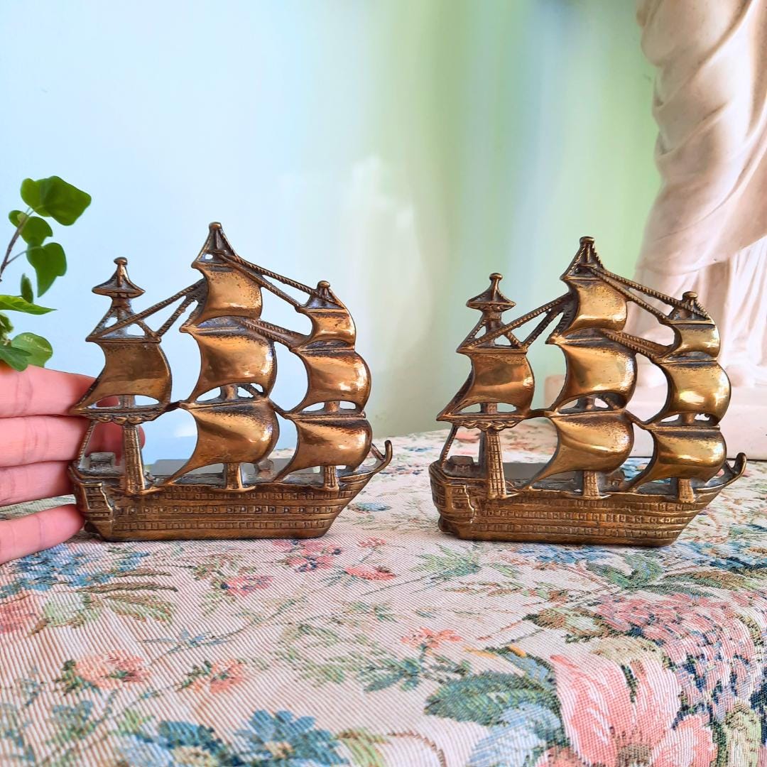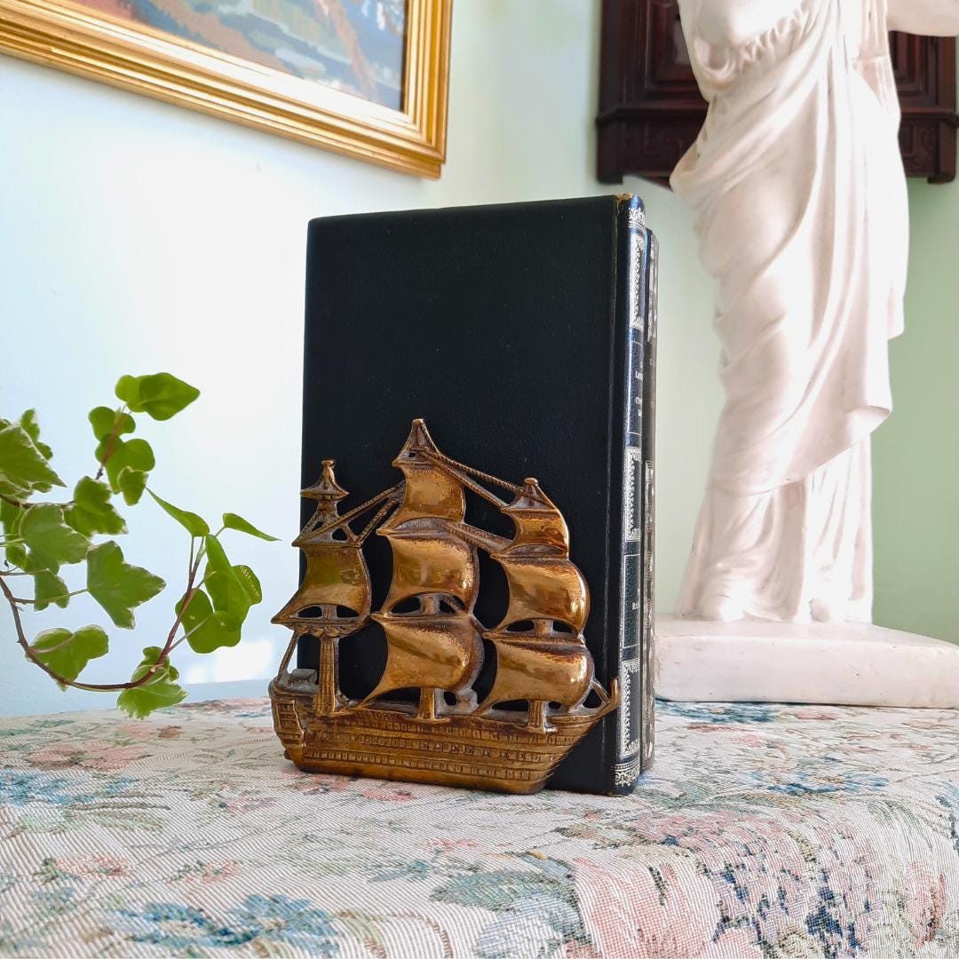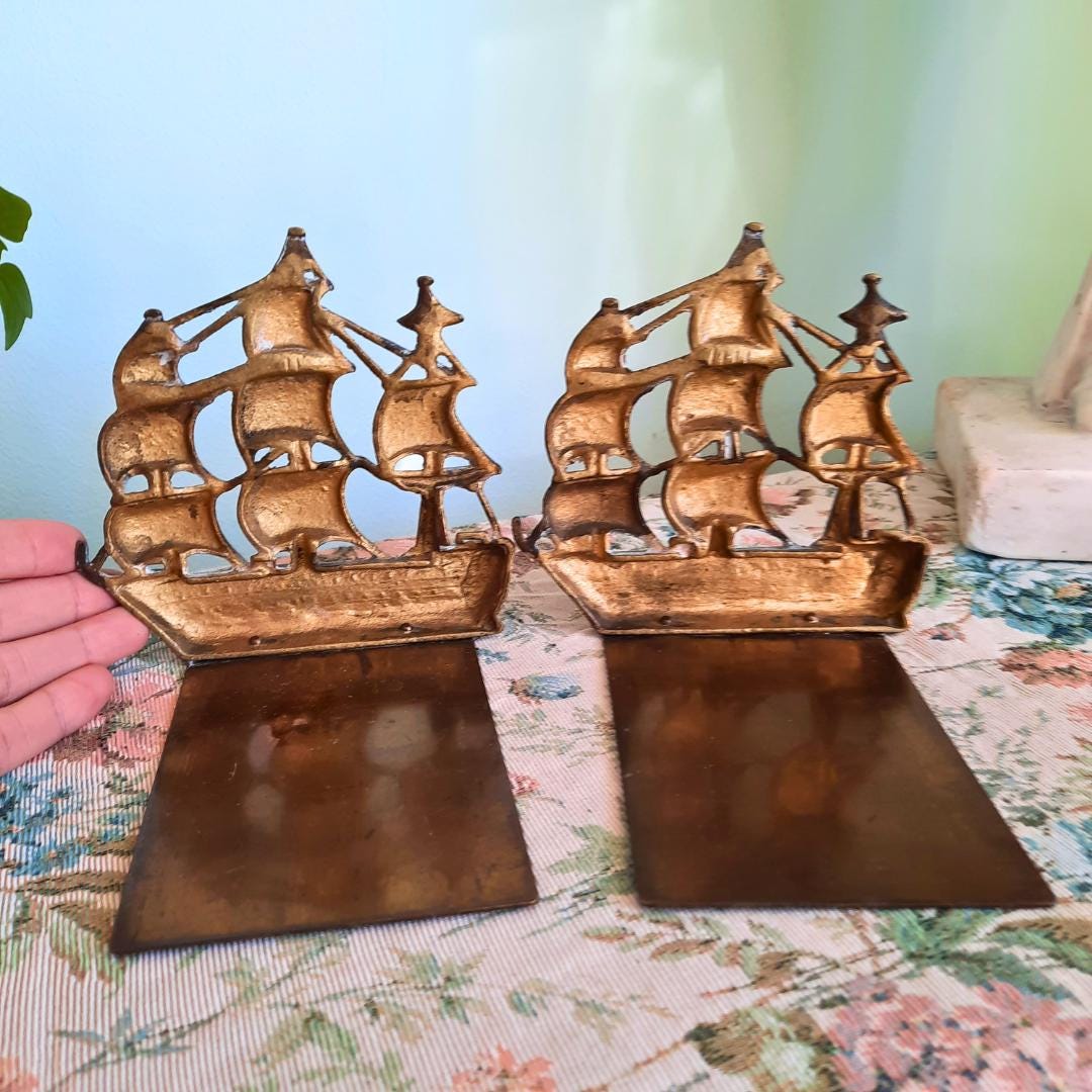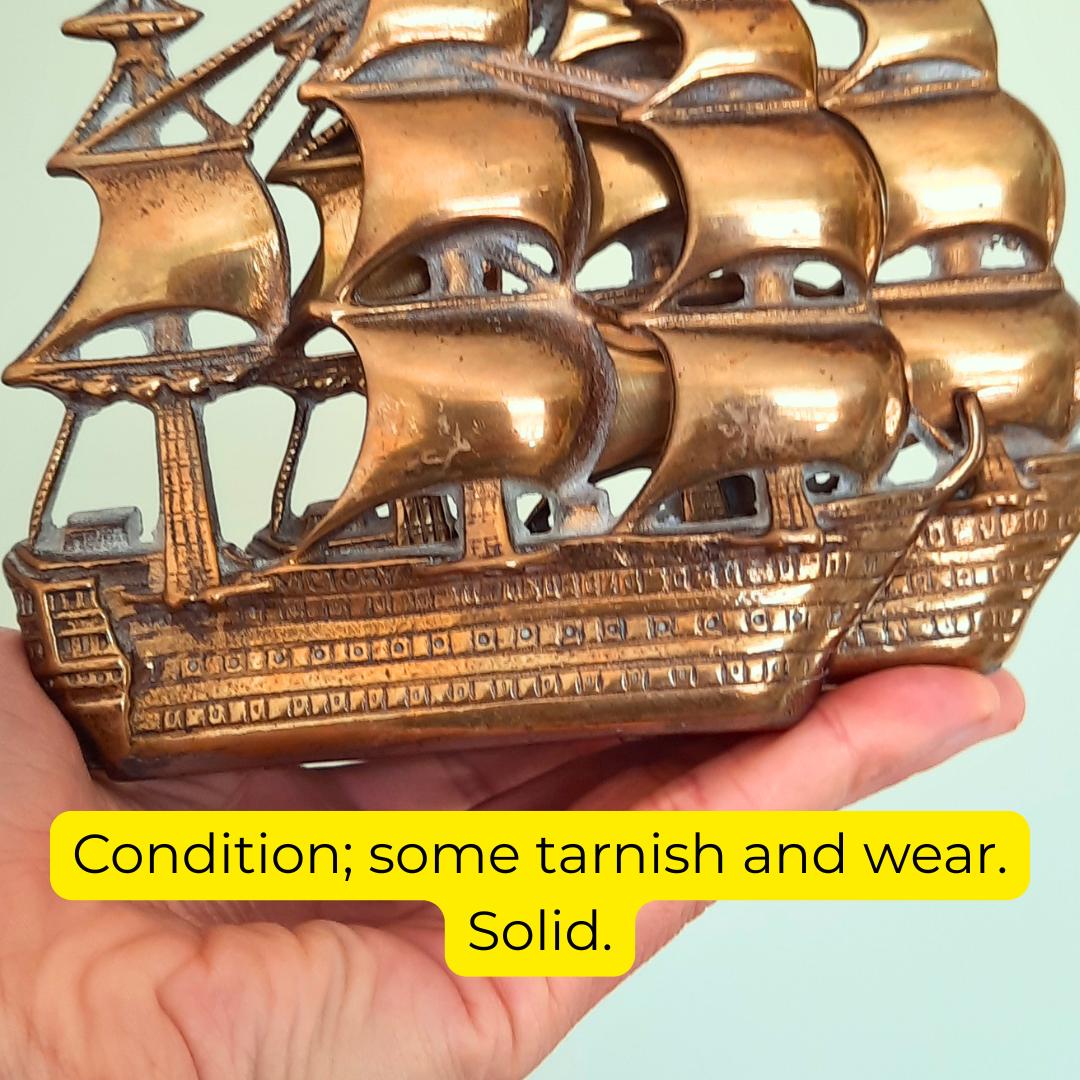 Pair of early 20th century brass bookends, depicting the 18th century first rate ship HMS Victory, best known for her role as Lord Nelson's flagship at the Battle of Trafalgar.