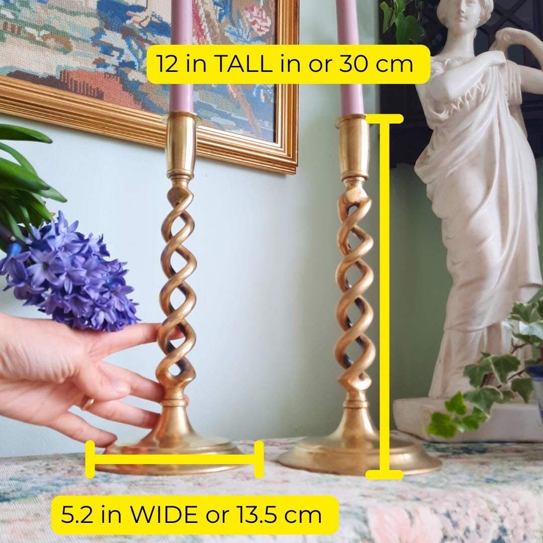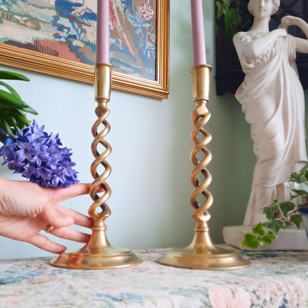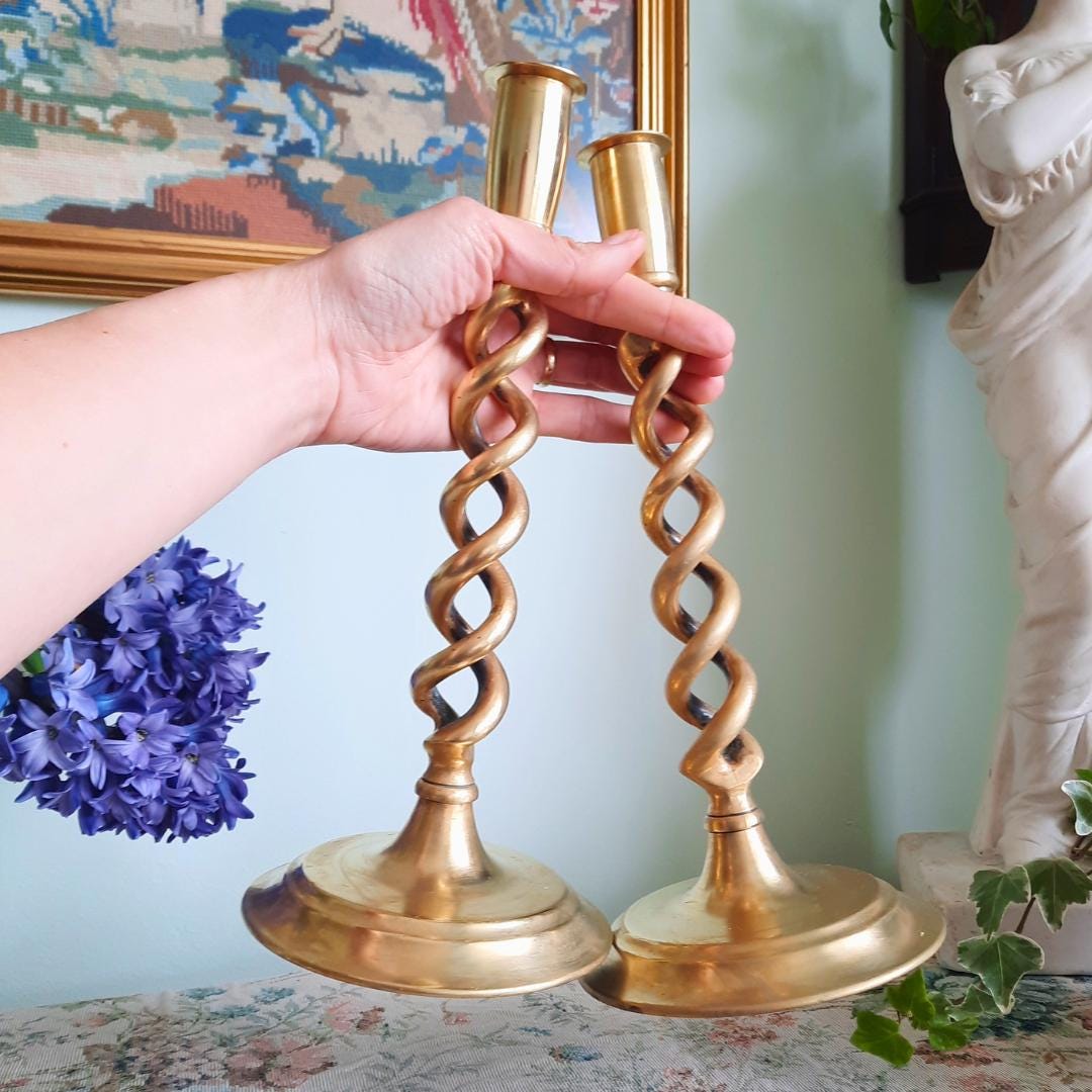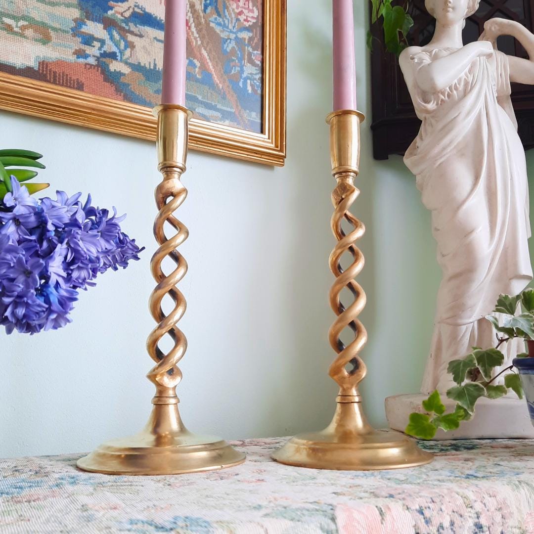 Truly Antique Victorian Open Barley Twist Brass Candle Holder Pair 1800s 12'' Tall