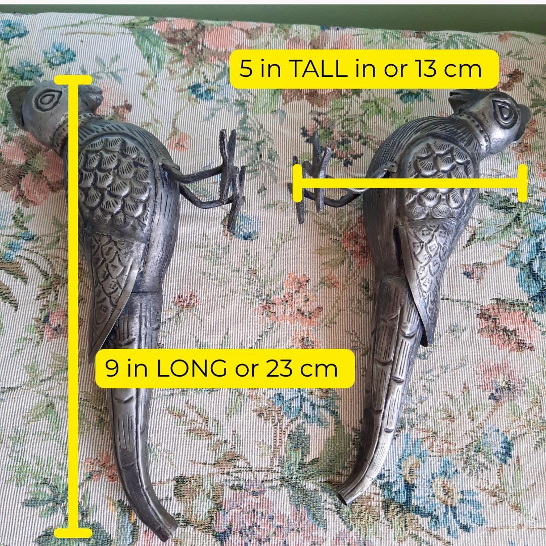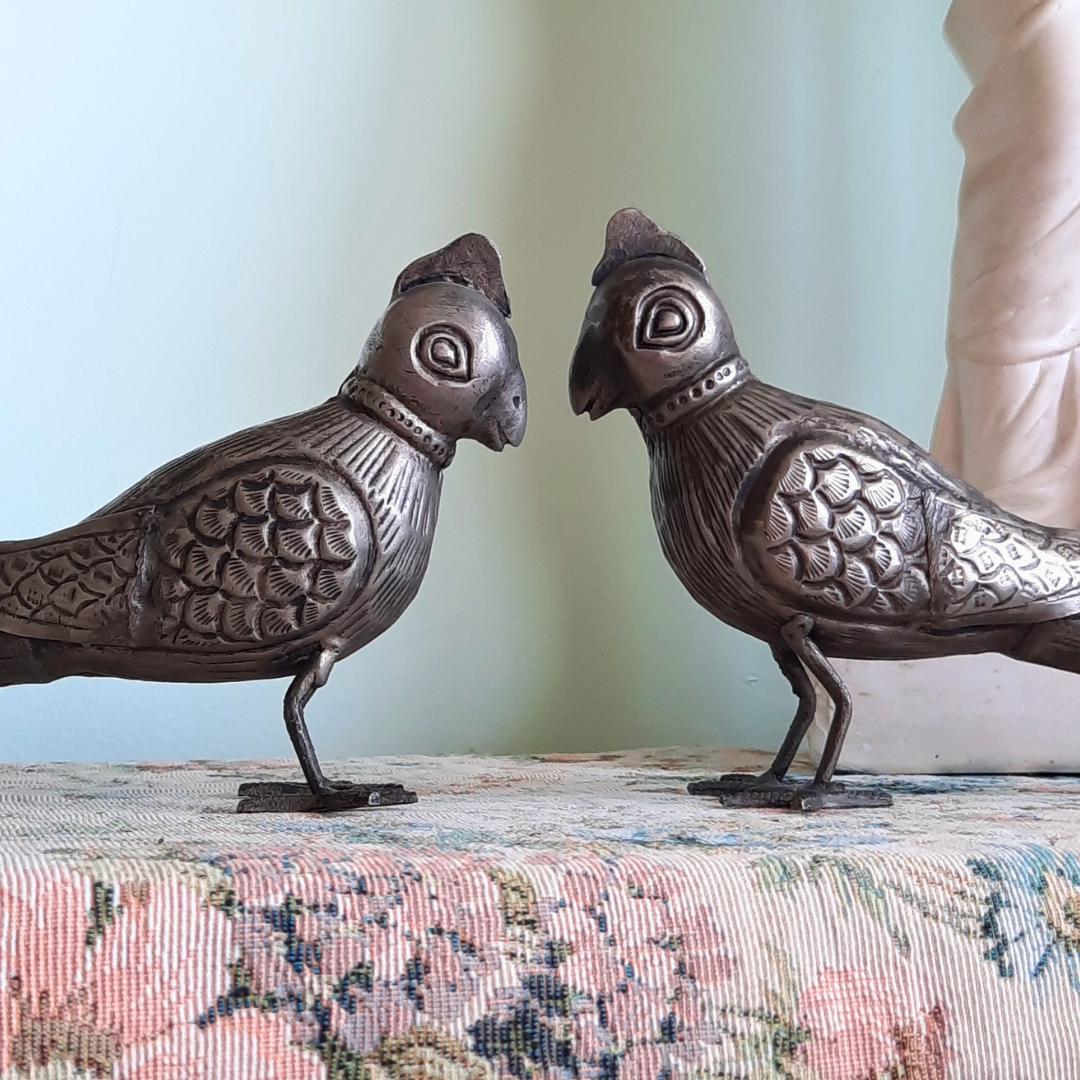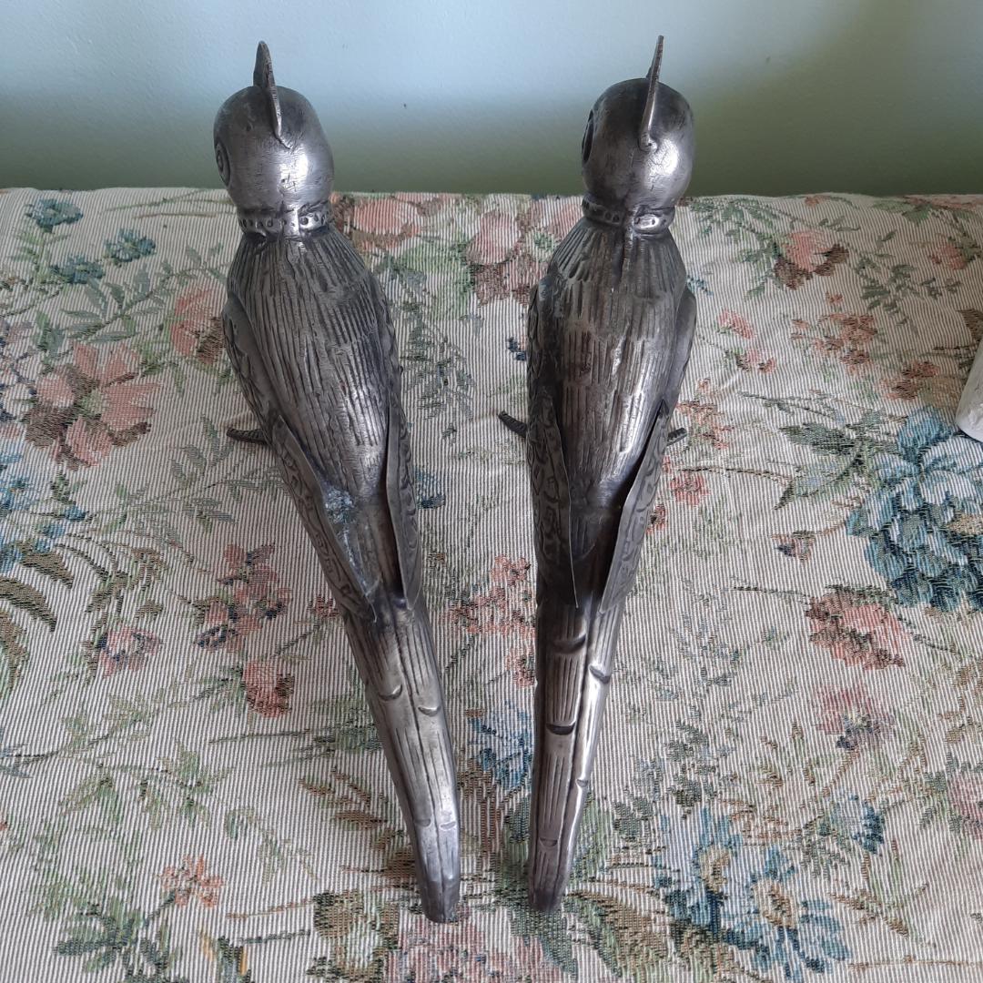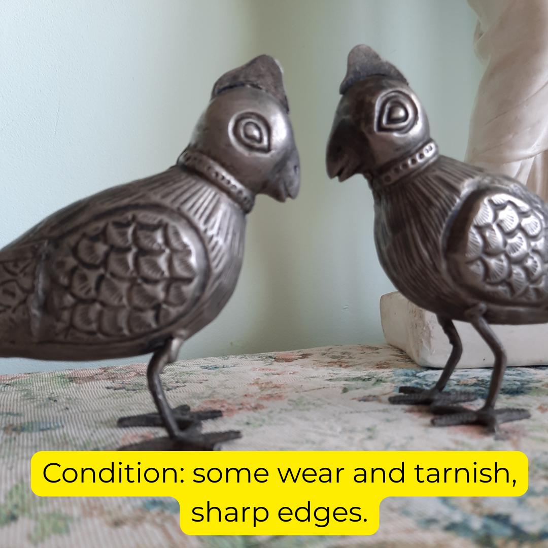 RARE Vintage Pair Of South Indian Handcrafted Tin White Metal Parrots Long 9''