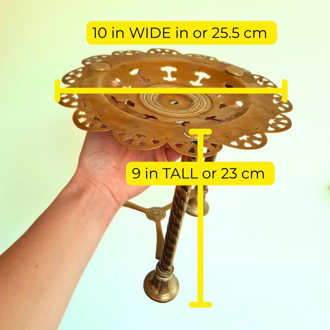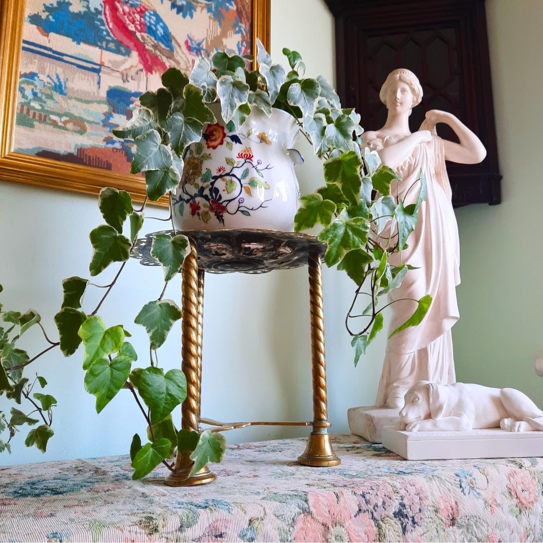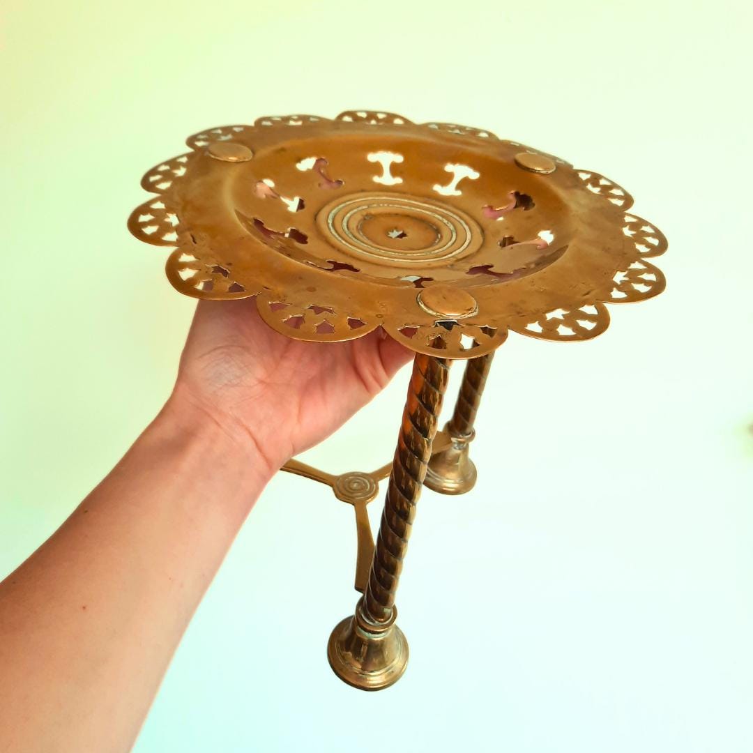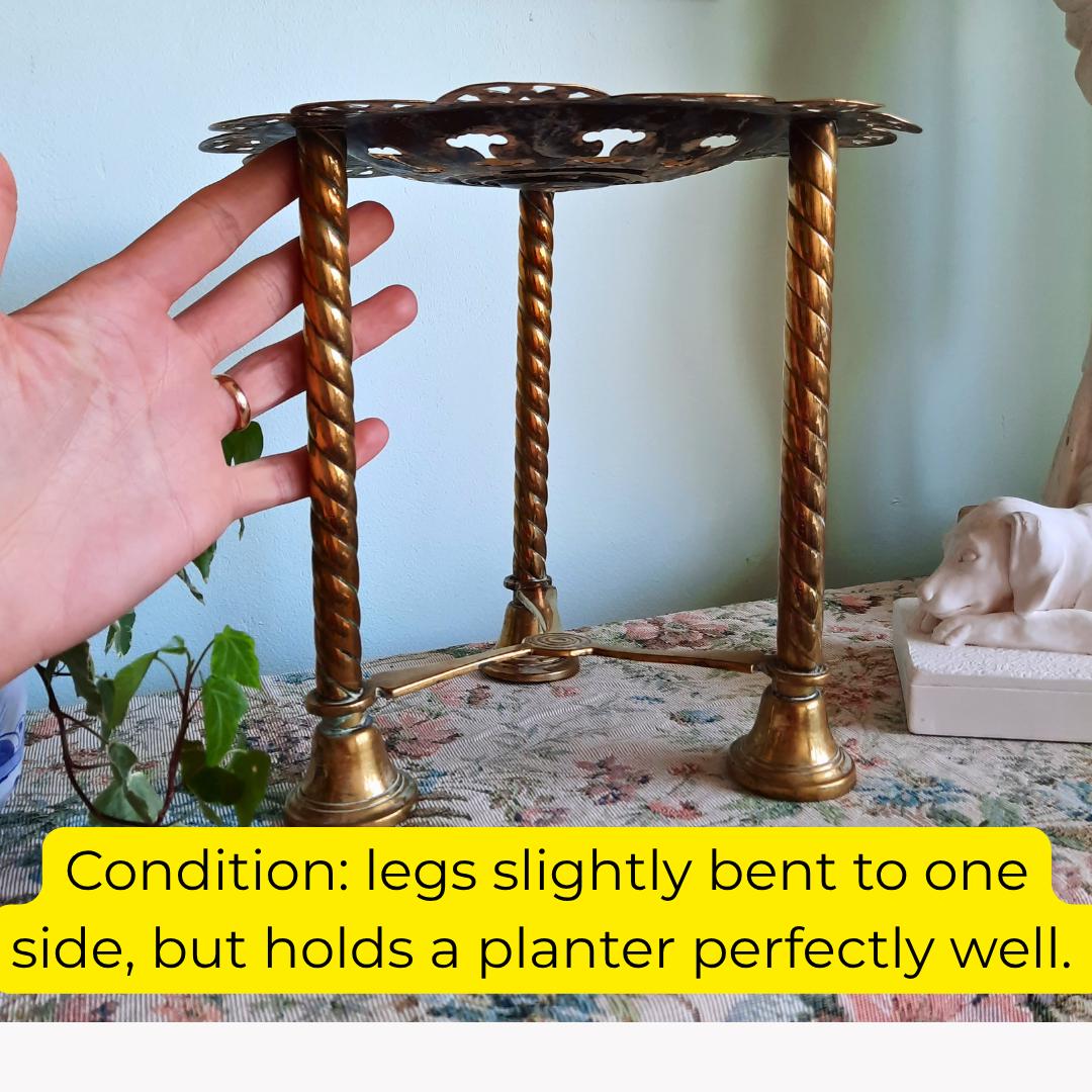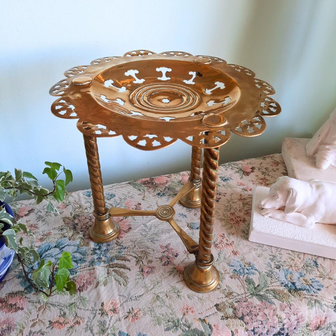 This charming tall plant stand, originally used to rest the kettle by the fireplace, will make a beautiful statement by your fireplace and is perfect for displaying plants or books. Crafted from solid brass.