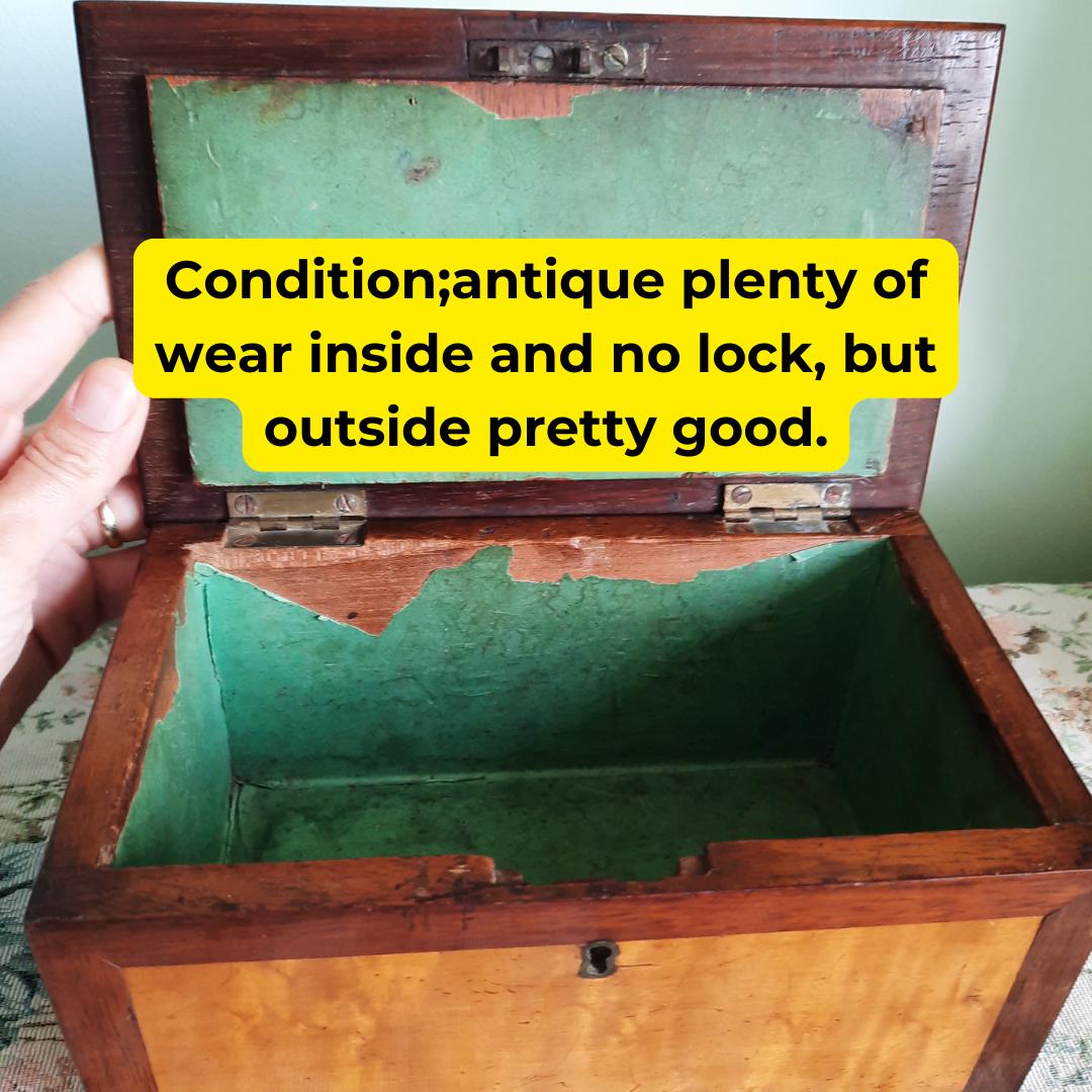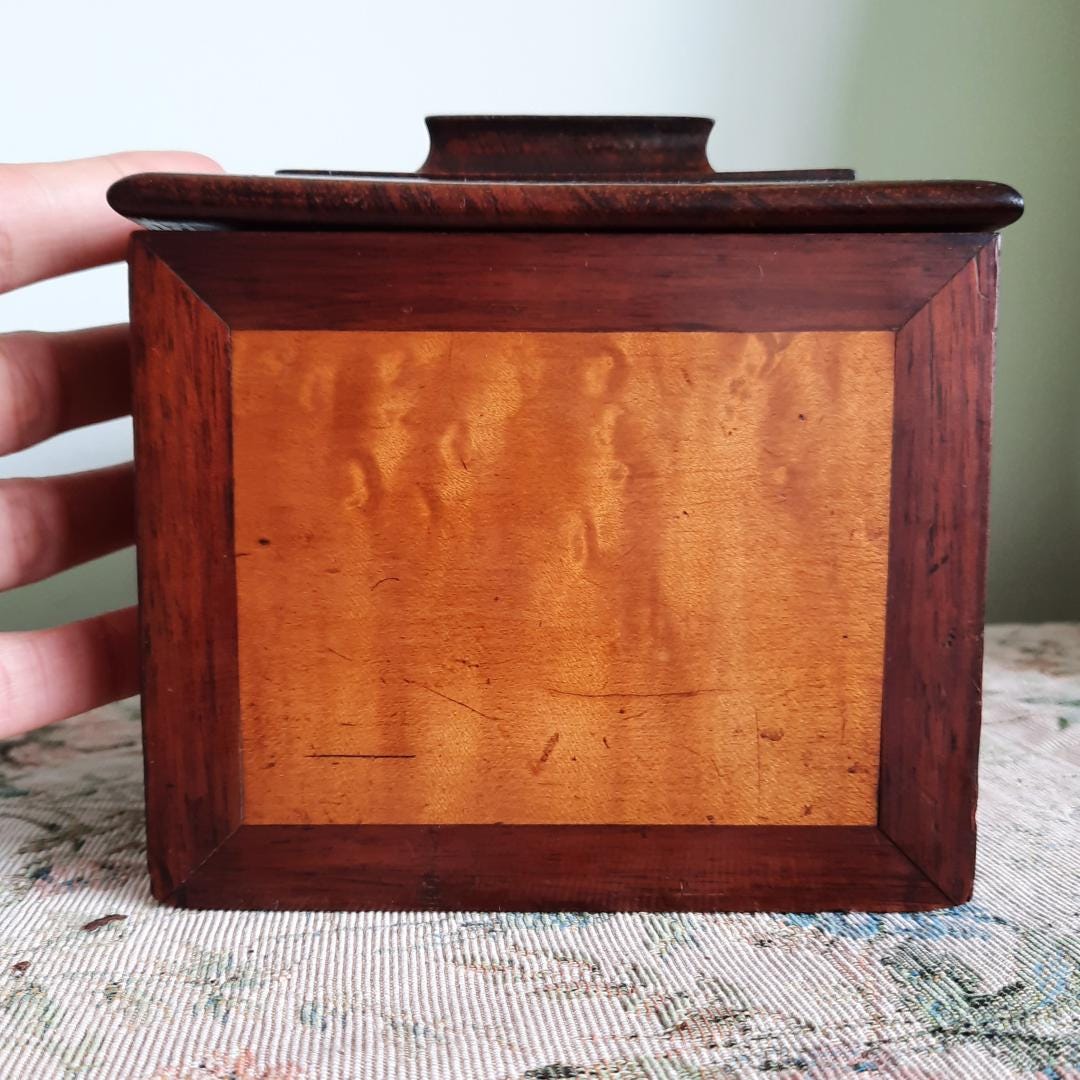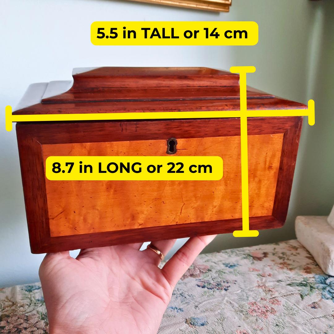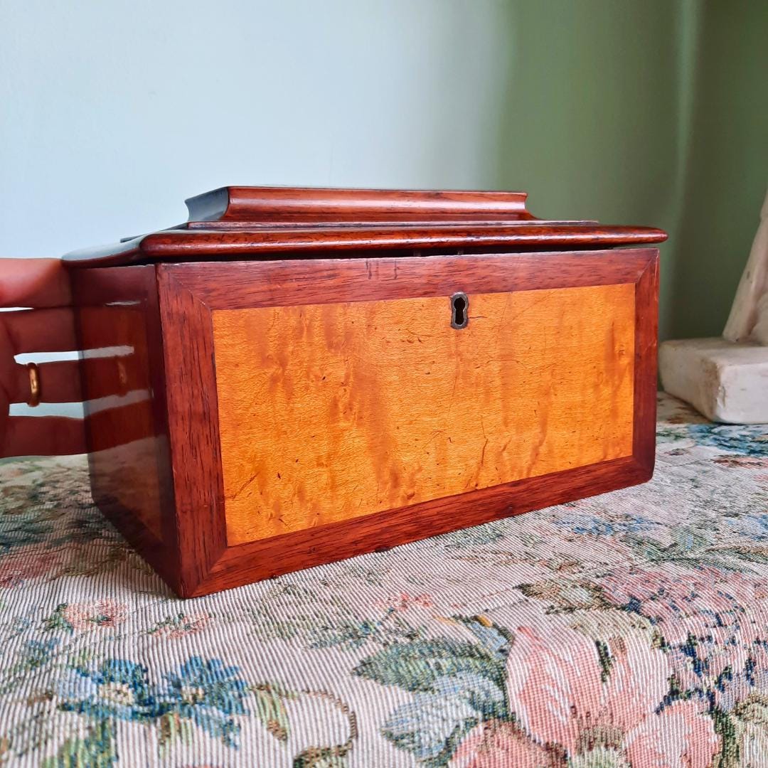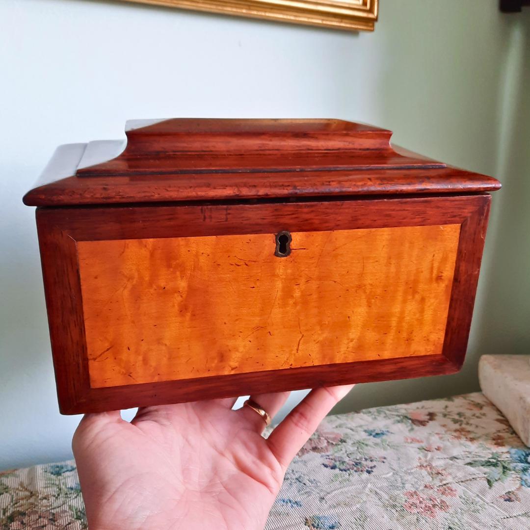 Very attractive antique English wooden box shaped like a sarcophagus which was originally a tea caddy with compartments and at some point turned into a jewellery box.