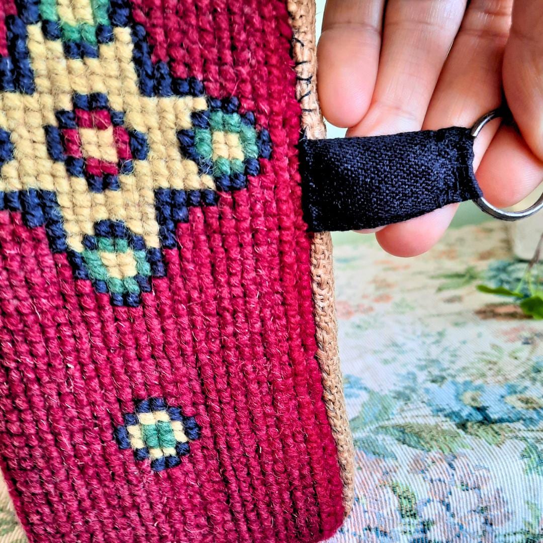 Handcrafted from natural fibers; wool probably and with a lovely geometric pattern and amazing colours.