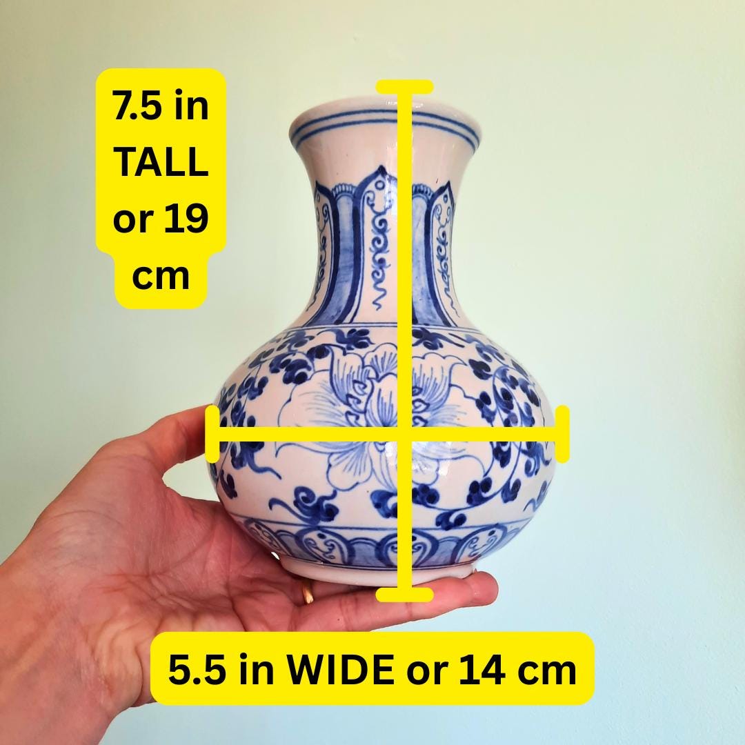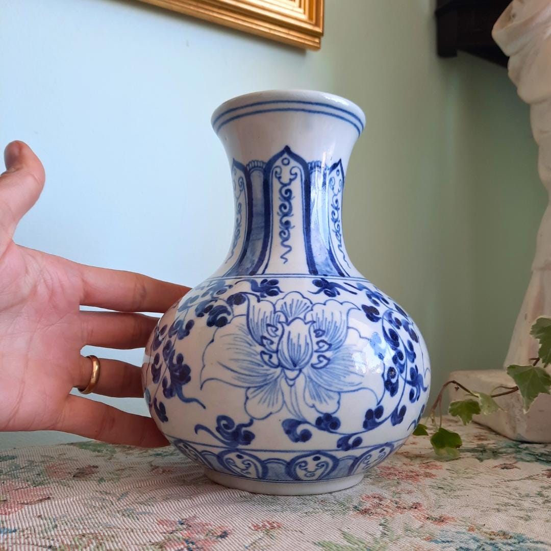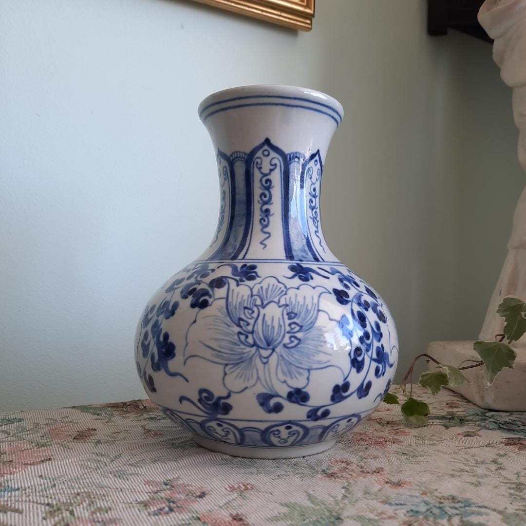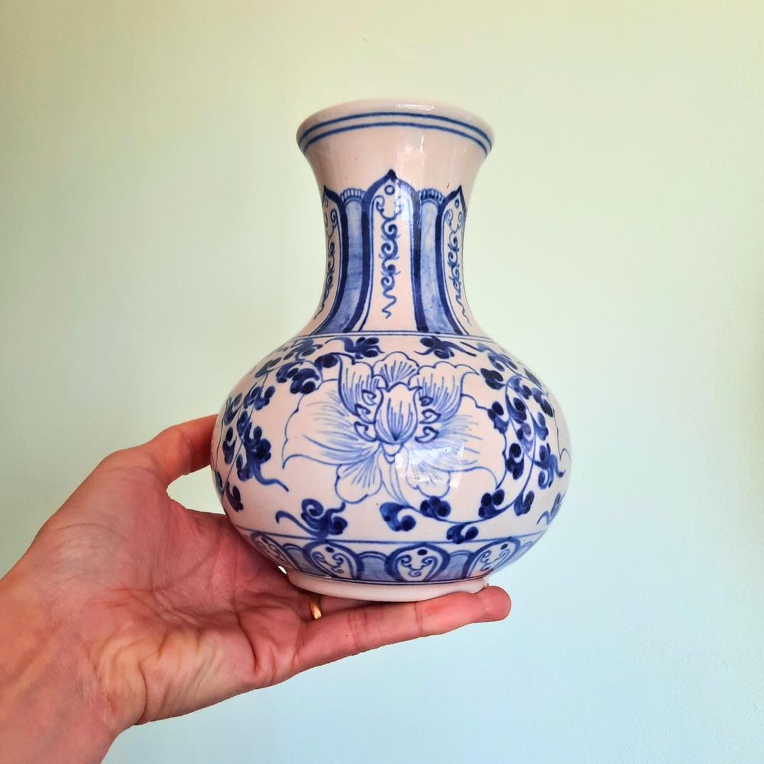Vintage Chinese Ceramic Blue And White Hand-Painted Floral Vase 7.5'' Tall
