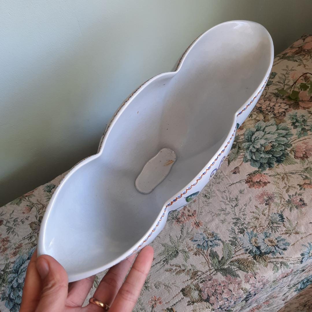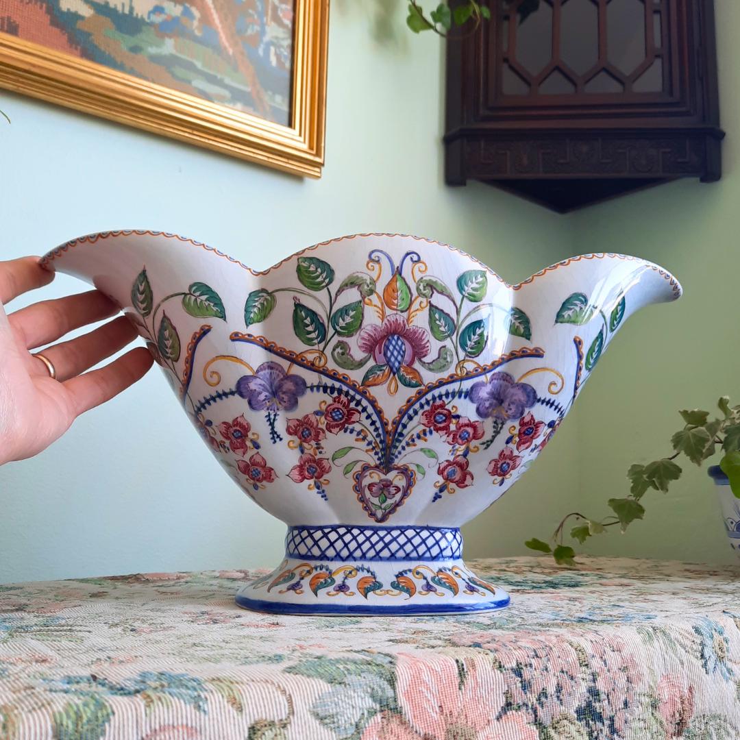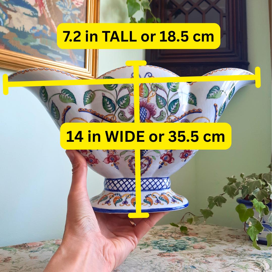 Large Mid Century Carvalhinho Portuguese Hand Painted Floral Scalloped Pedestal Centrepiece Bowl C 1940's.
