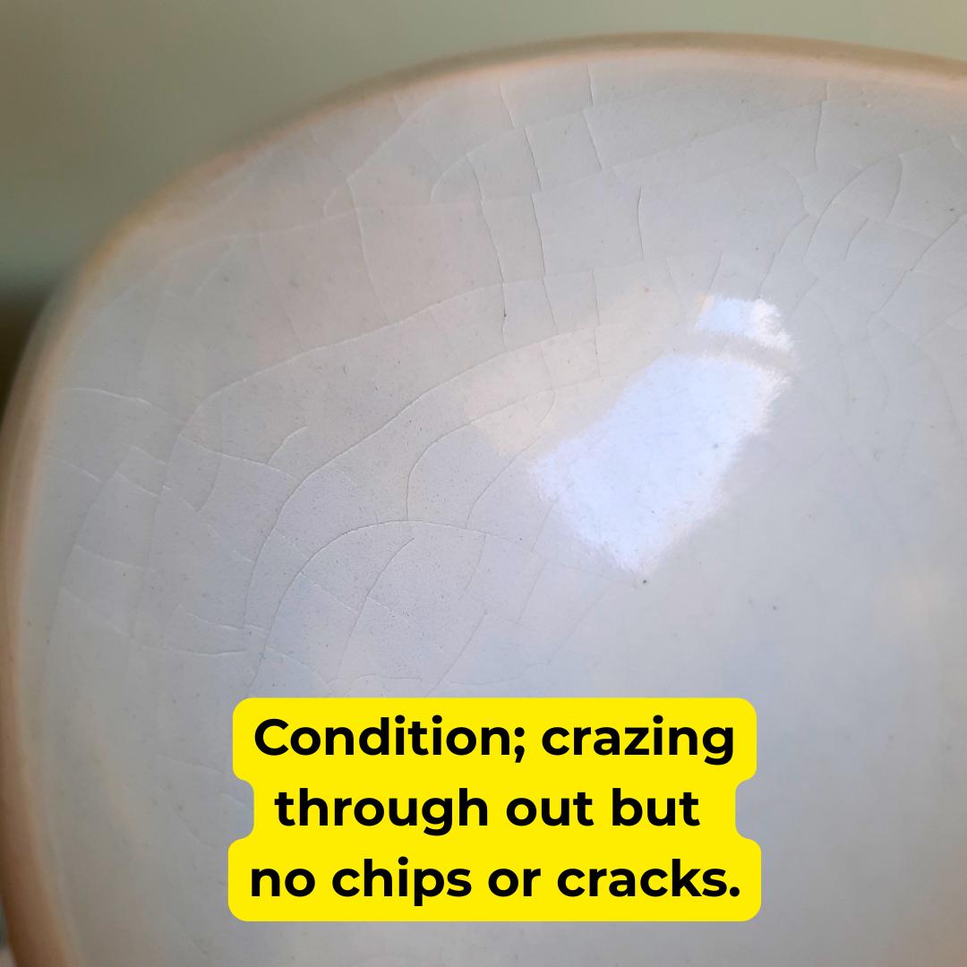 In good condition apart from crazing through out. Avoid running under water. Clean instead, if needed, with damp cloth.