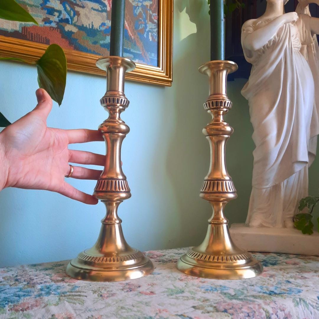 Tall and Chunky Antique Victorian Brass Candle Holders Pair 1800s H 12.2'' Made In England.
